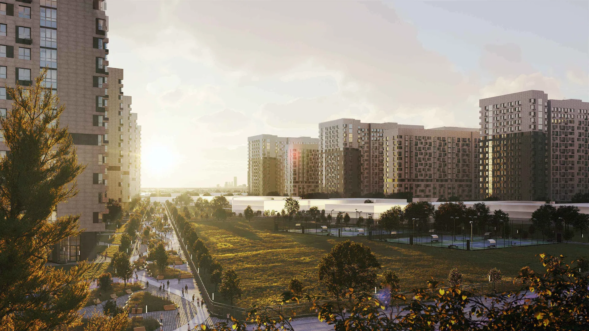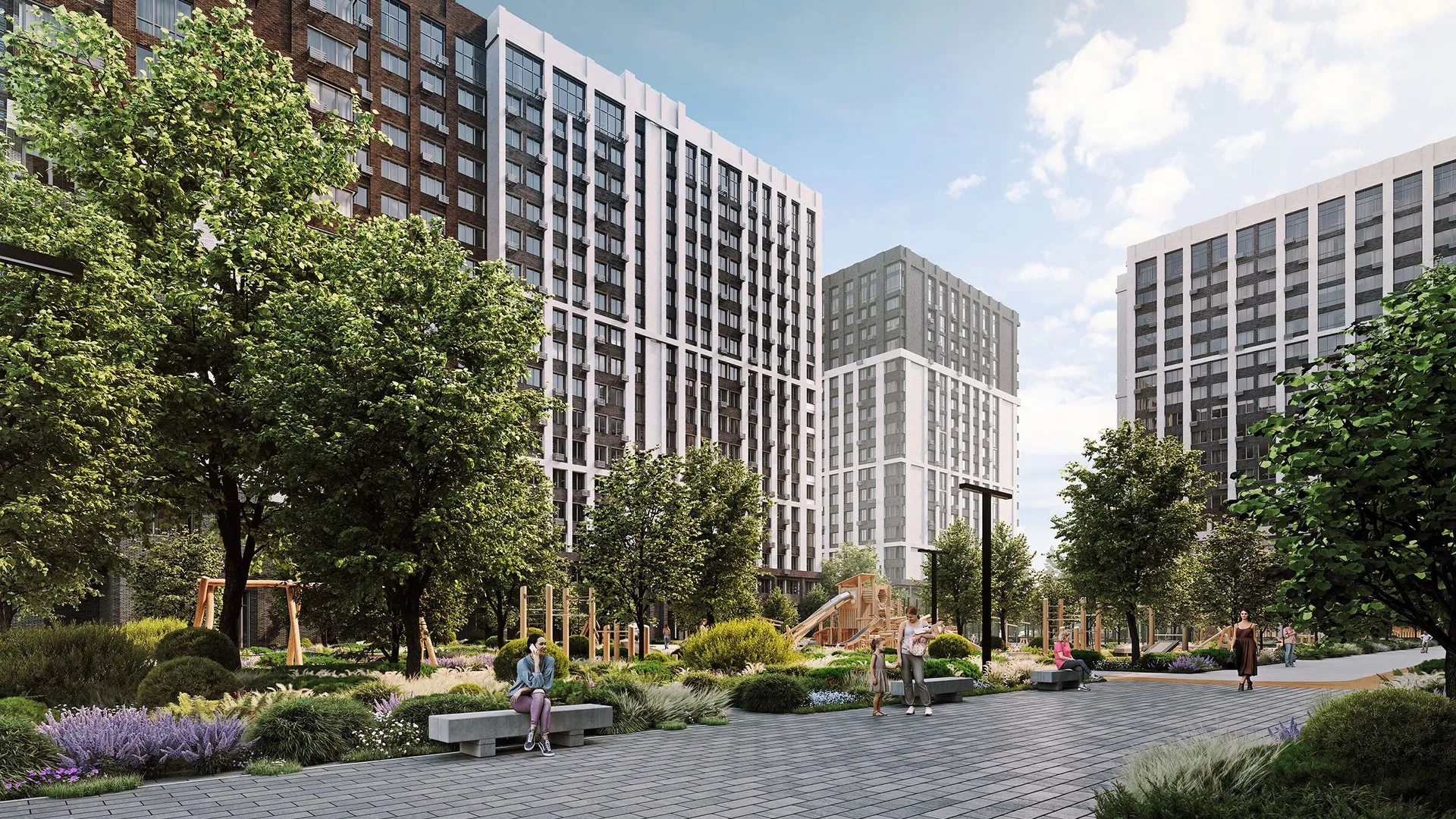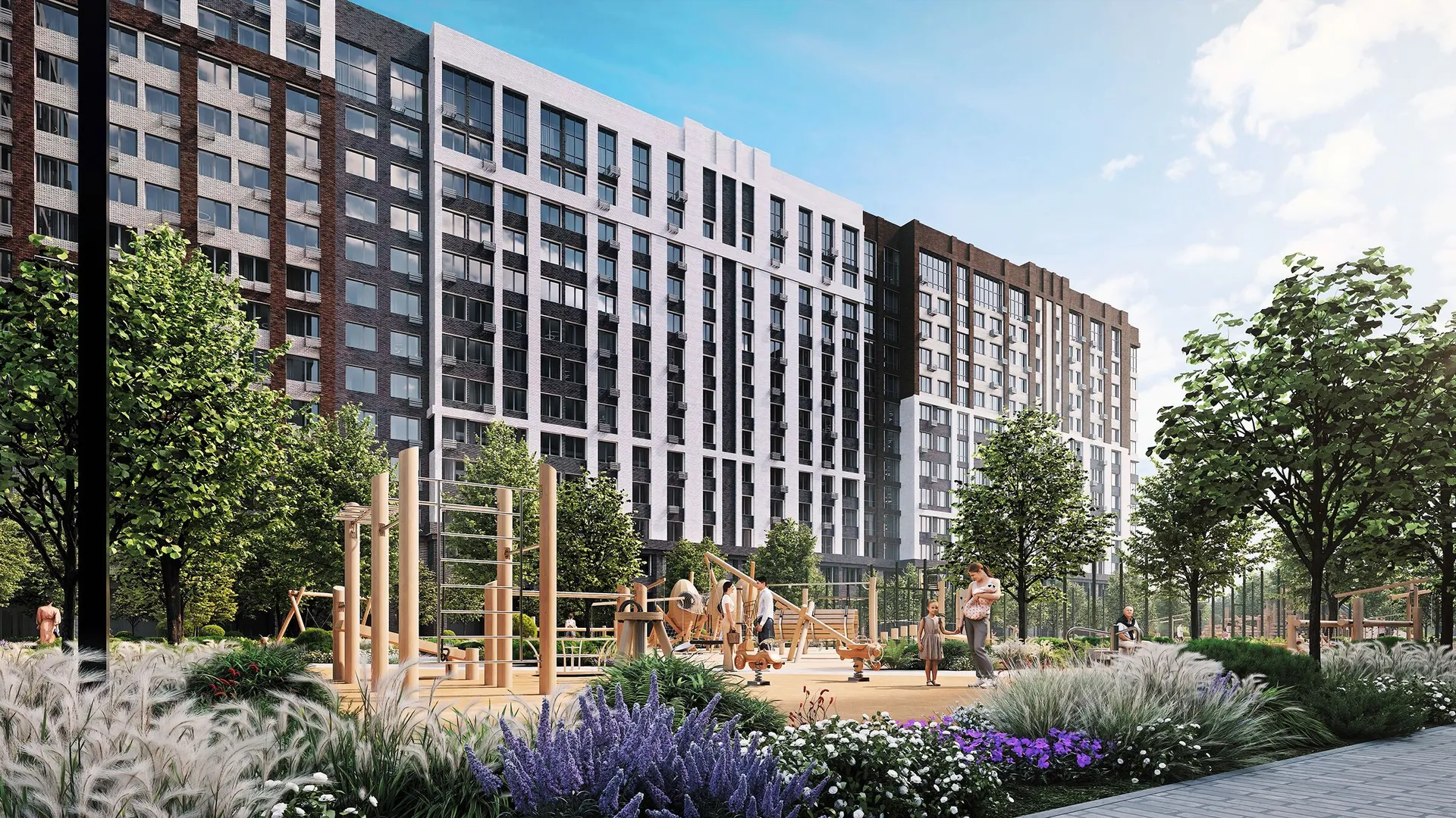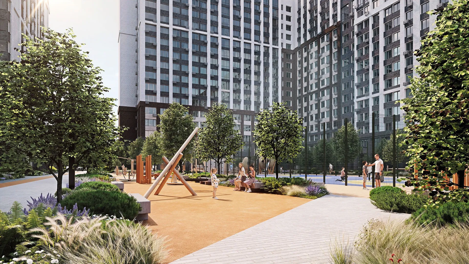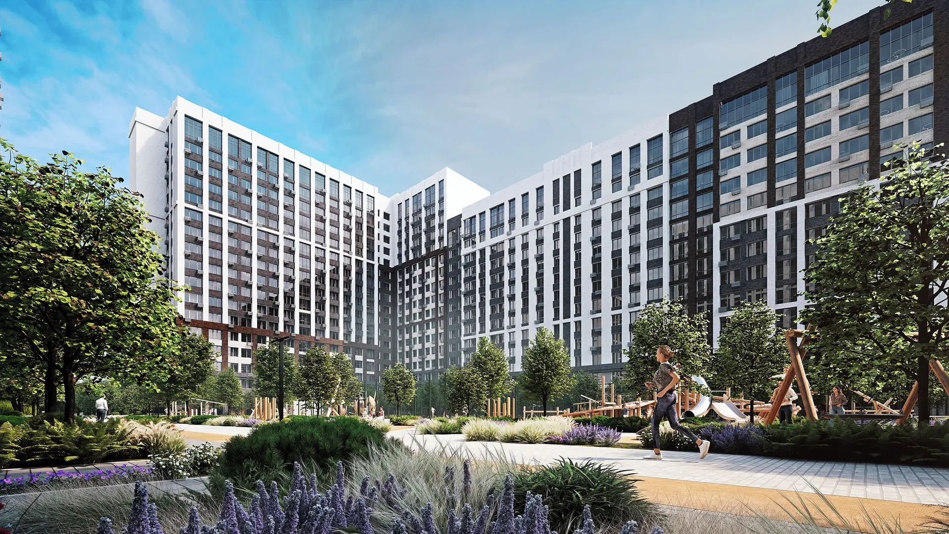 Территория комплекса будет благоустроена: запланированы ландшафтный парк с озеленённым пешеходным бульваром и велодорожками, детские и спортивные площадки (воркаут, йога, игровые поля), места для отдыха с садовыми качелями и беседками, а также отдельная лужайка для выгула собак. Дворы будут закрытыми, без проезда автомобилей.