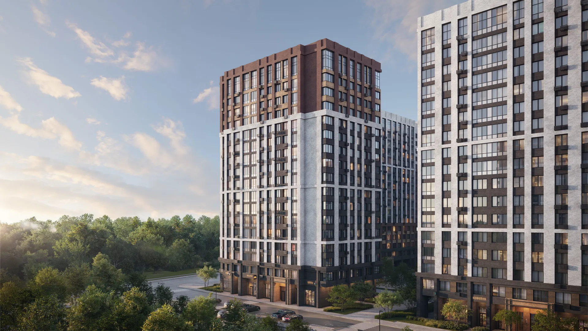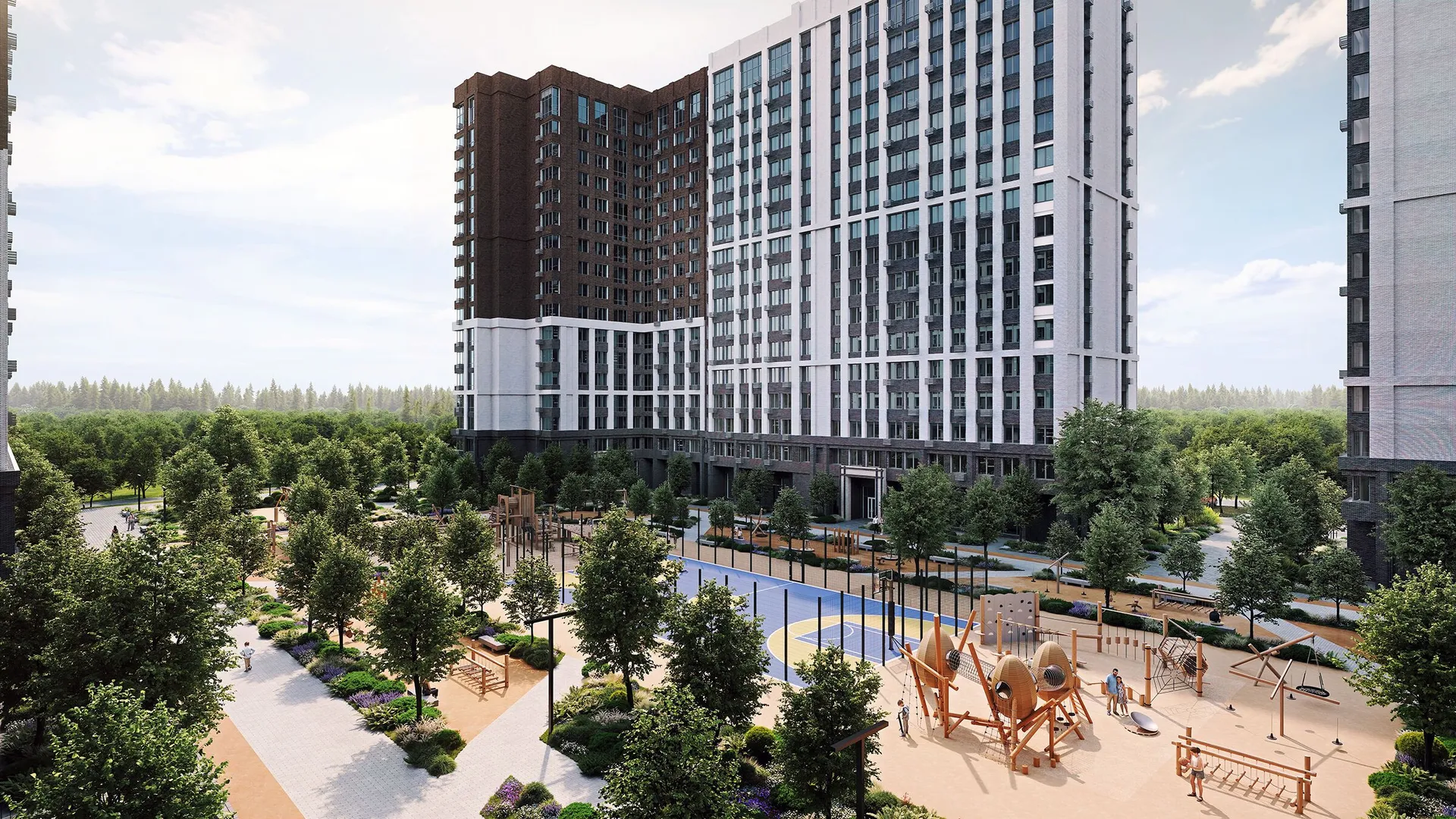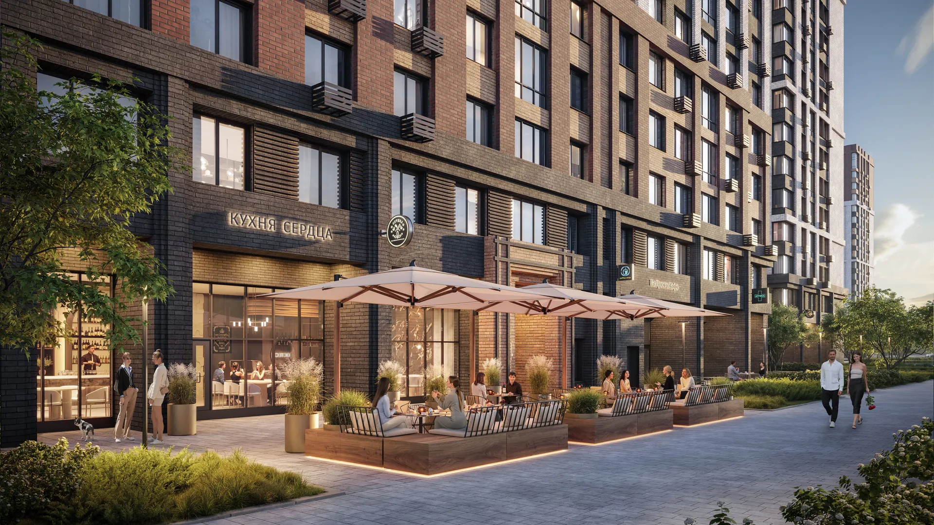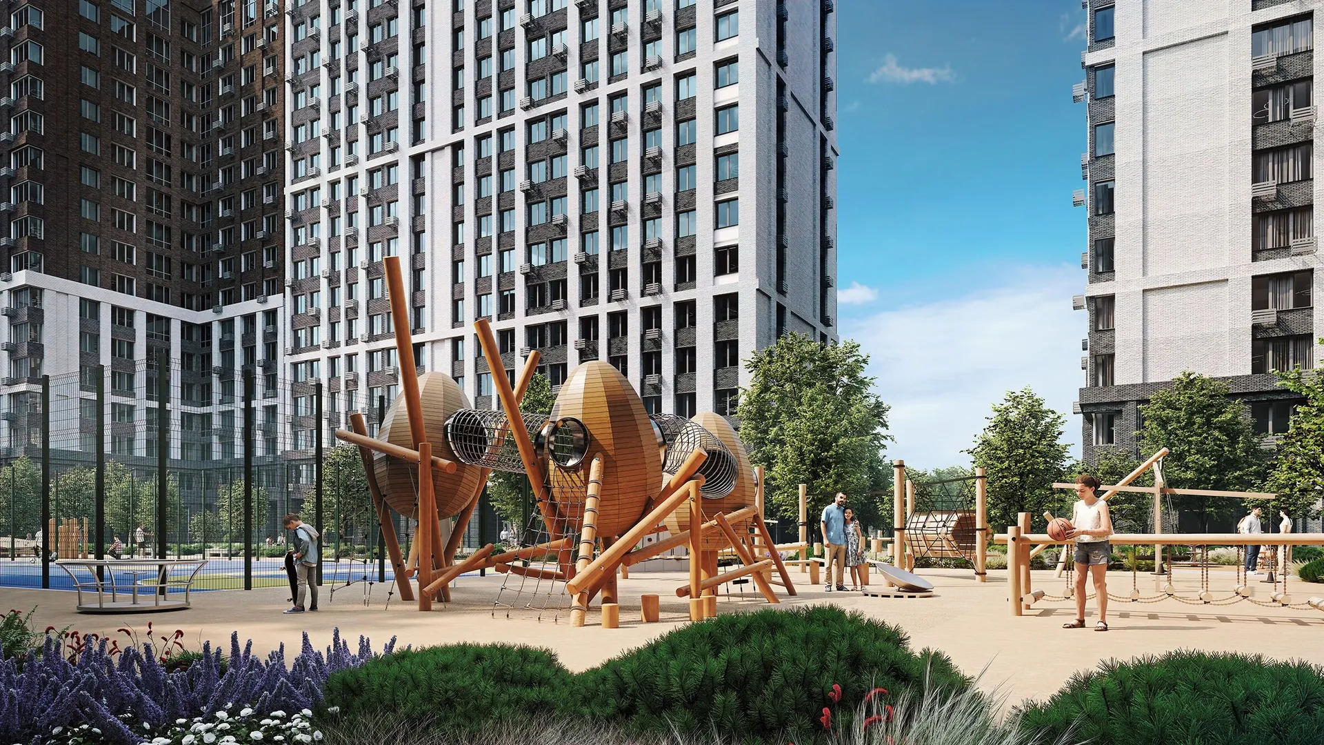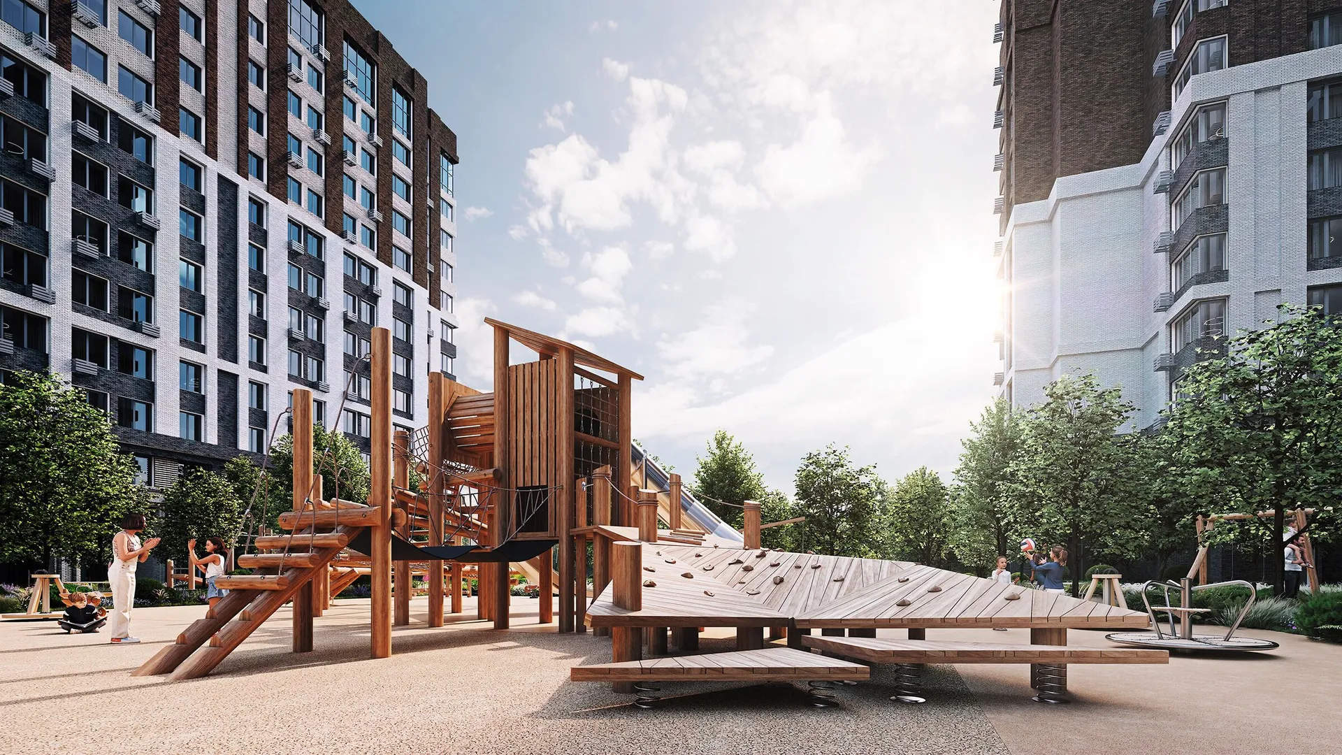 Территория комплекса будет благоустроена: запланированы ландшафтный парк с озеленённым пешеходным бульваром и велодорожками, детские и спортивные площадки (воркаут, йога, игровые поля), места для отдыха с садовыми качелями и беседками, а также отдельная лужайка для выгула собак. Дворы будут закрытыми, без проезда автомобилей.