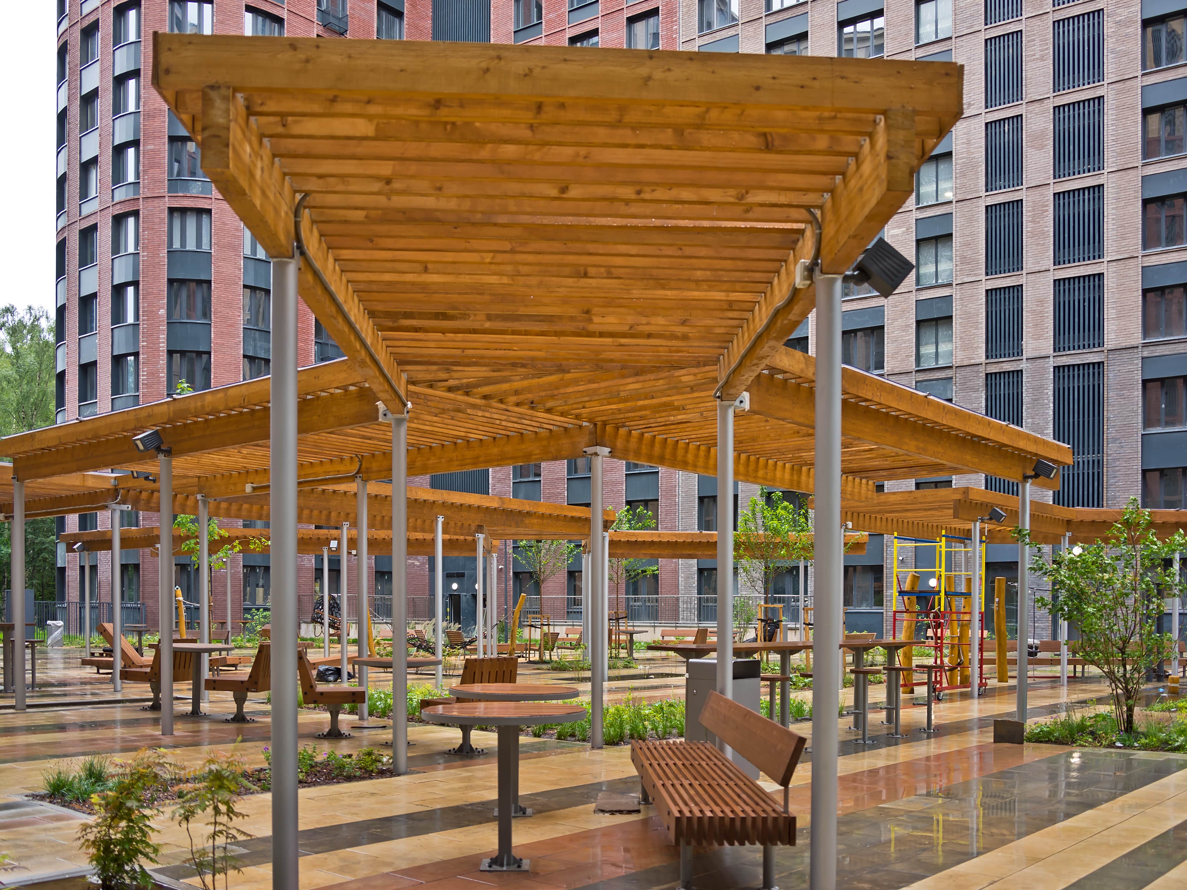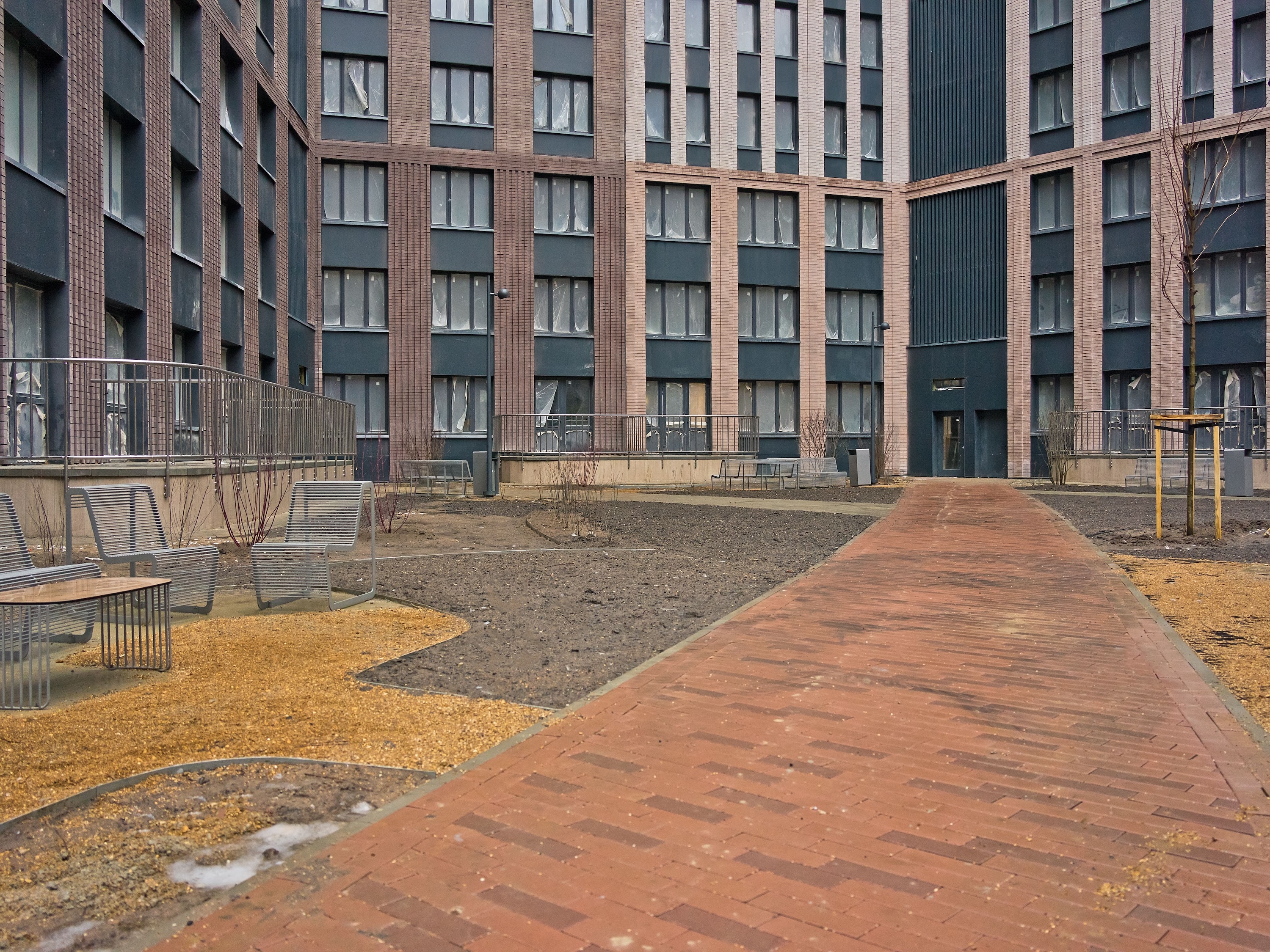 На внутренней территории проекта будет реализована концепция «двор-парк», которая предполагает густое и разнообразное озеленение, создание мест для отдыха и прогулок, организацию пространства для работы на свежем воздухе. Здесь также появится площадь для общественных мероприятий. А вот привычных детских площадок не будет. Для игр детям будут предложены участки с необычным ландшафтом, разными покрытиями из природных материалов, а также пеньки, бруски, трубы, призванные разнообразить игровые сценарии.