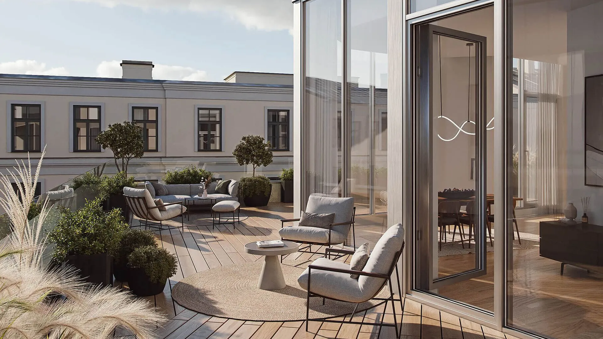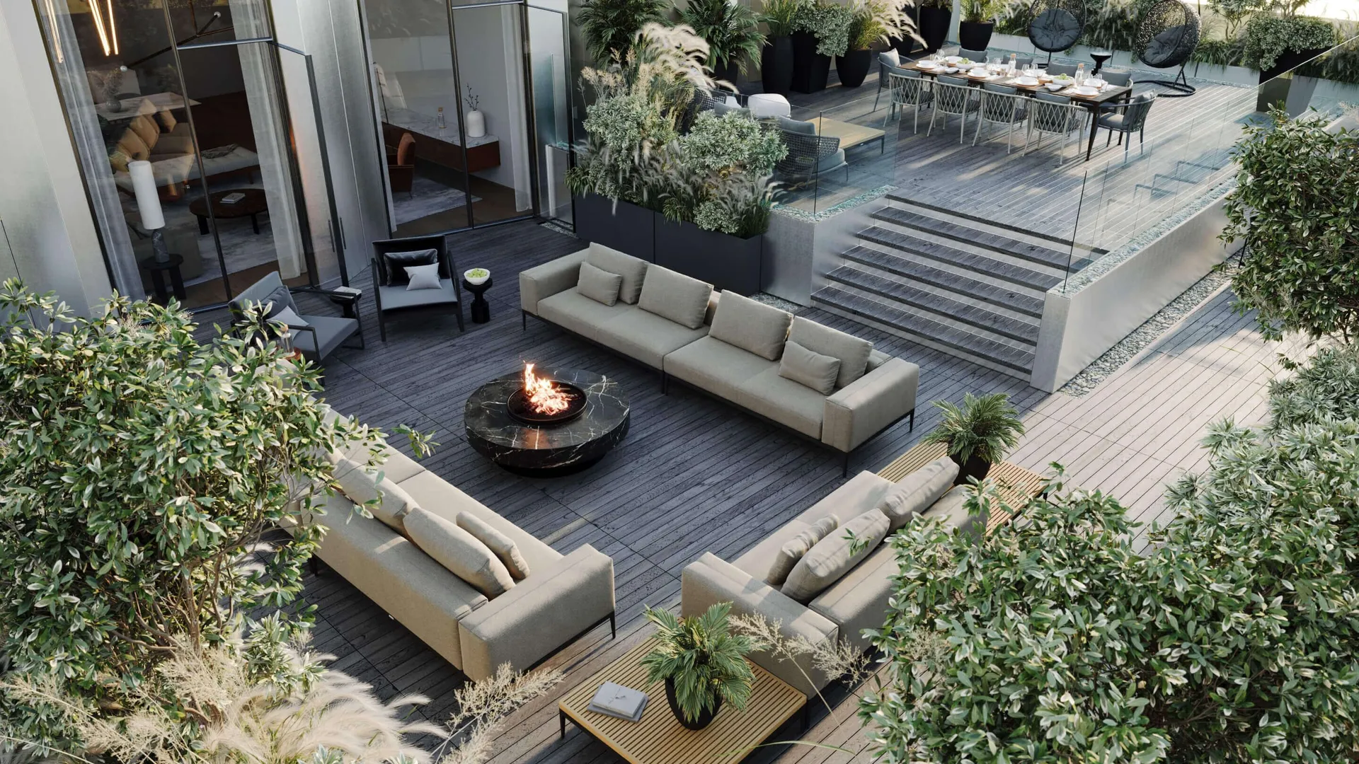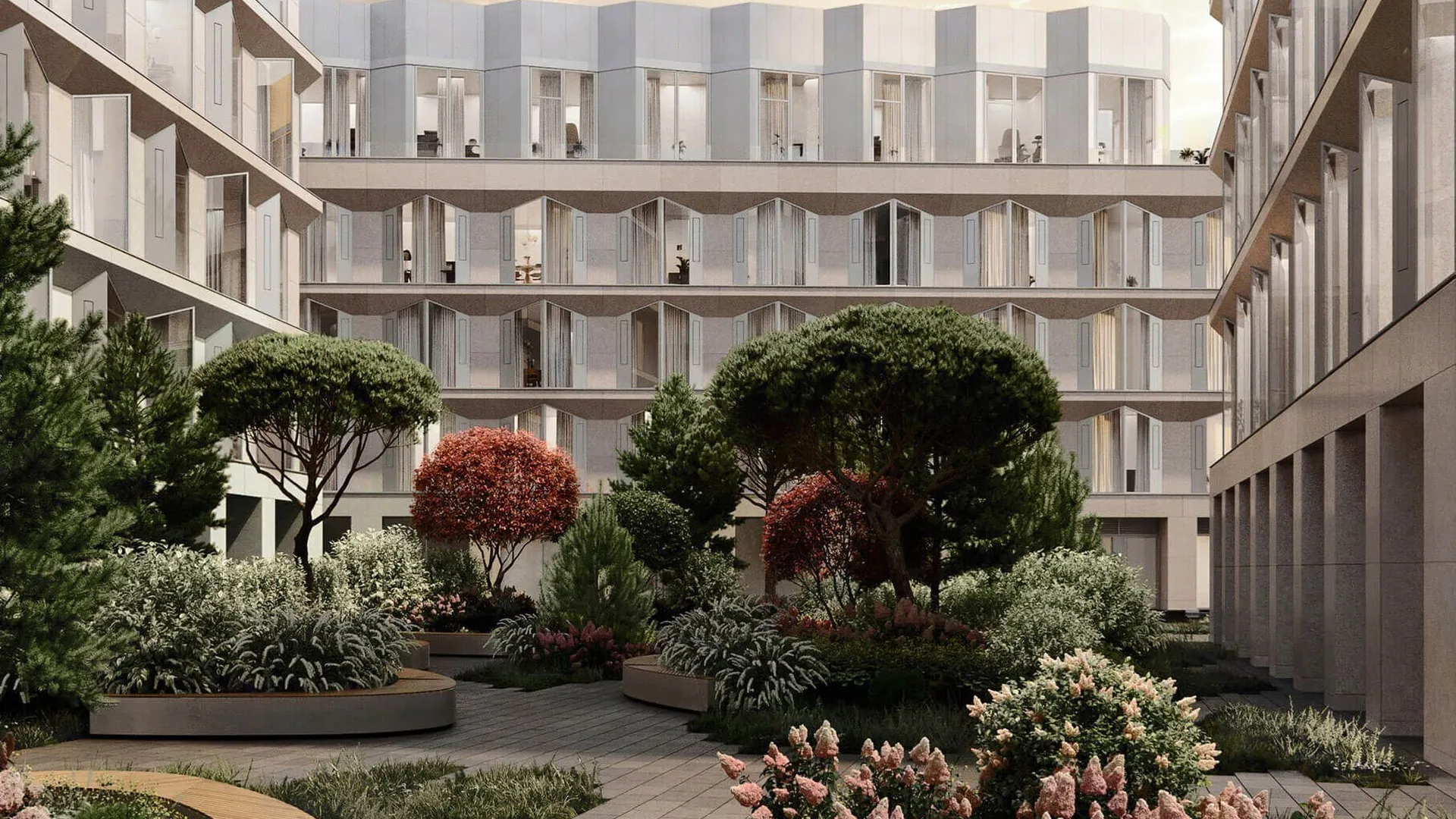 Внутри комплекса обустроен закрытый двор-сад с ландшафтным дизайном, созданный немецким бюро Udo Dagenbach. Пространство включает аллеи, газоны, цветники, зоны отдыха и декоративное освещение. Территория изолирована от внешнего шума.