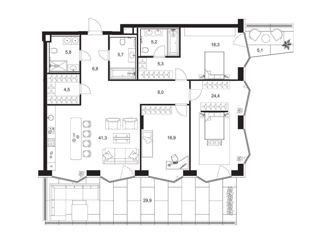 В некоторых лотах предусмотрены открытые или закрытые террасы, дополнительные санузлы, рабочие кабинеты, просторные кухонные зоны, гардеробные помещения и отдельные кладовые. Пентхаусы оснащены дровяными каминами и просторными холлами с видами на исторический район Замоскворечье.