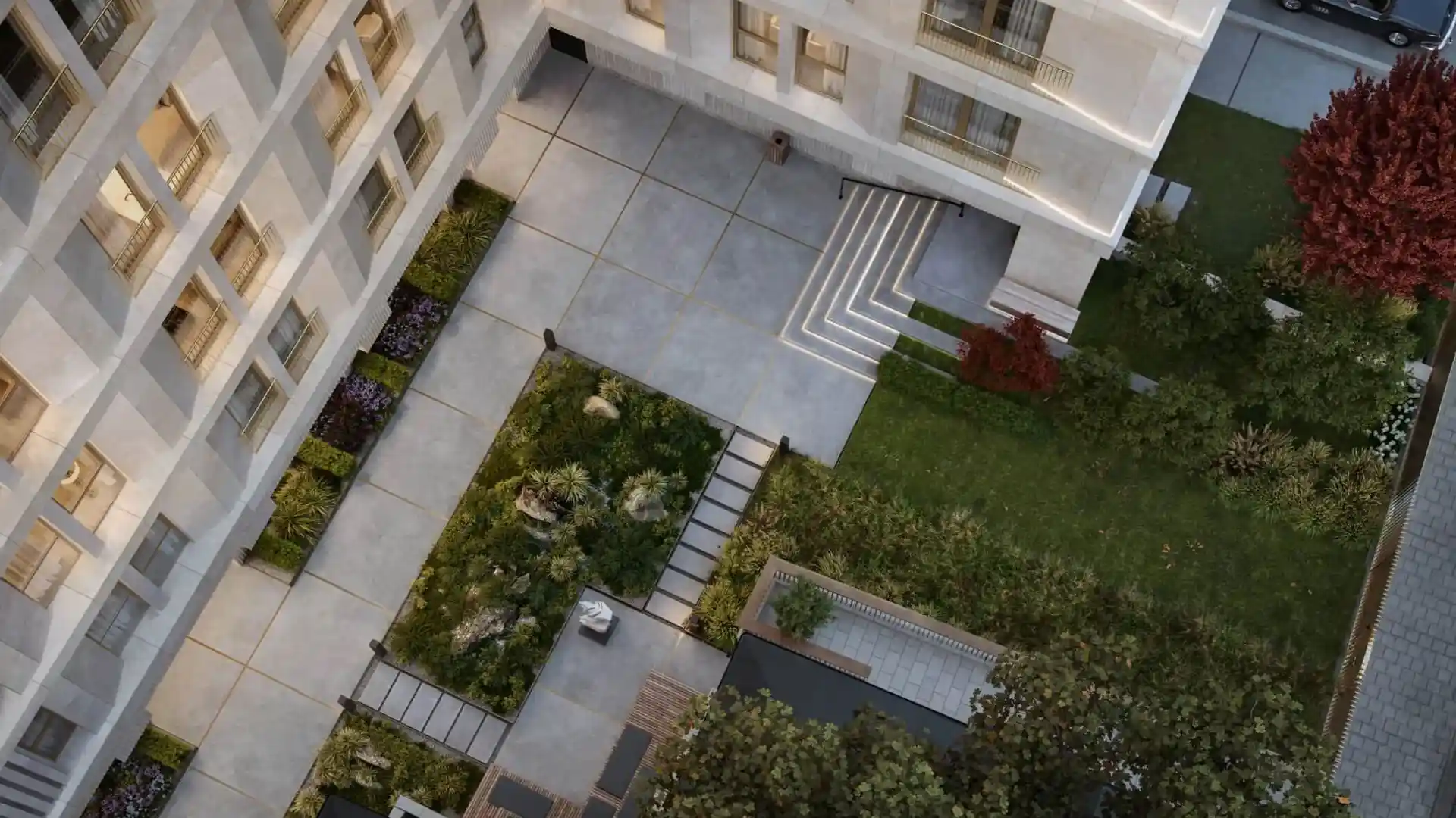 Территория благоустроена по проекту британского ландшафтного бюро Gillespies: разбит гипоаллергенный сад с всесезонным озеленением, установлены подогреваемые пешеходные тротуары, декоративная брусчатка, мягкое освещение. Во дворе обустроены воркаут‑зоны, игровые кластеры и догхаб.