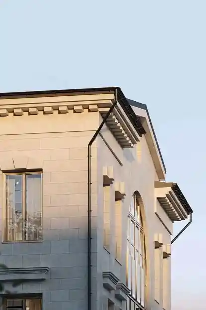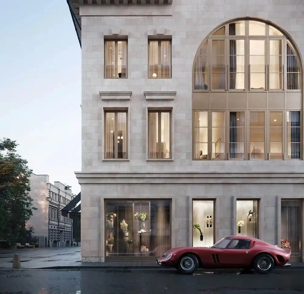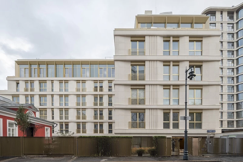 Архитектурный проект разработан британским бюро John McAslan + Partners. Комплекс состоит из двух монолитных корпусов высотой 3–6 этажей. Фасады выполнены из натурального светло‑серого камня, дополнены витражными окнами и открытыми французскими балконами; верхние этажи имеют сплошное остекление. Дизайн интерьеров и общественных пространств создан под личным руководством Джорджо Армани студией Armani/Casa Interior Design Studio