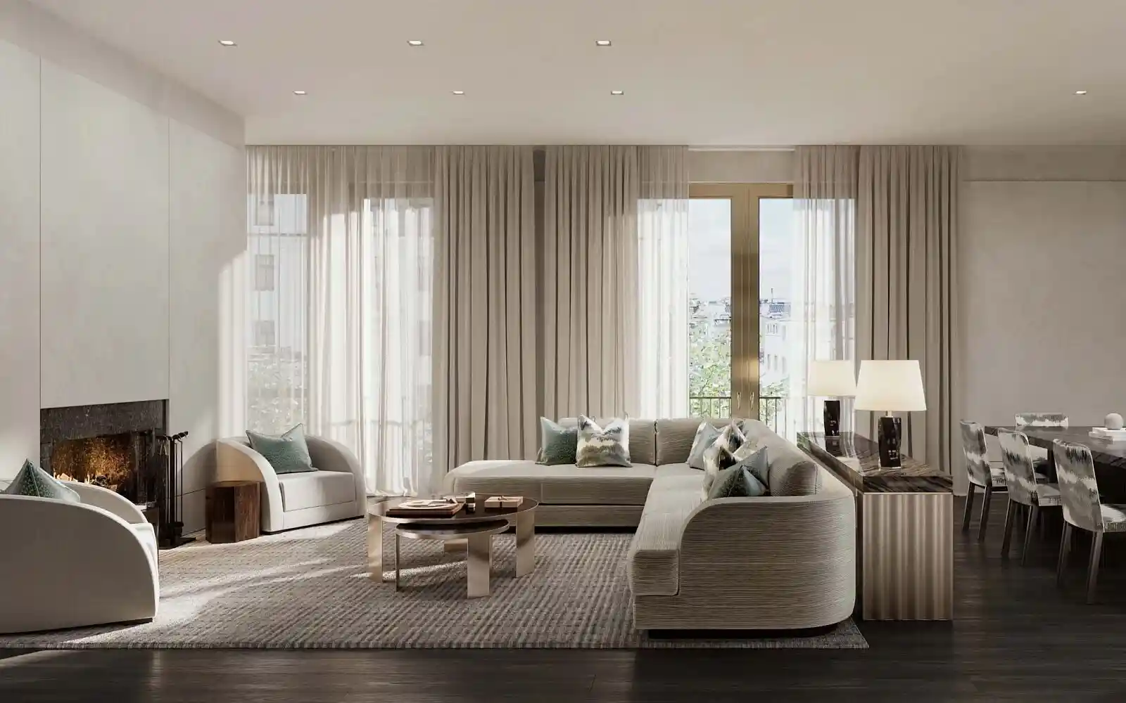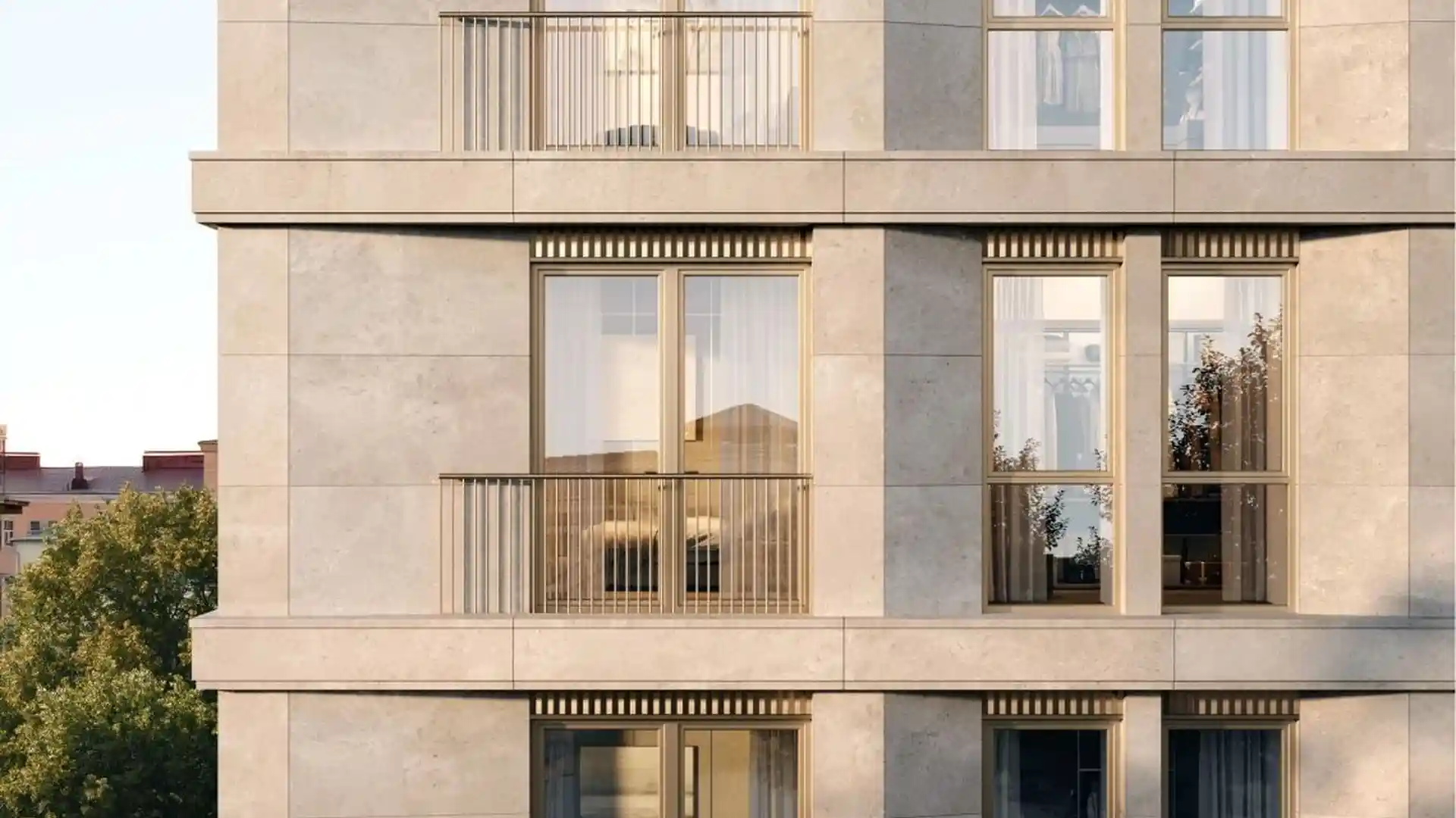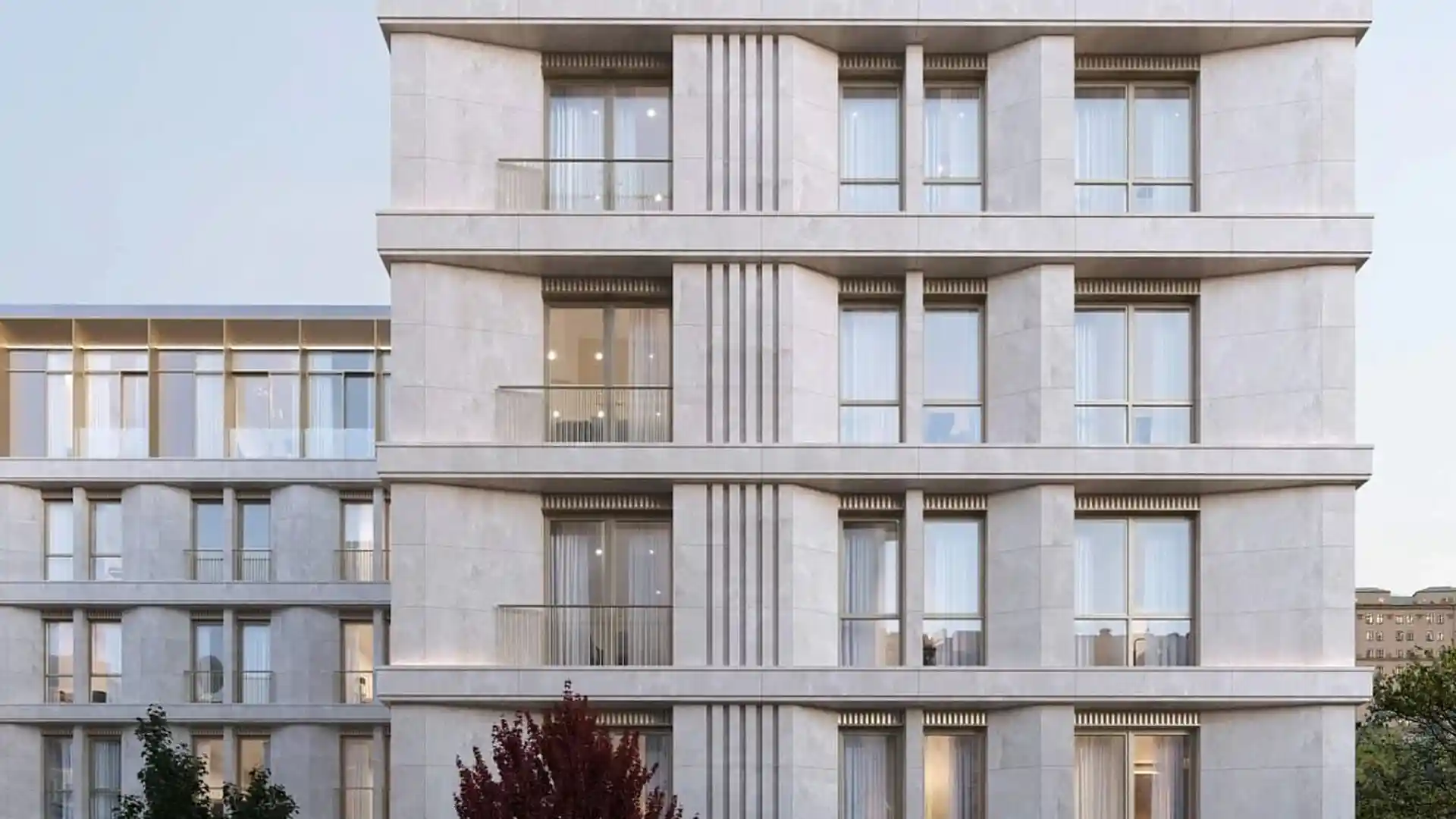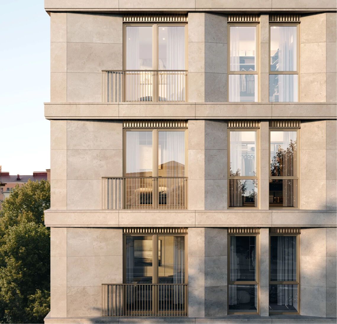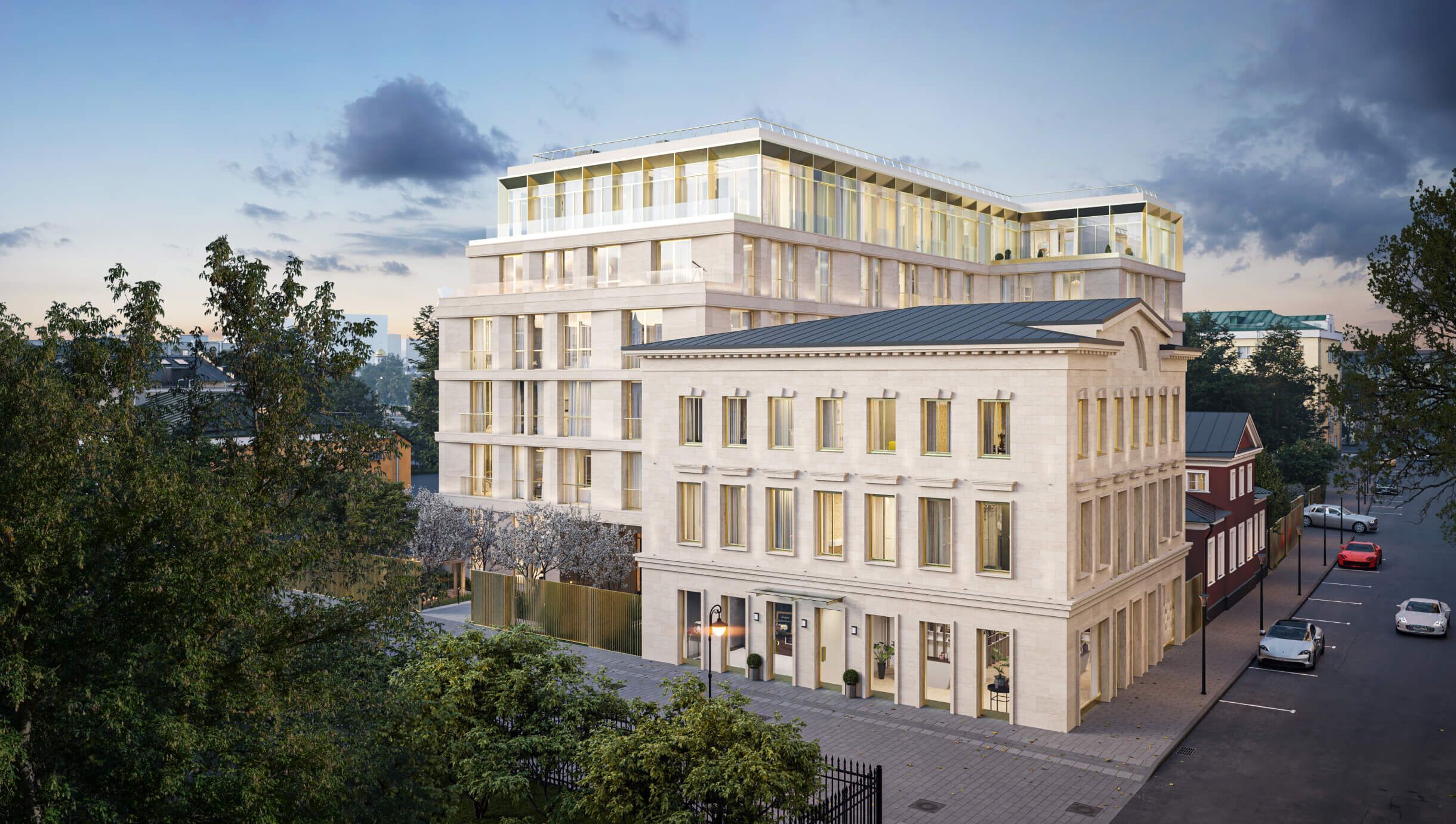 В проекте представлено 24 резиденции площадью от 79 до 263 м² и 3 пентхауса площадью 238–421 м² с террасами. Все помещения отличаются продуманными планировками: предусмотрены просторные гостиные, мастер‑спальни с ванными комнатами и гардеробными, несколько санузлов, хозяйственные помещения и комнаты для персонала. В каждой резиденции есть сервисная зона с отдельным лифтом. Высота потолков варьируется от 3,3 до 4 м.