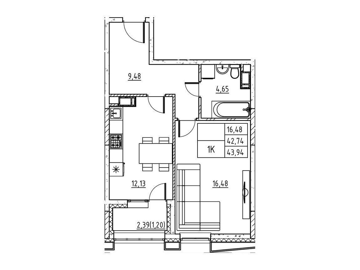 1-комн. квартира, 45.14 м²