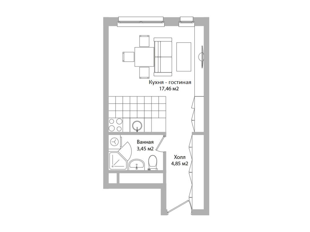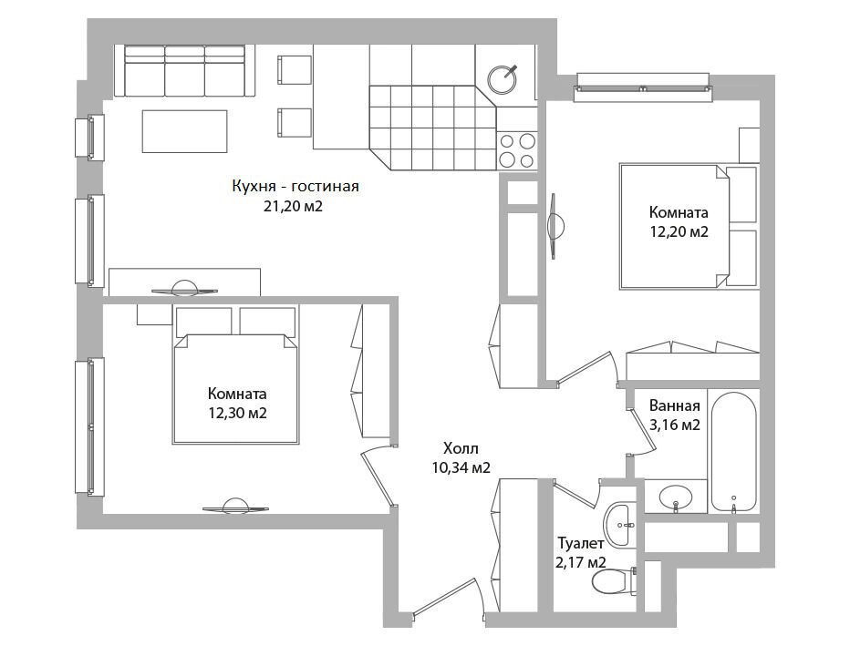 В проекте представлены студии, двух- и трёхкомнатные апартаменты площадью до 62 м². Во всех лотах предусмотрены функциональные кухни-гостиные, большие ванные комнаты, увеличенные окна и ниши для гардероба. Высота потолков составляет 2,7–2,85 м.
