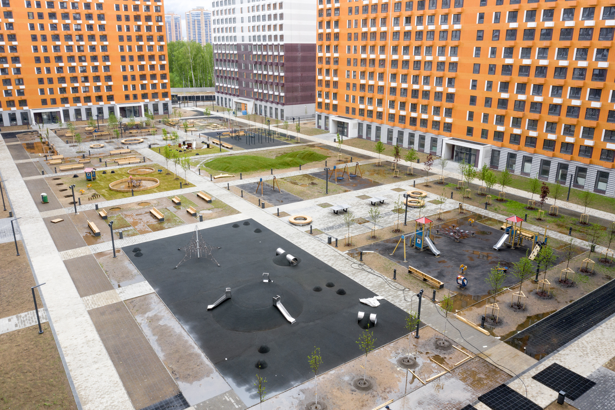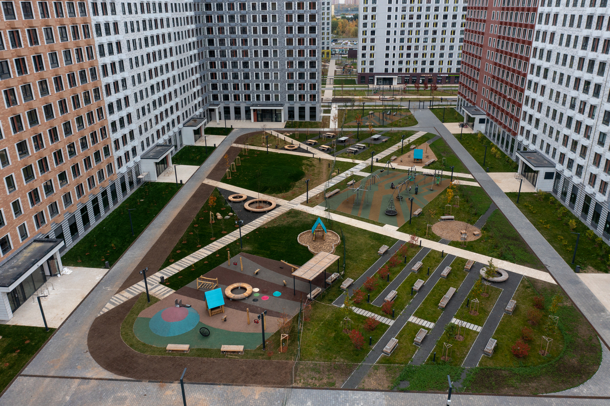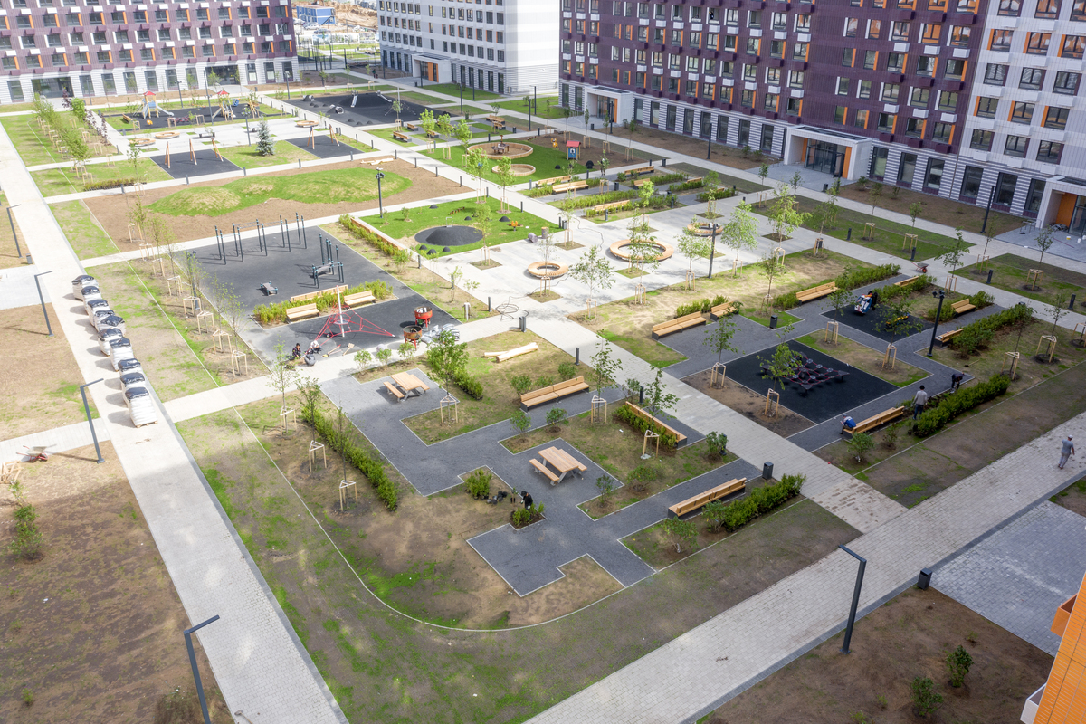 По проекту проходит пешеходный бульвар, на котором находится самая большая игровая площадка в жилом квартале. Здесь мы установили и привычные аттракционы, например качели и горки, и необычные архитектурные формы и искусственные холмы.