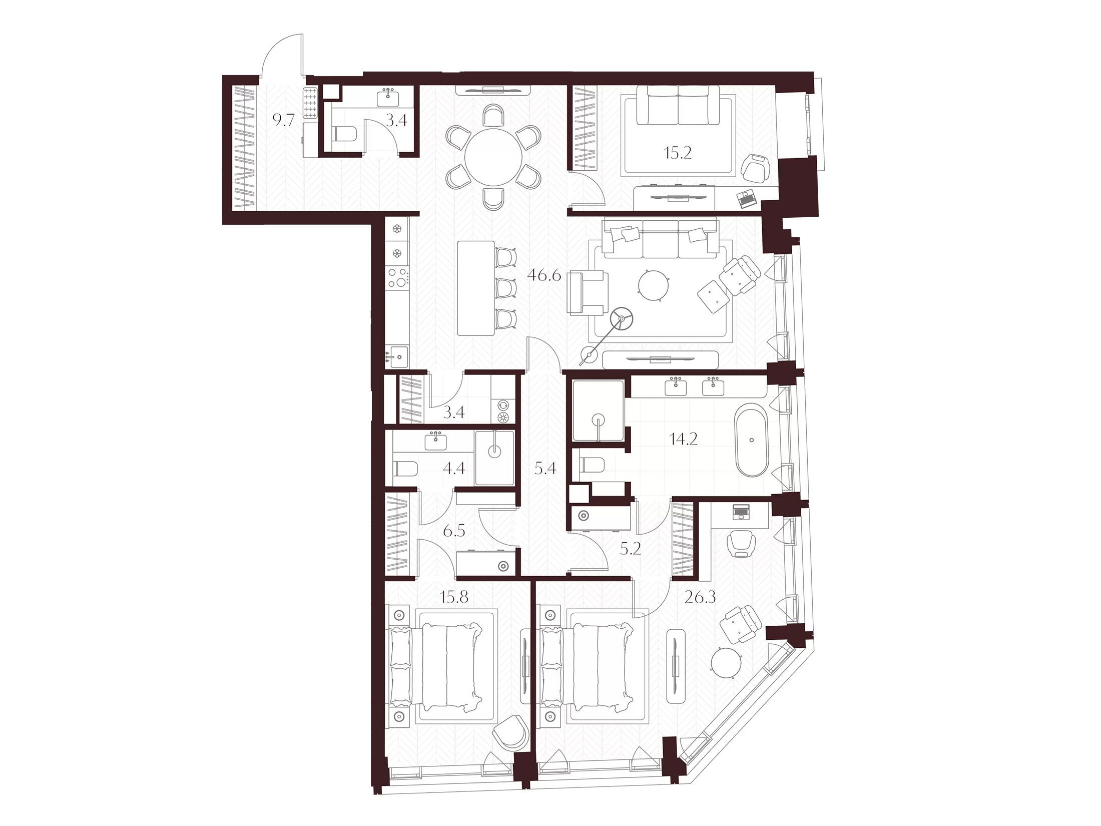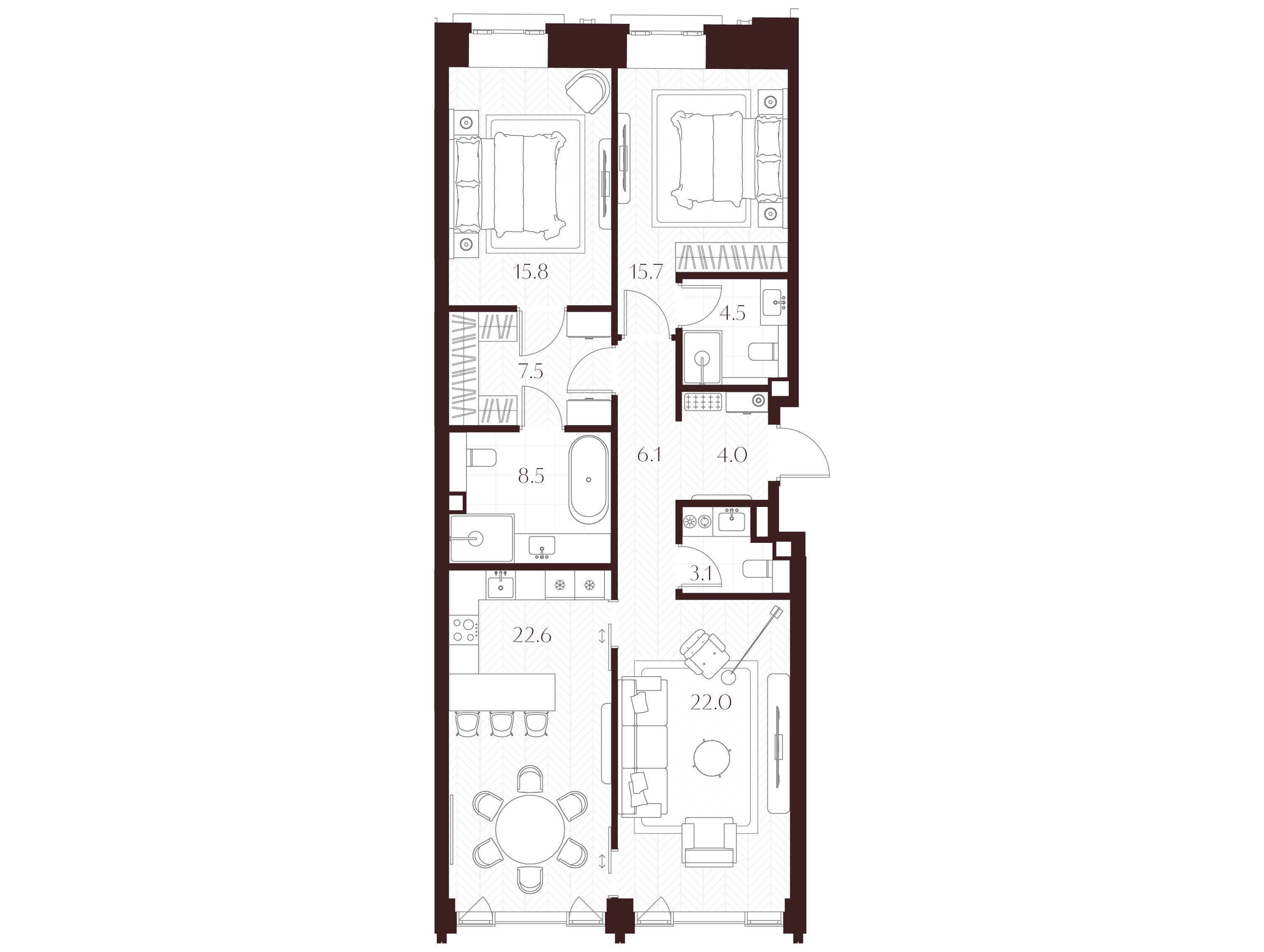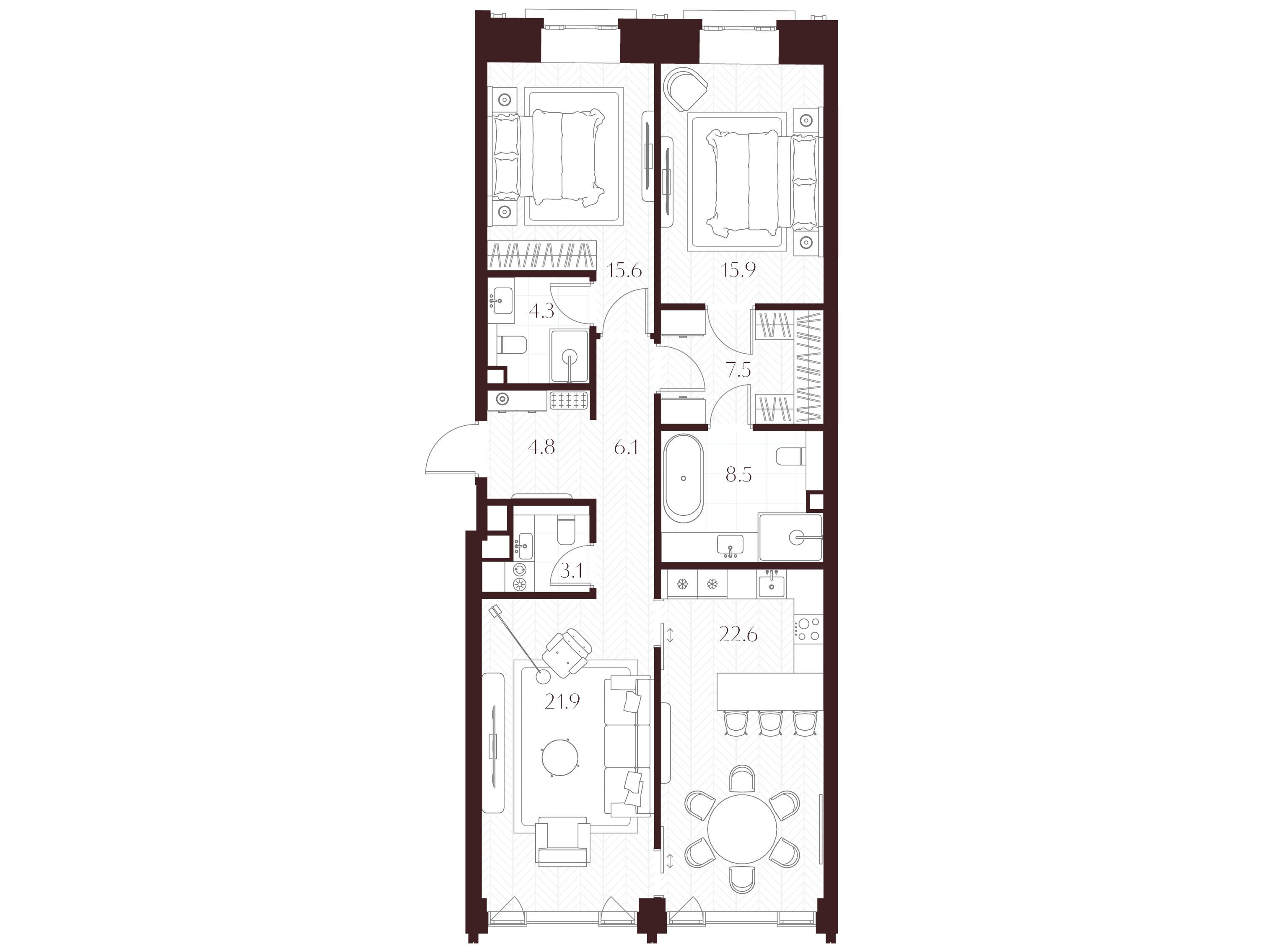 Во всех квартирах запроектированы просторные гостиные, продуманные системы хранения и мастер‑спальни. Квартиры сдаются без отделки, что позволяет владельцам реализовать индивидуальный дизайн‑проект.