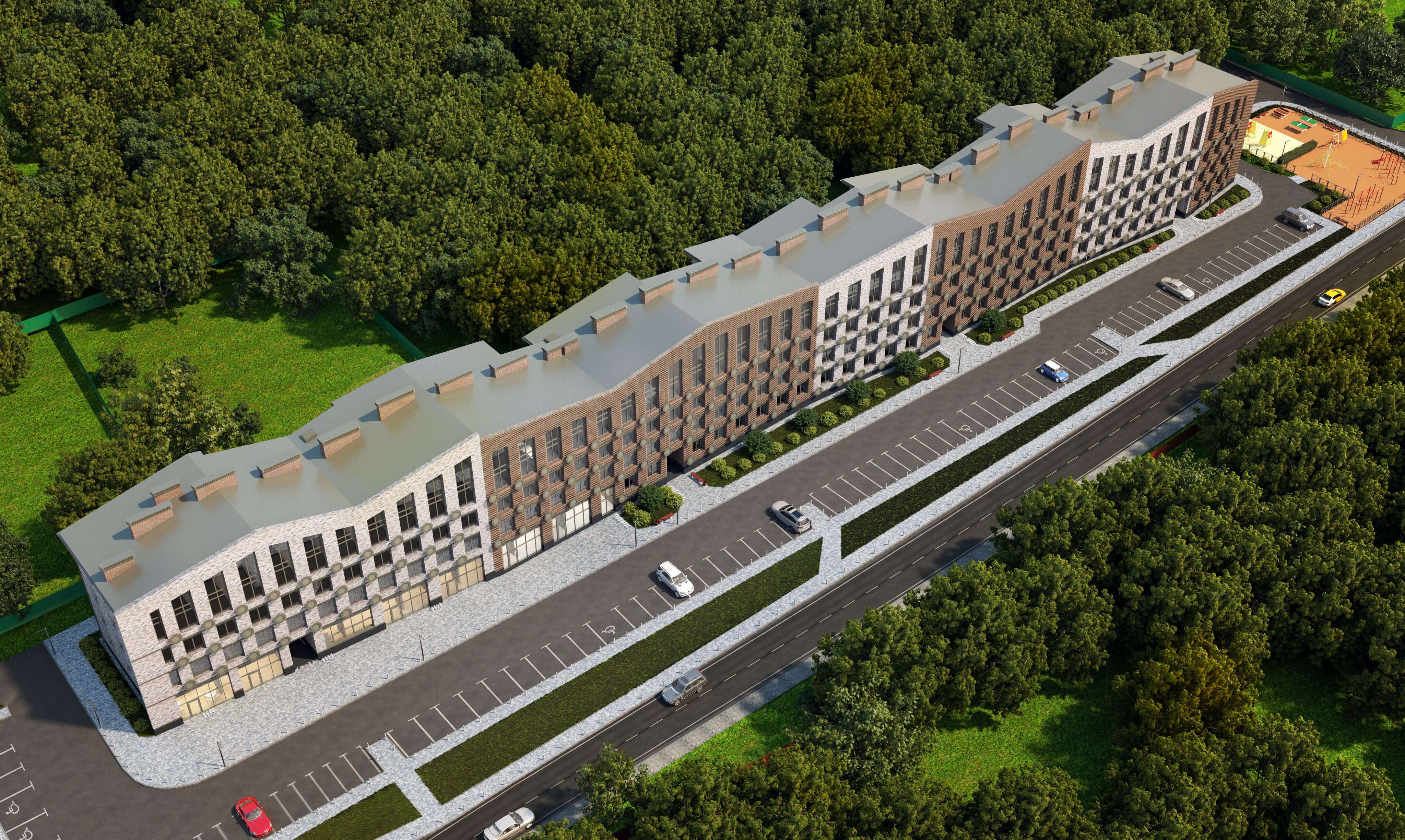 Территория комплекса закрыта и благоустроена: здесь есть детская и спортивная площадки, зоны для сбора бытовых отходов и велопарковки. Ландшафтный дизайн включает зелёные насаждения, газоны и скамьи для отдыха. Для автомобилистов предусмотрена открытая парковка на 75 машино-мест, дополнительно 32 места выделены за территорией комплекса.