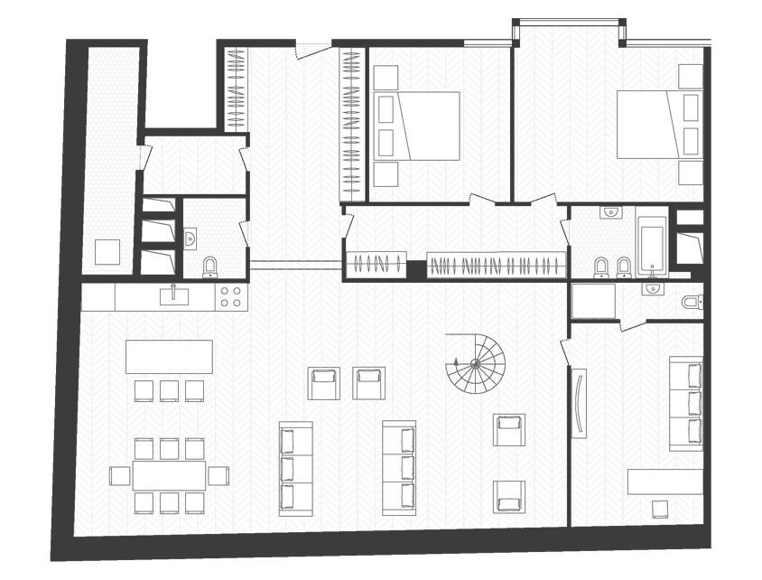 В клубном доме представлено 30 резиденций класса De luxe площадью от 58 до 325 кв. м. Для удобства жителей предусмотрены три лобби, оформленных с использованием натуральных материалов. Окна выходят на Кривоарбатский переулок, а террасы — во внутренний двор-сад.