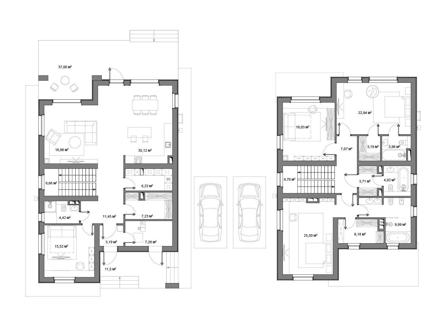 Все коттеджи полностью готовы к проживанию и оснащены всеми необходимыми коммуникациями и отделкой от застройщика. В каждом доме есть несколько спален, личные и гостевые санузлы, прачечные помещения, просторные мастер-спальни с отдельными душевыми и гардеробными комнатами. На нижних этажах расположены собственные котельные.