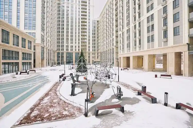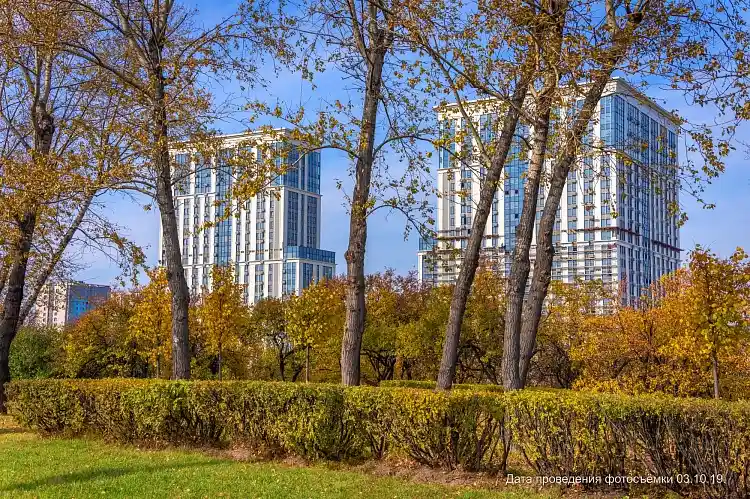 Территория комплекса закрыта и благоустроена: во дворе без машин выполнено ландшафтное озеленение, установлены детские и спортивные площадки, зоны отдыха и велопарковки. Для автовладельцев предусмотрен трёхуровневый подземный паркинг на 1602 машино‑места с автомойкой и прямым доступом на лифте из здания.