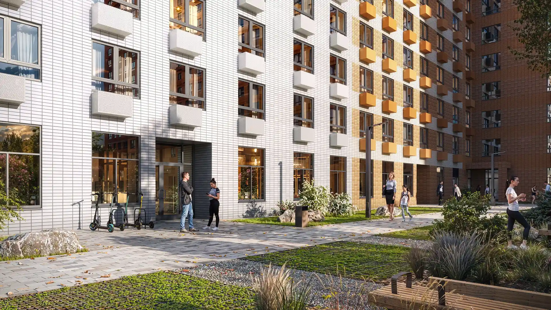Во дворах — благоустроенные зелёные парки с местами для отдыха, детскими и спортивными площадками. Через квартал протянется широкий пешеходный бульвар для прогулок на свежем воздухе. На первых этажах домов работают магазины, кафе и полезные сервисы. А для владельцев автомобилей предусмотрены подземные паркинги.