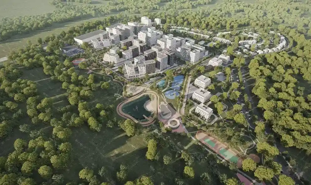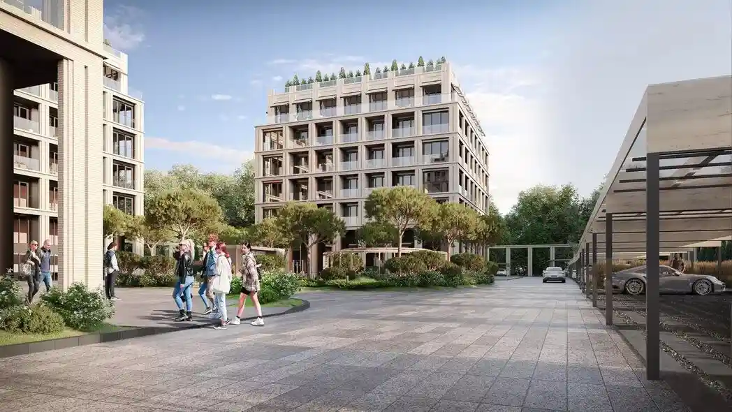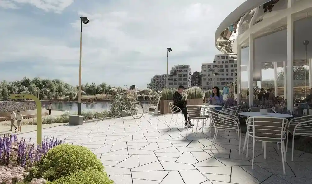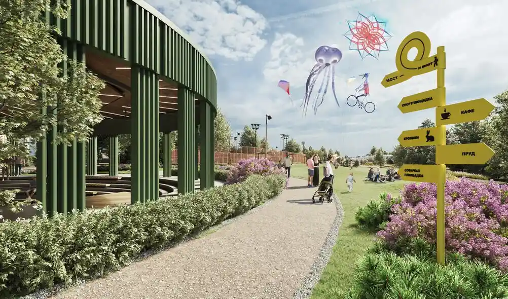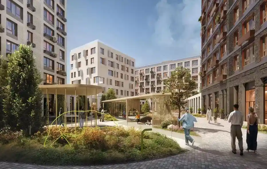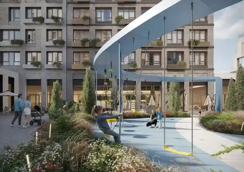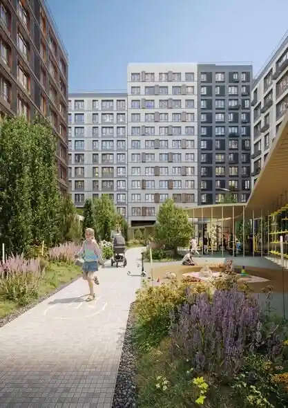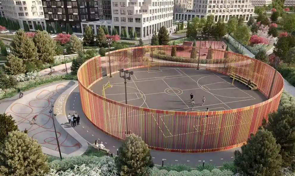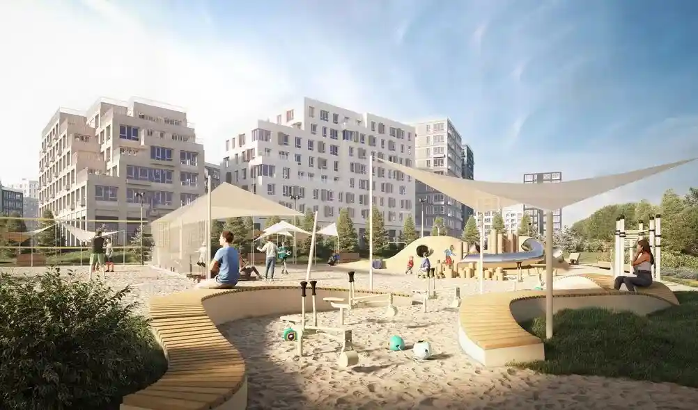 Территория комплекса благоустроена по концепции «двор без машин»: все парковочные места вынесены за пределы жилой зоны, а внутренние пространства отданы под зоны отдыха и детские площадки. В центре двора расположен ландшафтный парк с прогулочными аллеями, зонами для пикников, скамейками и фонтаном. Для детей созданы игровые комплексы с безопасным покрытием, для взрослых — зоны воркаута и площадки для йоги, а для любителей активного отдыха проложены велодорожки и беговые маршруты. Рядом с комплексом формируется набережная вдоль Москвы‑реки с пешеходными и велосипедными дорожками, местами для отдыха и причалом для маломерных судов.