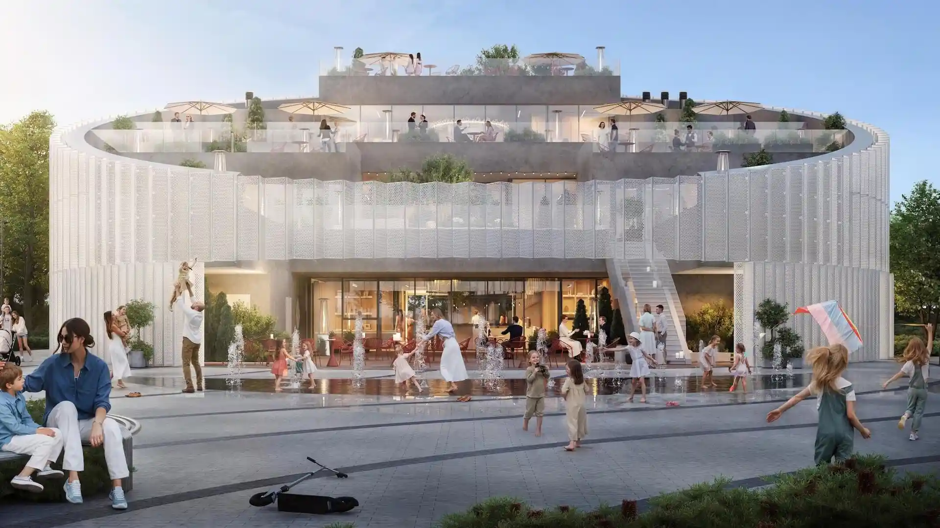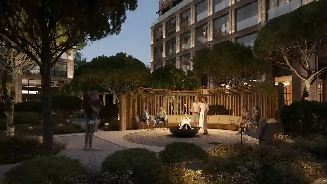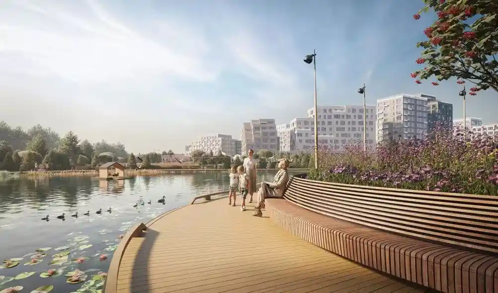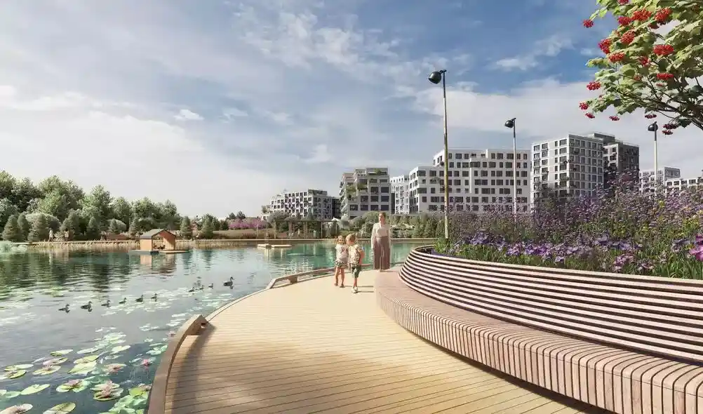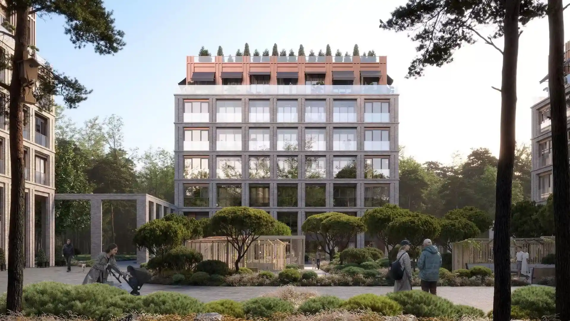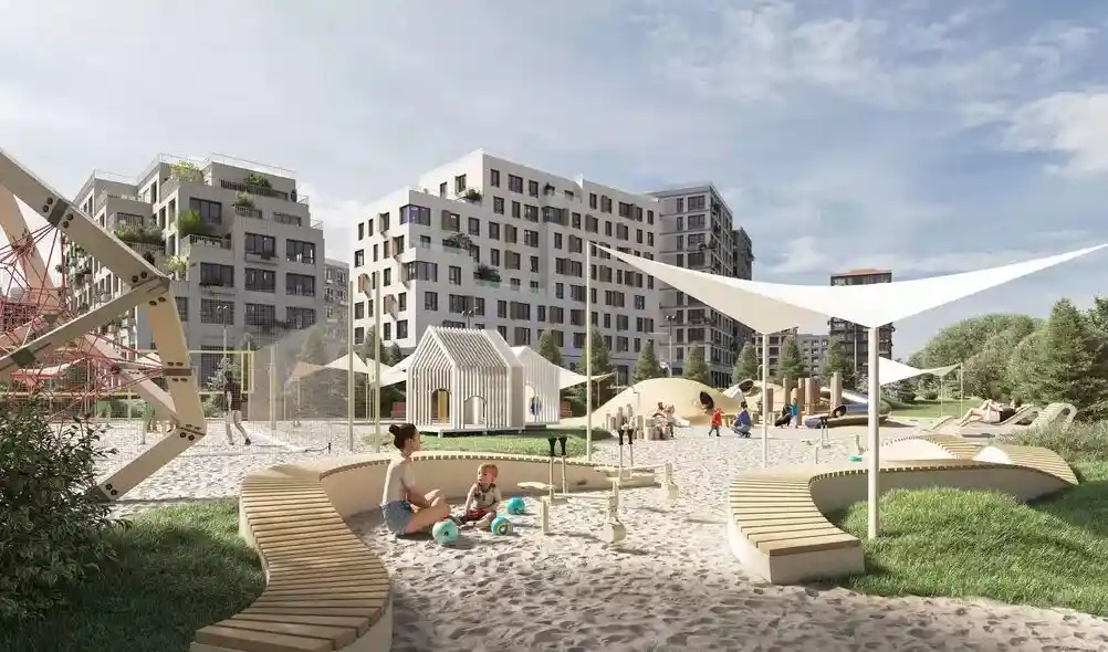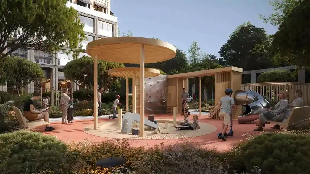 Территория комплекса благоустроена по концепции «двор без машин»: все парковочные места вынесены за пределы жилой зоны, а внутренние пространства отданы под зоны отдыха и детские площадки. В центре двора расположен ландшафтный парк с прогулочными аллеями, зонами для пикников, скамейками и фонтаном. Для детей созданы игровые комплексы с безопасным покрытием, для взрослых — зоны воркаута и площадки для йоги, а для любителей активного отдыха проложены велодорожки и беговые маршруты. Рядом с комплексом формируется набережная вдоль Москвы‑реки с пешеходными и велосипедными дорожками, местами для отдыха и причалом для маломерных судов.