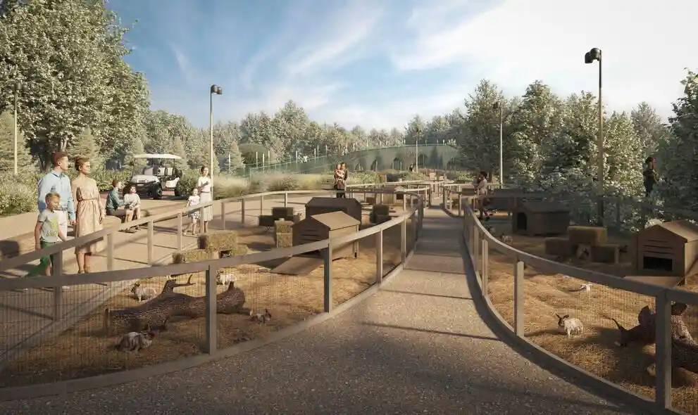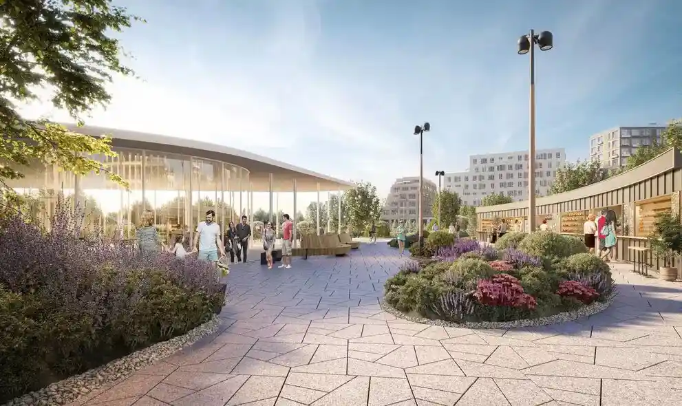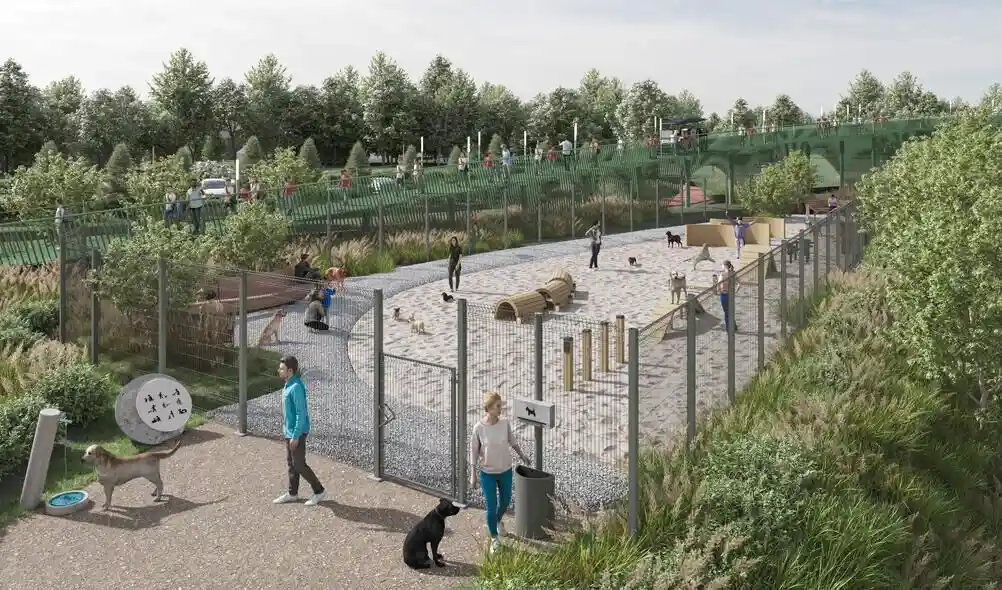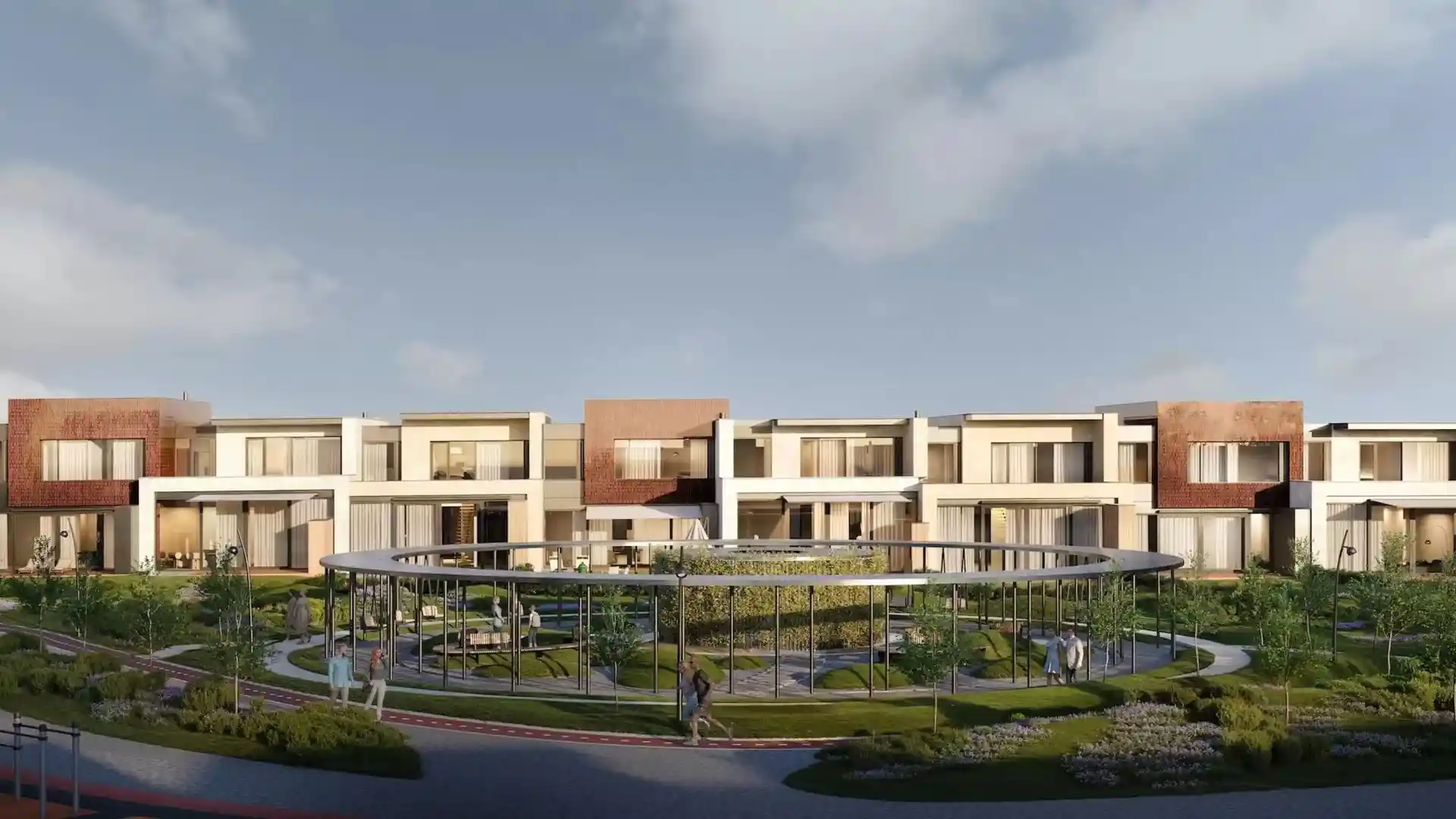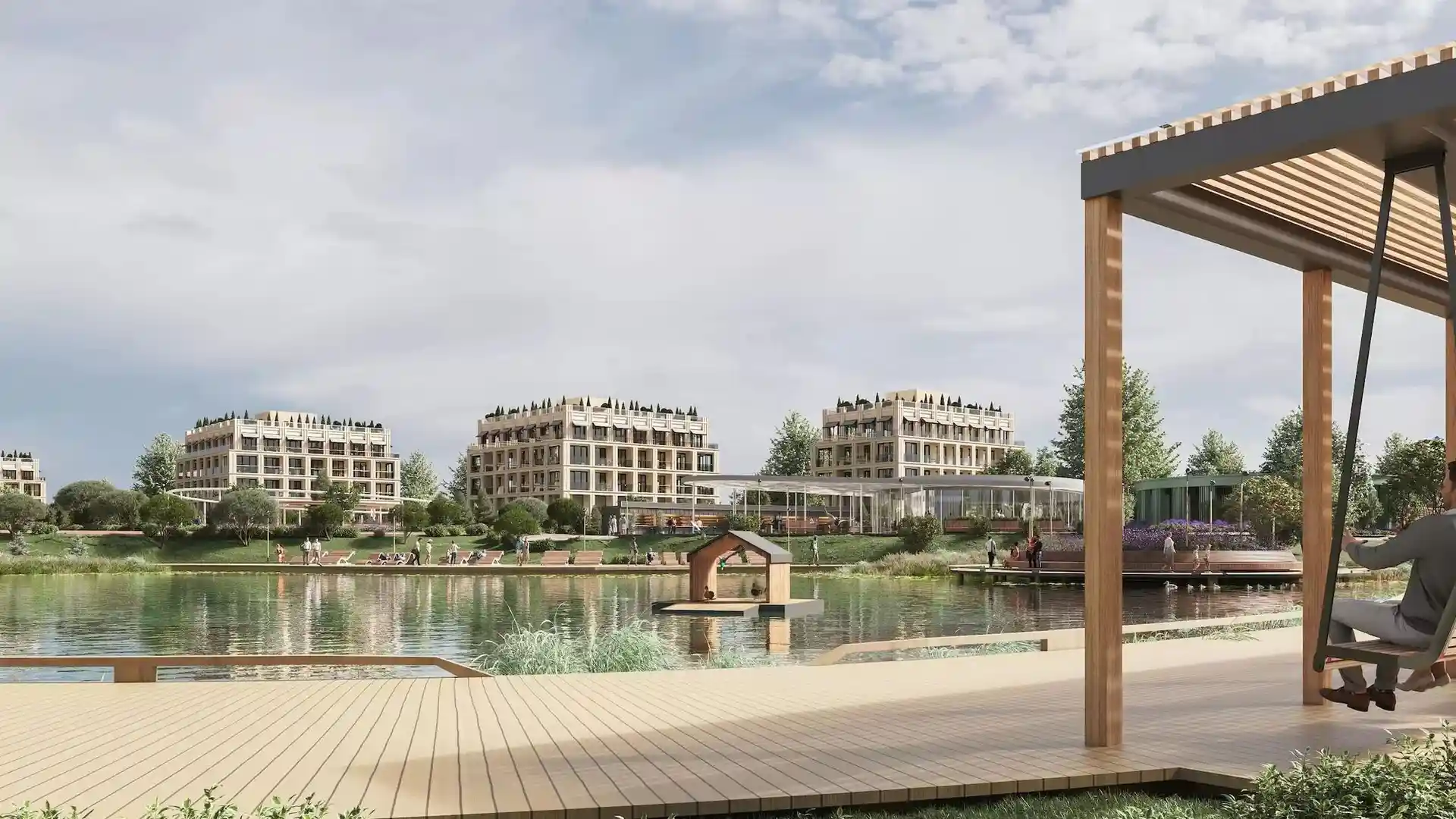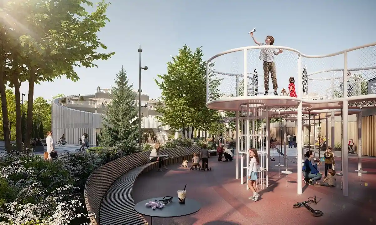 Территория комплекса благоустроена по концепции «двор без машин»: все парковочные места вынесены за пределы жилой зоны, а внутренние пространства отданы под зоны отдыха и детские площадки. В центре двора расположен ландшафтный парк с прогулочными аллеями, зонами для пикников, скамейками и фонтаном. Для детей созданы игровые комплексы с безопасным покрытием, для взрослых — зоны воркаута и площадки для йоги, а для любителей активного отдыха проложены велодорожки и беговые маршруты. Рядом с комплексом формируется набережная вдоль Москвы‑реки с пешеходными и велосипедными дорожками, местами для отдыха и причалом для маломерных судов.