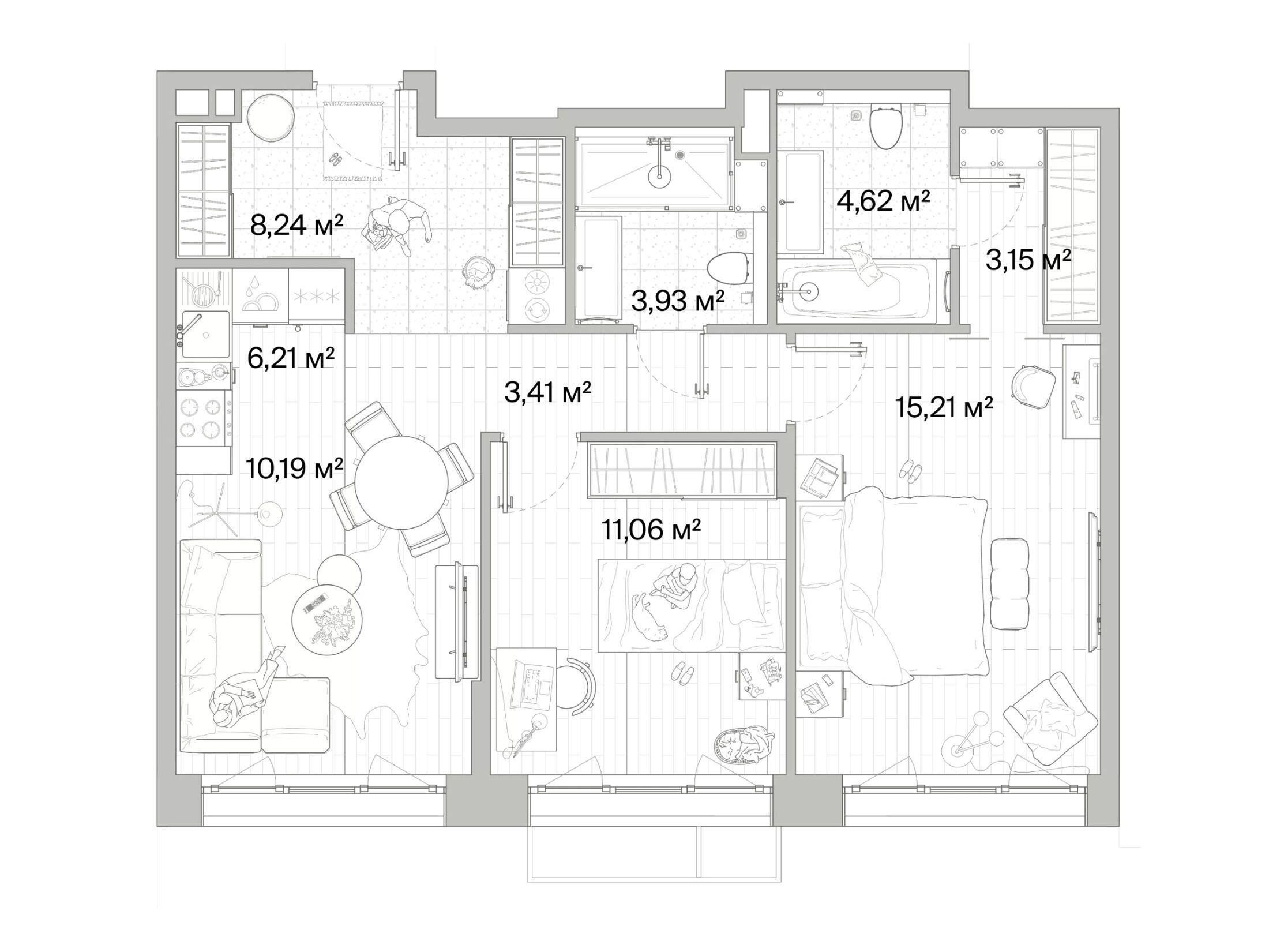 В ЖК «Мыс» представлено более 1 500 квартир различных форматов — от компактных студий площадью от 26,8 кв. м до просторных четырёхкомнатных лотов до 115 кв. м. Высота потолков составляет 2,9 м, а в некоторых квартирах с панорамным остеклением — до 3,2 м. Среди планировок — варианты с кухнями‑гостиными, мастер‑спальнями с отдельными ванными комнатами и гардеробными, а также лоты с балконами и лоджиями. Жильё предлагается как с чистовой отделкой в нескольких дизайнерских стилях (скандинавский, минимализм, классика), так и без отделки для тех, кто планирует реализовать собственные идеи.