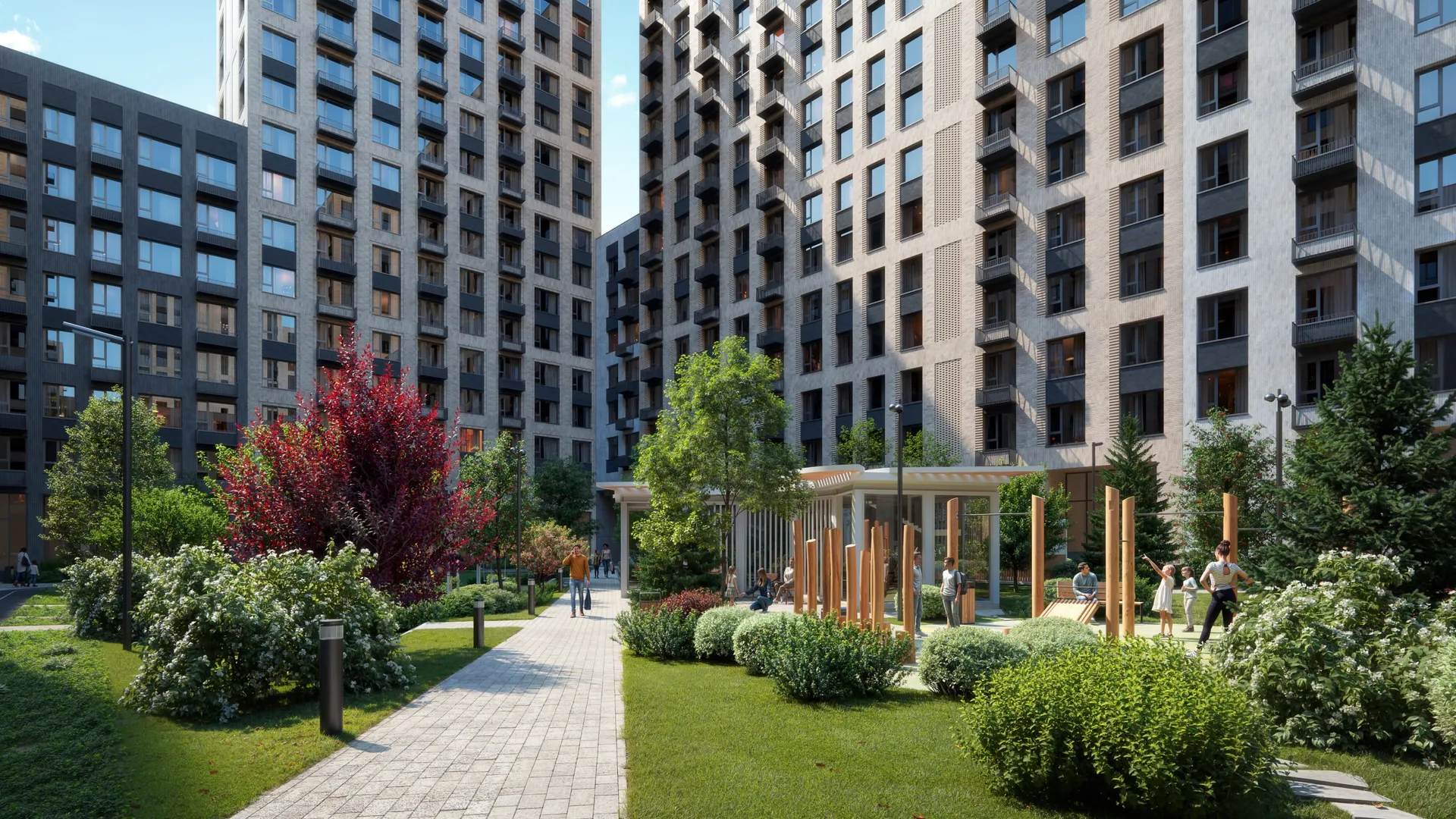 Территория комплекса закрыта для посторонних, оборудована системой видеонаблюдения и реализована по концепции «двор без машин». Для автомобилей предусмотрены гостевые парковки: на придомовой территории — на 399 машиномест, дополнительно — гостевая парковка на 69 мест. Во дворах обустроены детские и спортивные площадки, беговые и велодорожки, зоны для отдыха. На первом этаже разместят ритейл‑галерею с магазинами, кафе и другими коммерческими помещениями.