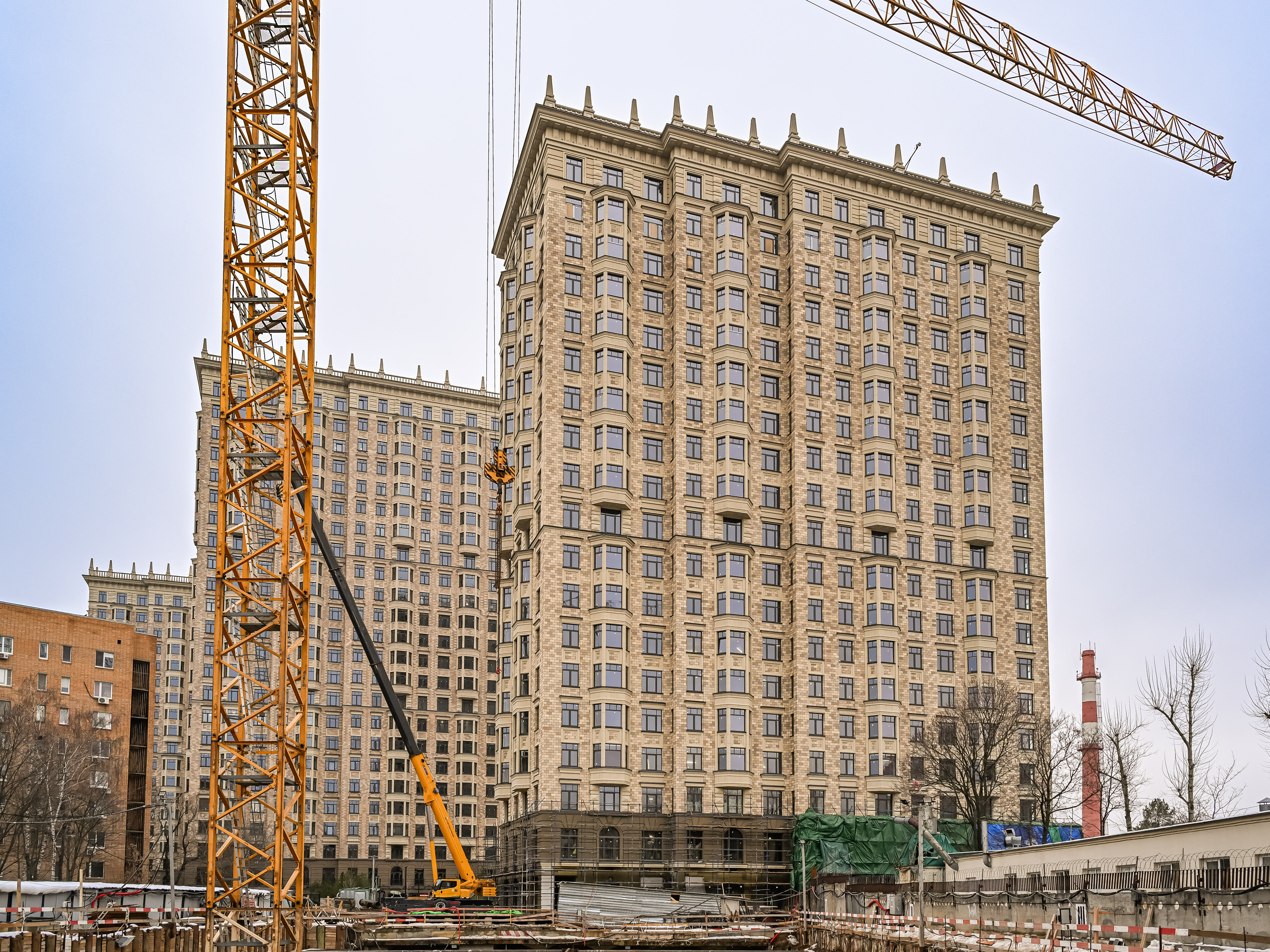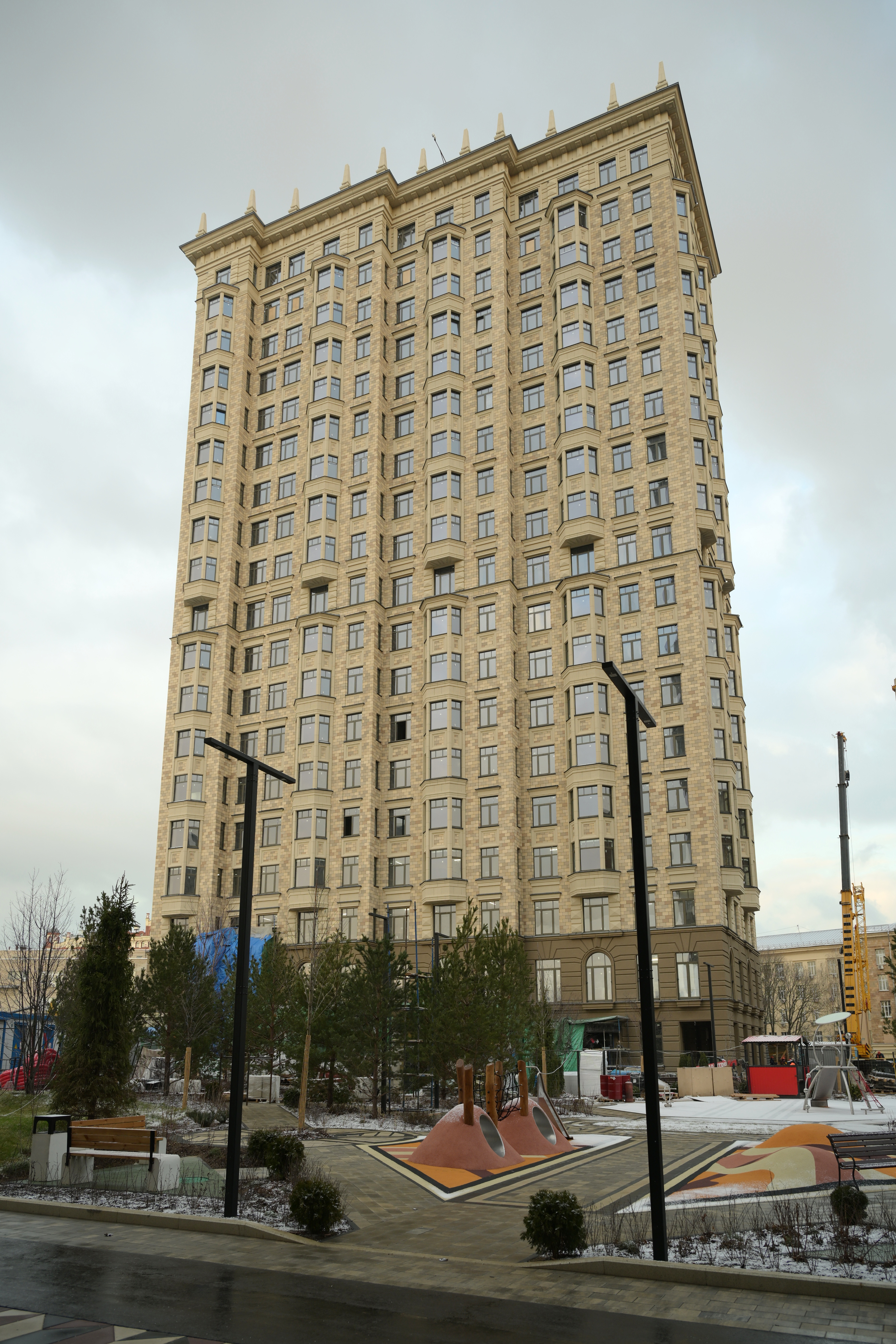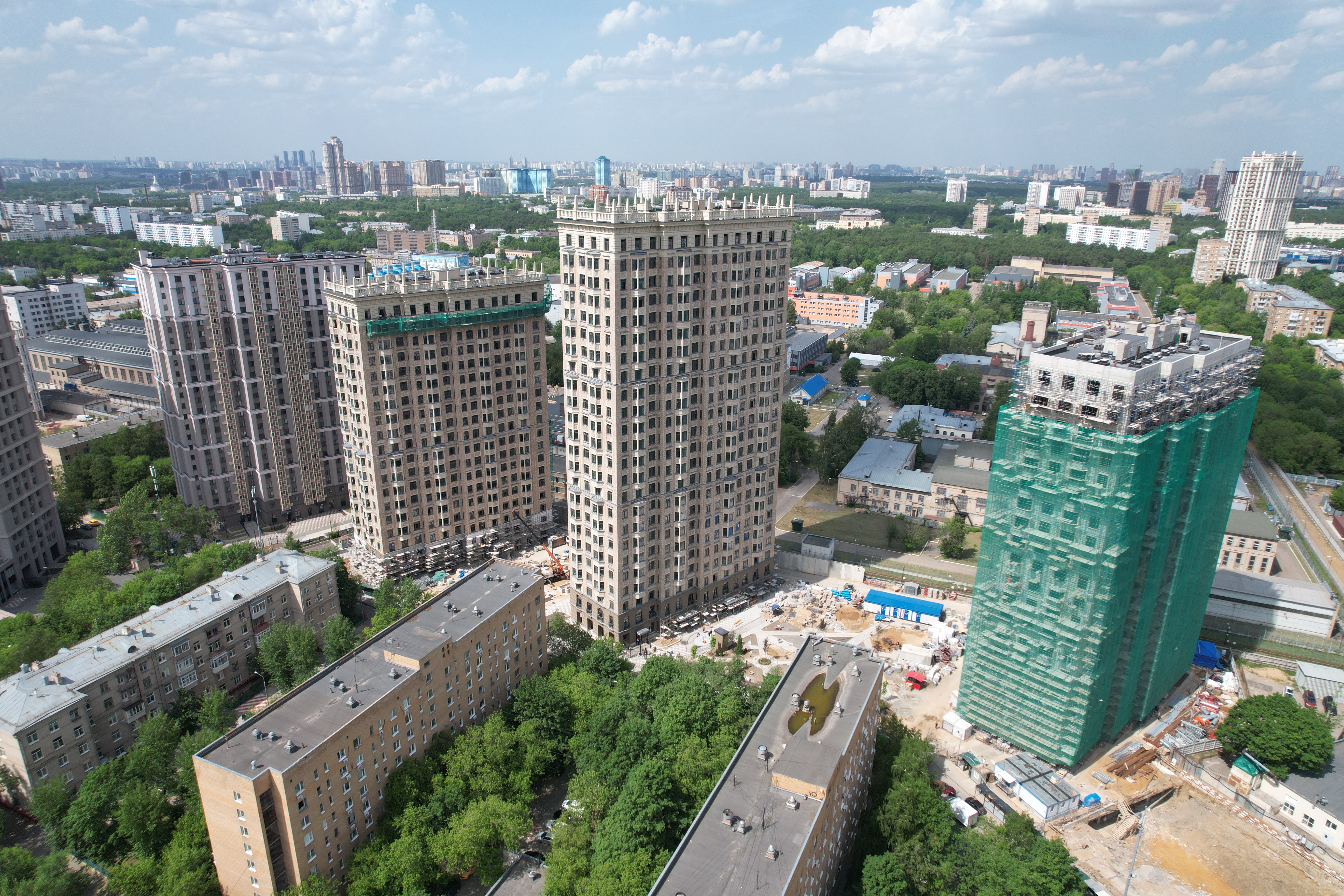 Три корпуса разной высоты формируют выразительный силуэт комплекса. Архитектурный проект разработан московским бюро WALL, известным работой над премиальными жилыми и офисными зданиями.