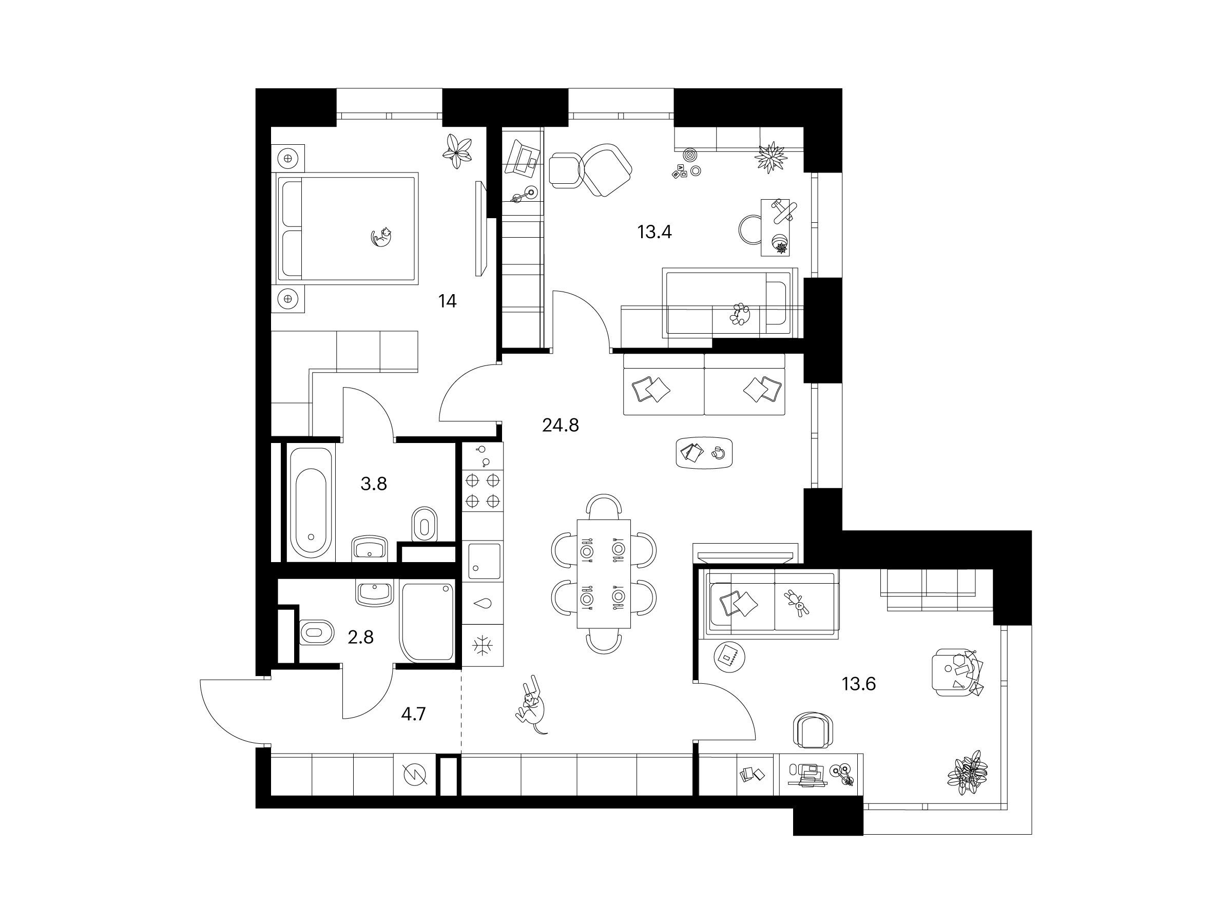 Планировки в новом корпусе продуманы так, чтобы дарить максимум пространства и комфорта. Просторные кухни-гостиные станут центром притяжения для всей семьи, а удобные гардеробные помогут избавиться от лишних шкафов. Для семей с детьми предусмотрены спальни, разнесённые по разные стороны гостиной.