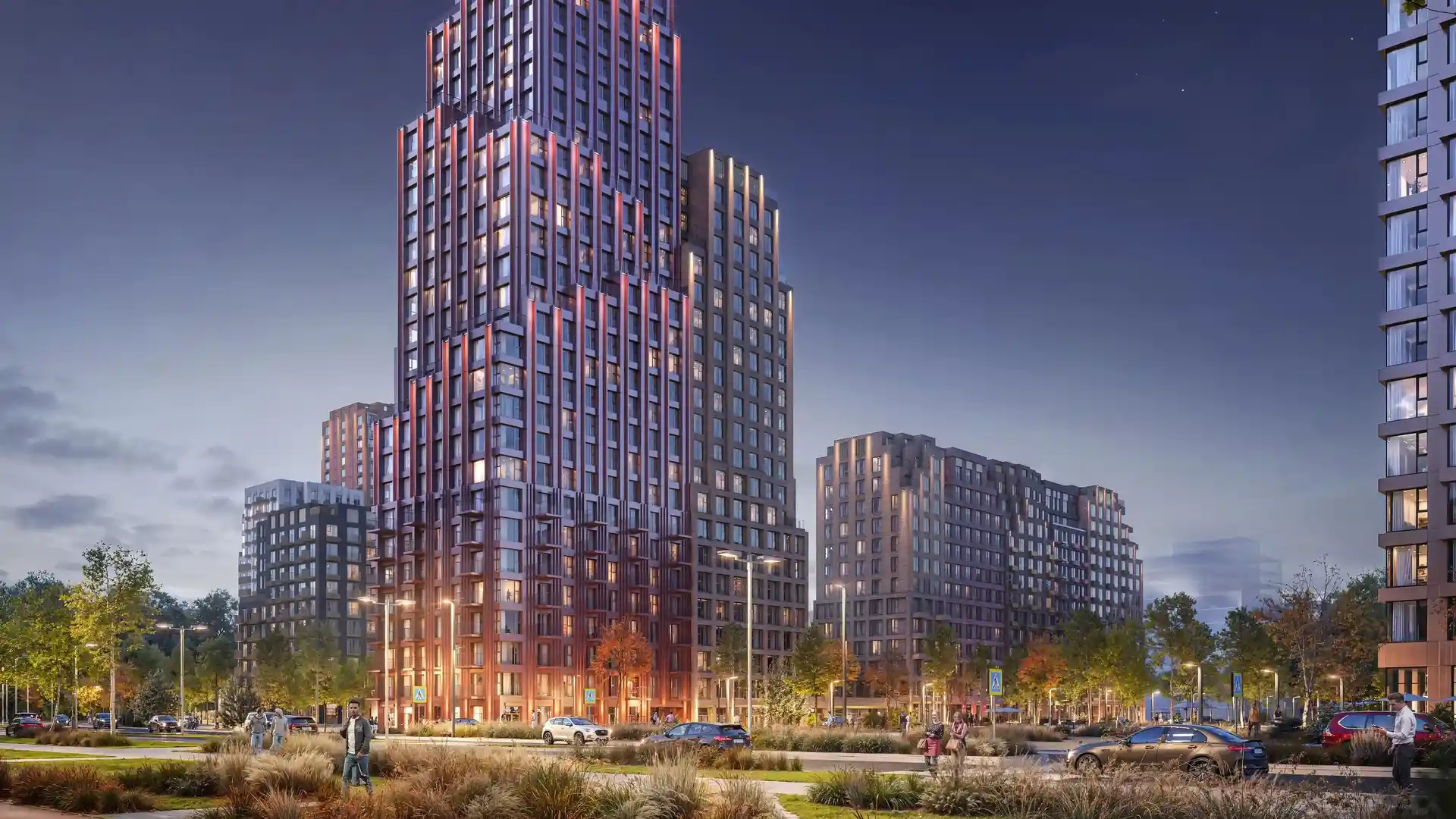 Дизайн проработан и внутри домов. На первых этажах — просторные и светлые лобби: мягкие тона выразительно дополнят контрастные чёрные и терракотовые акценты, а стеклянные двери дарят пространству много естественного света и ощущение простора.