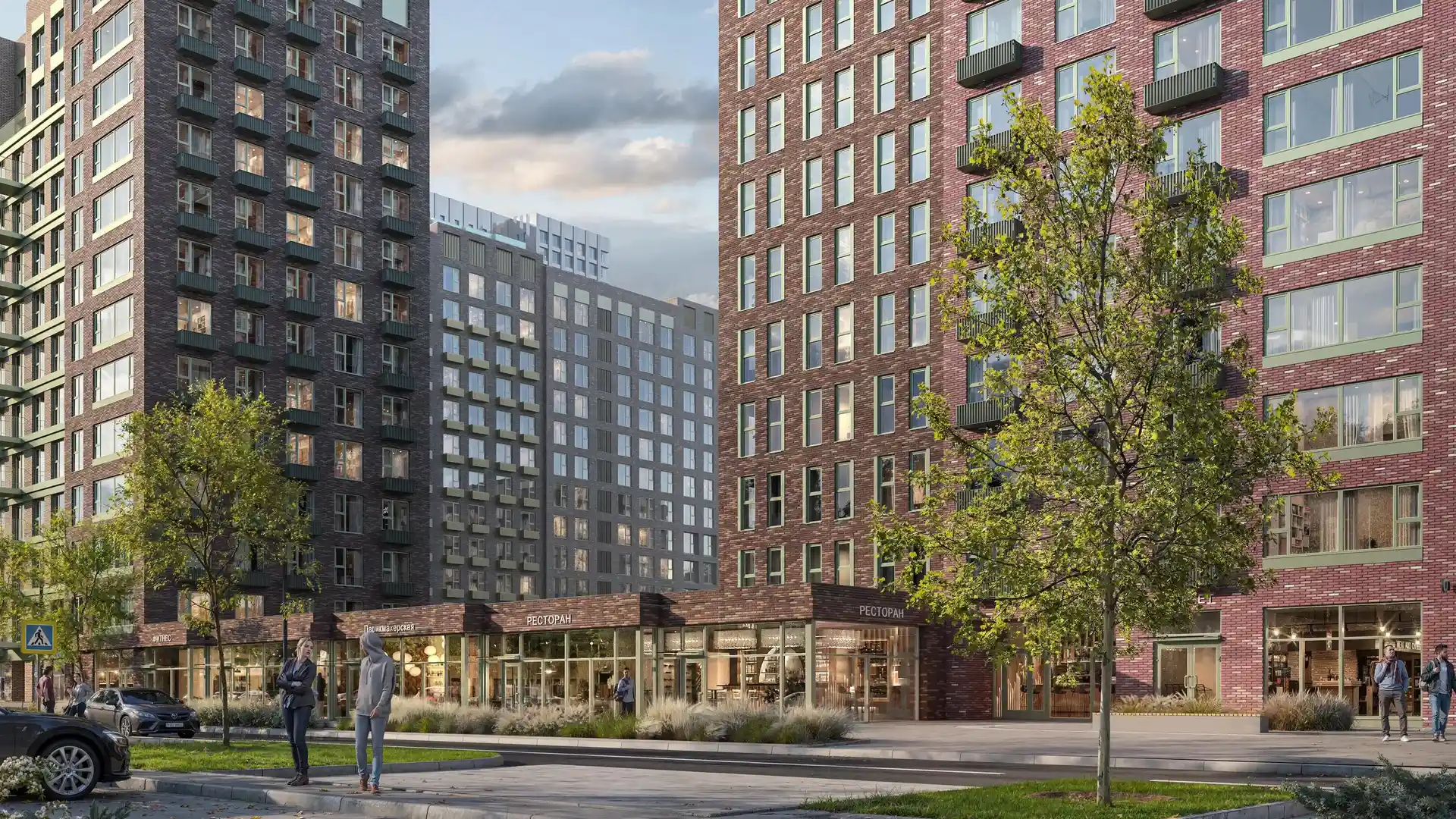 Квартал состоит из разноэтажных домов со ступенчатыми фасадами. Цветовая палитра проекта спокойная: оттенки белого и коричневого сочетаются с пастельным розовым и мятным.