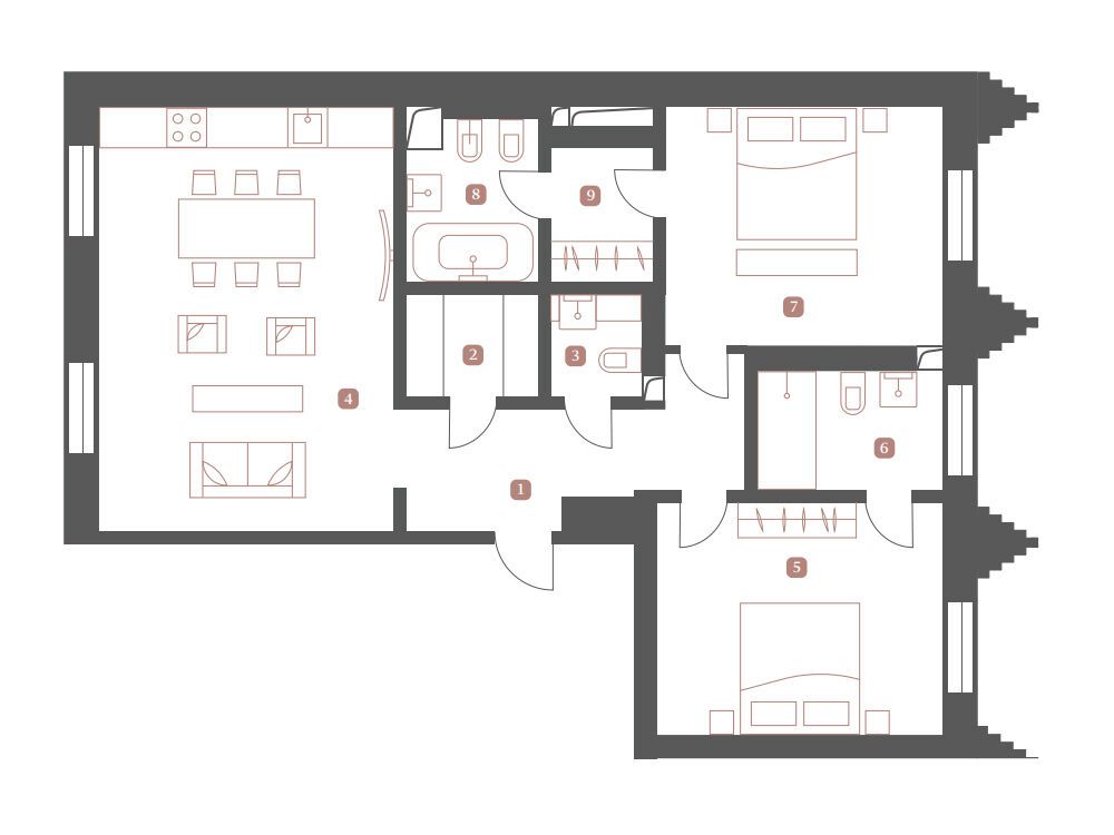Площадь каждого жилья варьируется от 81 до 344 квадратных метров, предоставляя разнообразные варианты для самых изысканных предпочтений будущих владельцев. Изысканная дизайнерская отделка премиум-класса придает каждому помещению особый шарм и утонченность. Дополнительная услуга меблировки и текстильного декора доступна для тех, кто стремится к полноте готового к жизни пространства.