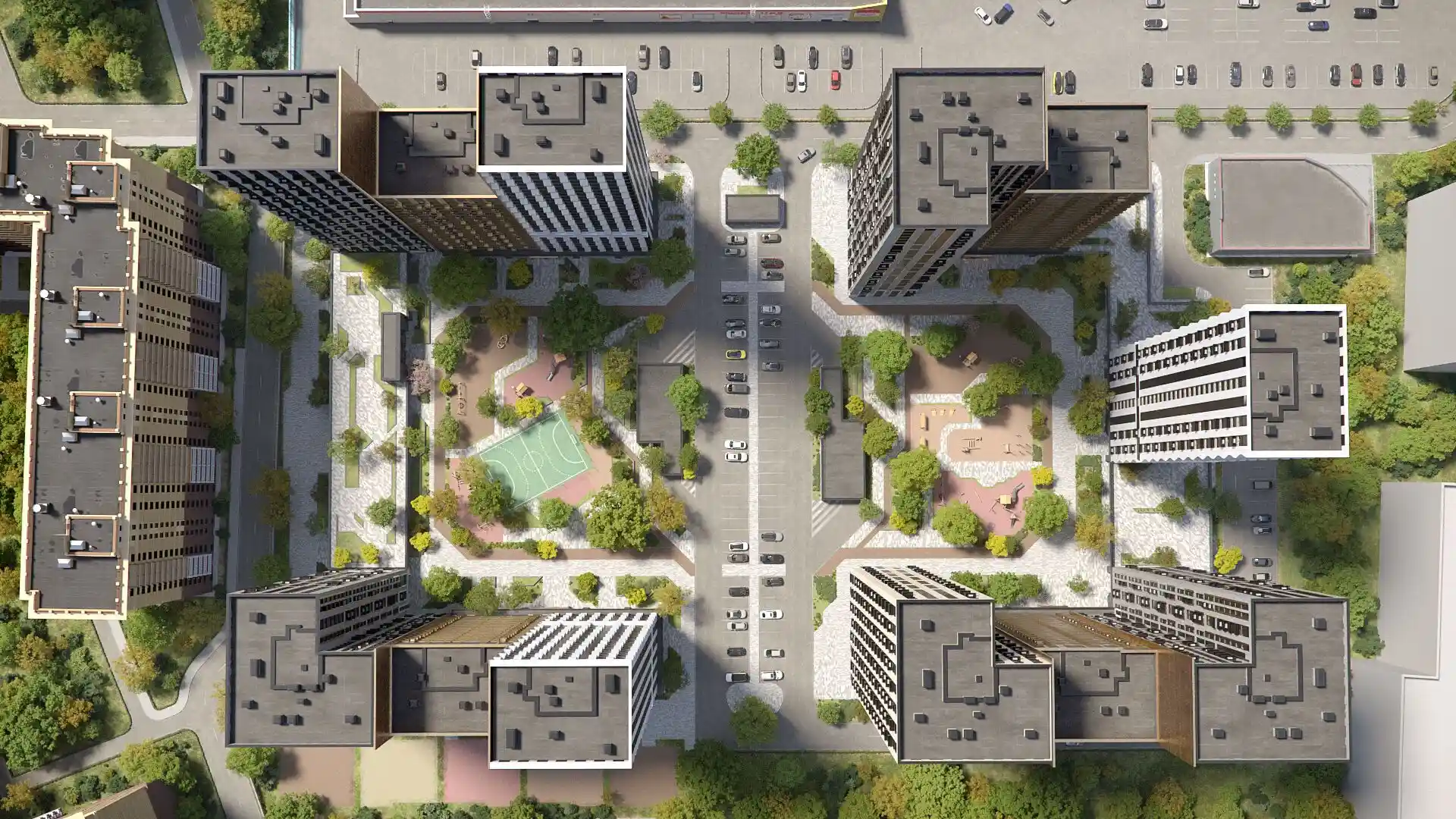 На территории комплекса появится 2 детских сада, один из которых будет в составе первой очереди, собственная общеобразовательная школа на 1100 учеников и медицинский центр с поликлиническим, педиатрическим и стоматологическим отделениями. На первых этажах корпусов будет выделено 8 000 кв. метров площади под коммерцию: здесь откроются магазины, аптеки, салоны красоты и спа, салоны груминга, пункты выдачи товаров, кафе и рестораны.