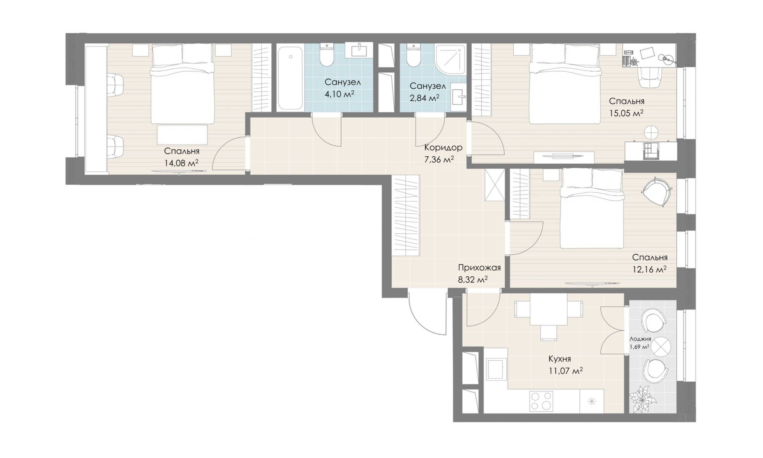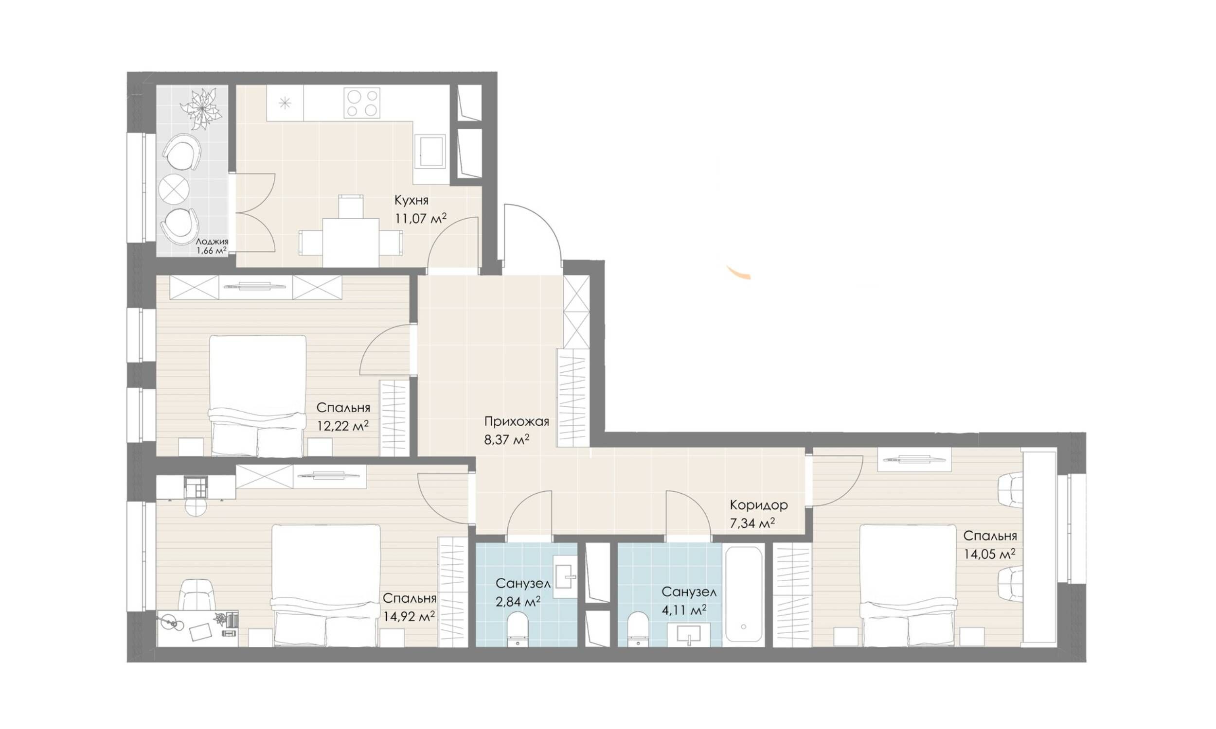 Квартирография ЖК «Дюна» представлена квартирами разного формата и площади — от 26-метровых студий до четырехкомнатных квартир евро формата площадью 92 кв. метра. В проекте есть угловые, распашные и линейные планировки, окна одной квартиры могут выходить на 2 или даже 3 стороны. Есть лоты с теплыми лоджиями, гардеробными комнатами, несколькими санузлами.