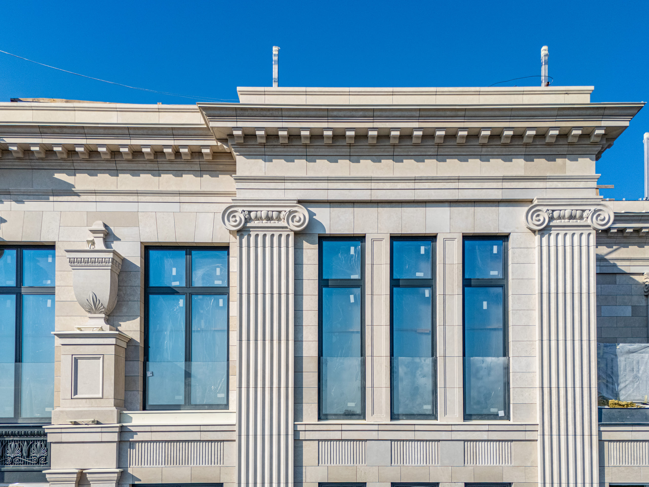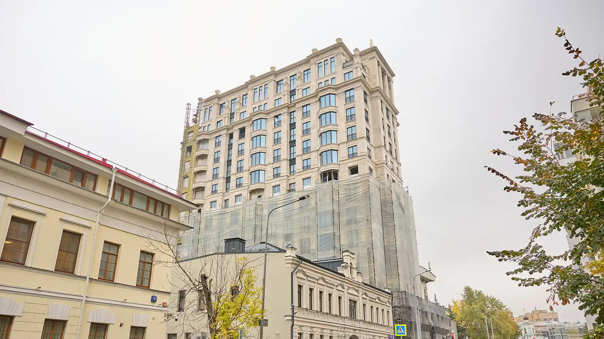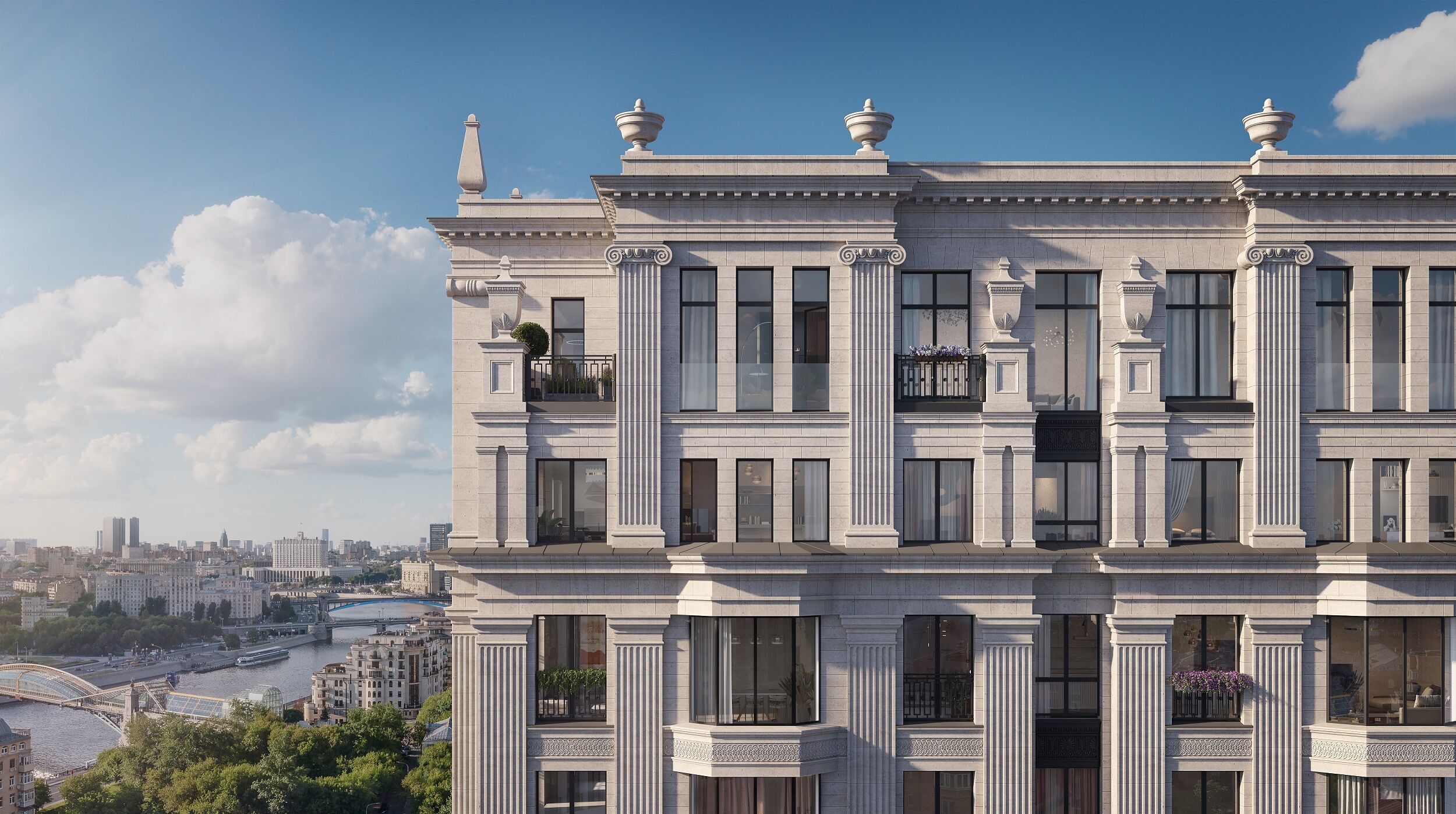 Комплекс представляет собой 14-этажное здание в классическом стиле, в котором расположено 49 квартир и 2 пентхауса площадью от 100 до 336 кв. м. Пентхаусы оснащены кухнями-гостиными, мастер-спальнями, гардеробными и постирочными зонами, а также дополнительными санузлами. Видовые пентхаусы имеют террасы, дровяные камины и бассейны, а их потолки достигают 5 метров в высоту, а окна — панорамные. Пентхаусы сдаются с отделкой по индивидуальному дизайну в классическом стиле.