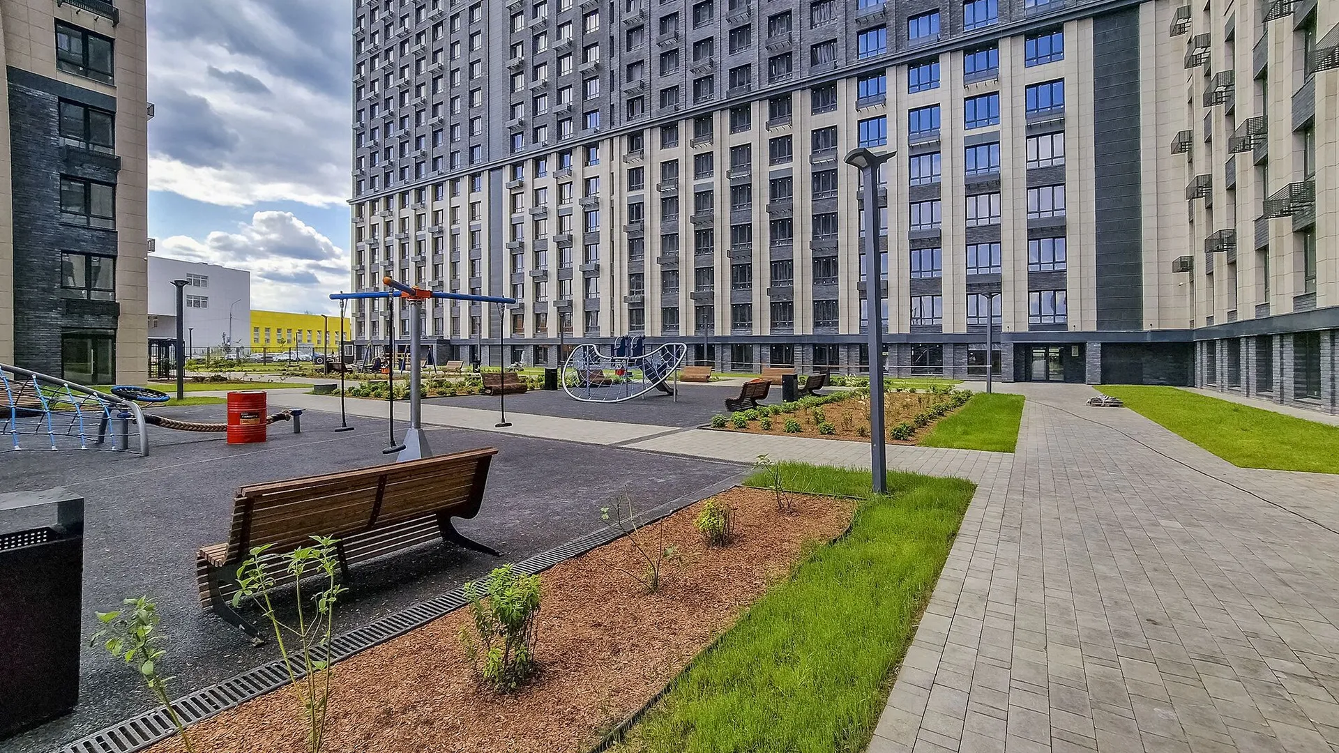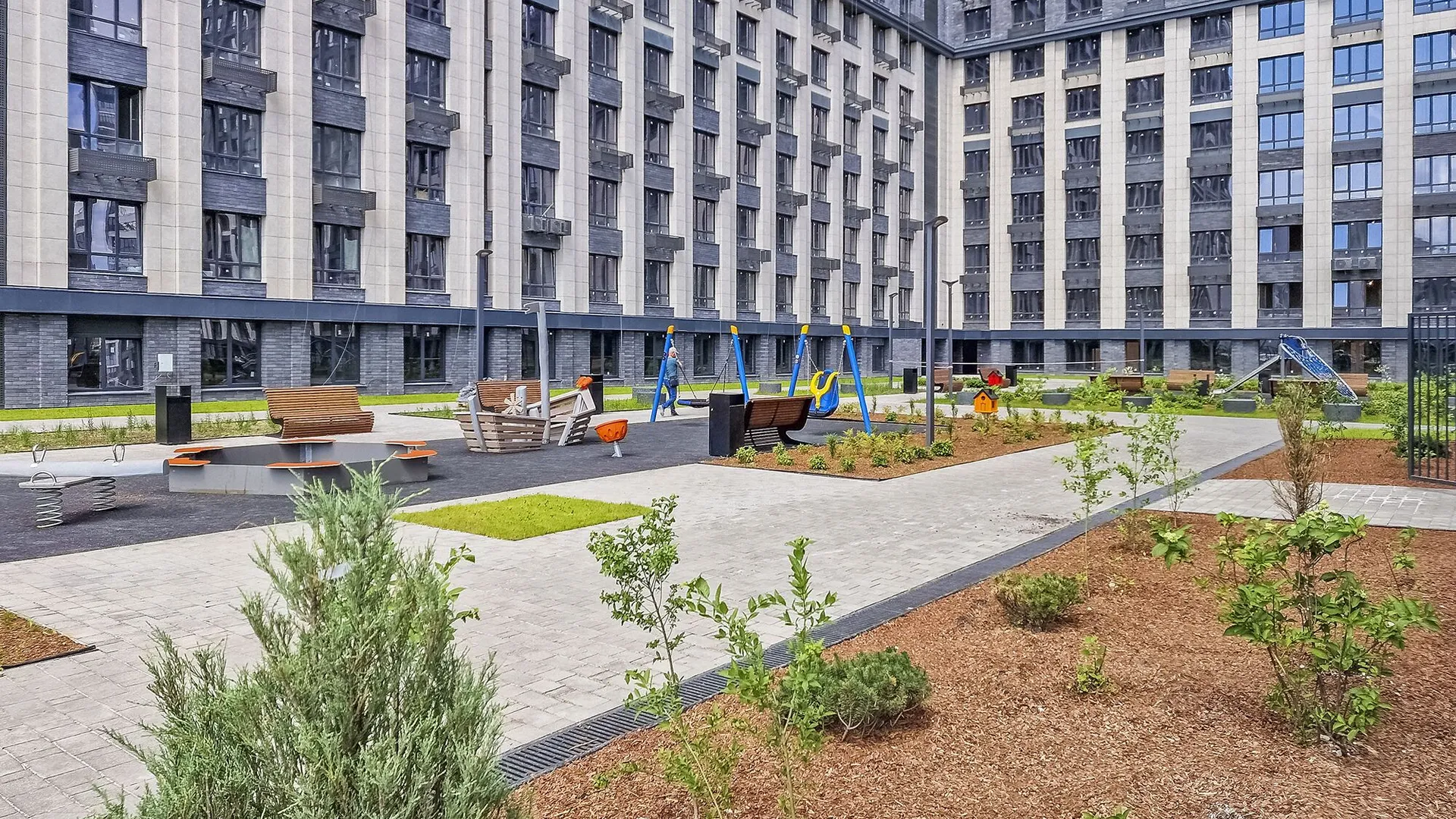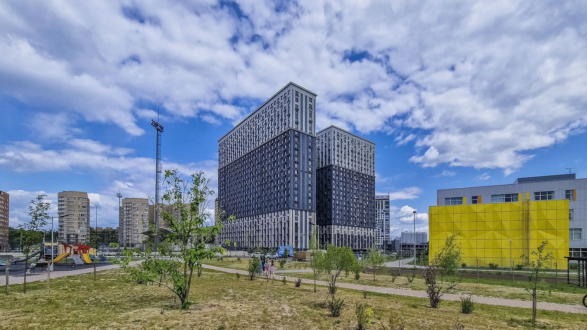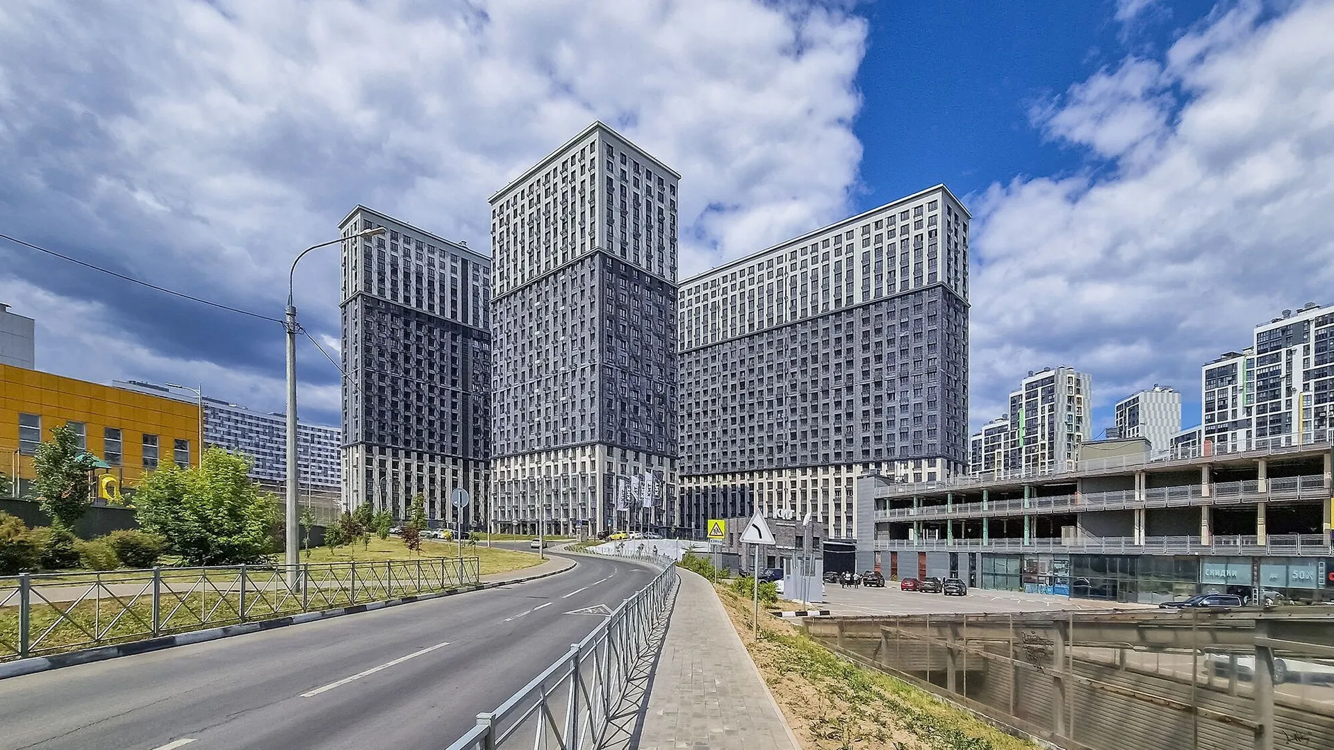 Отличное расположение комплекса, прекрасные виды, вокруг комплекса очень много насаждений, во дворе комплекса очень много детских площадок. Есть подземный паркинг, с возможностью покупки мест для машины. Есть куда сходить с детьми на выходных