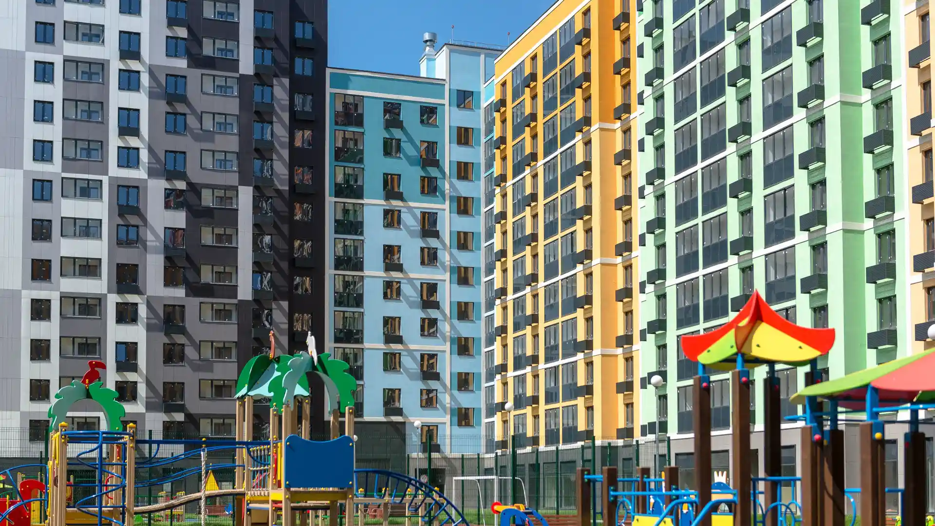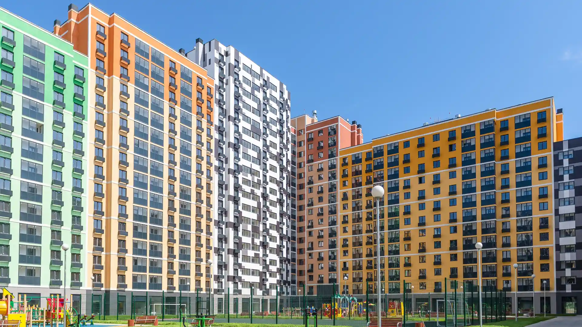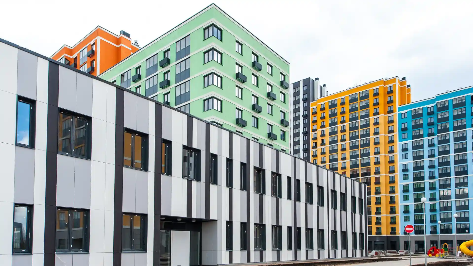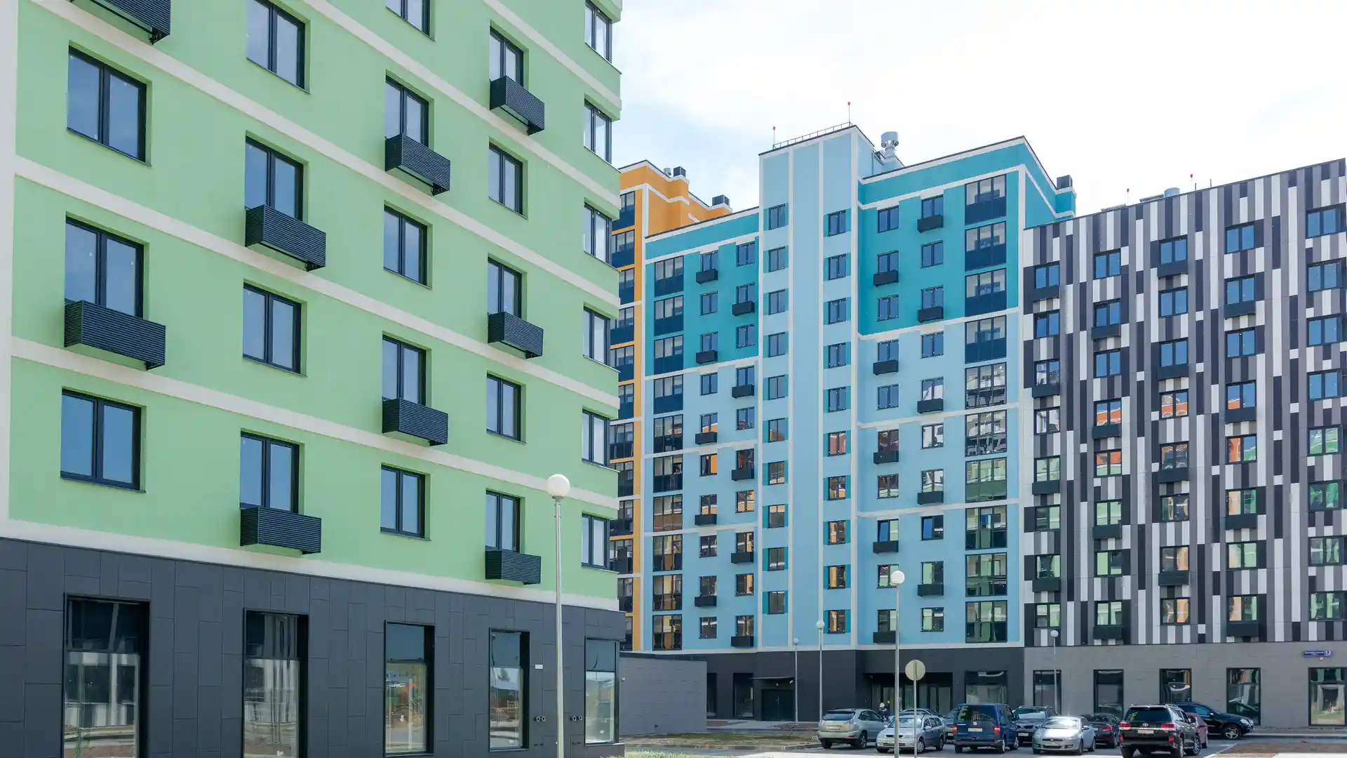 Особое внимание привлекают яркие фасады. Каждая секция имеет свою цветовую гамму, а также свой геометрический рисунок — такое решение позволяет легко ориентироваться на территории комплекса. Первые этажи облицованы декоративным камнем, на верхних этажах есть секции с «индивидуальными фасадами» — они более яркие по сравнению с основным цветом здания.