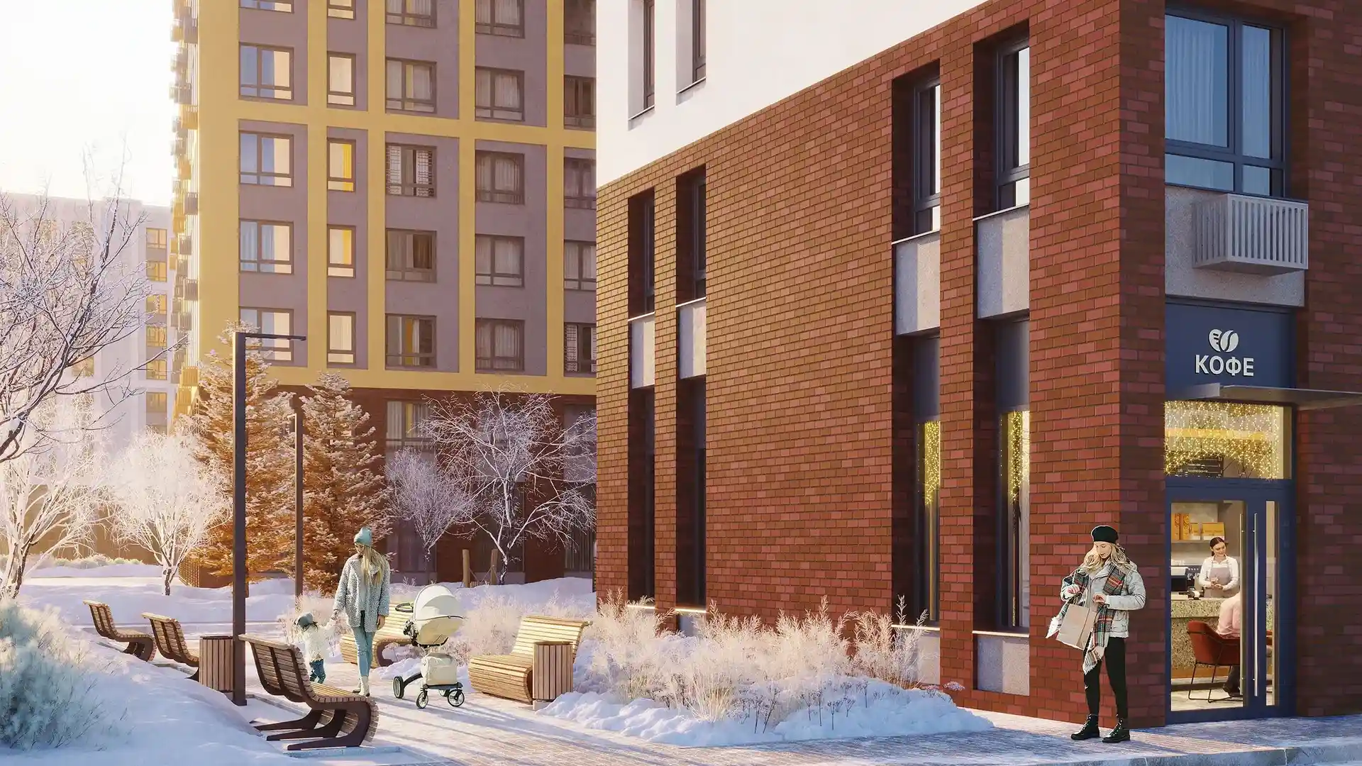 Сквозные подъезды обеспечивают возможность выхода на улицу и во внутренние дворы. Благодаря стеклянным входным группам внутри подъездов светло и безопасно. Рядом со входами предусмотрены помещения для детских колясок и велосипедов.