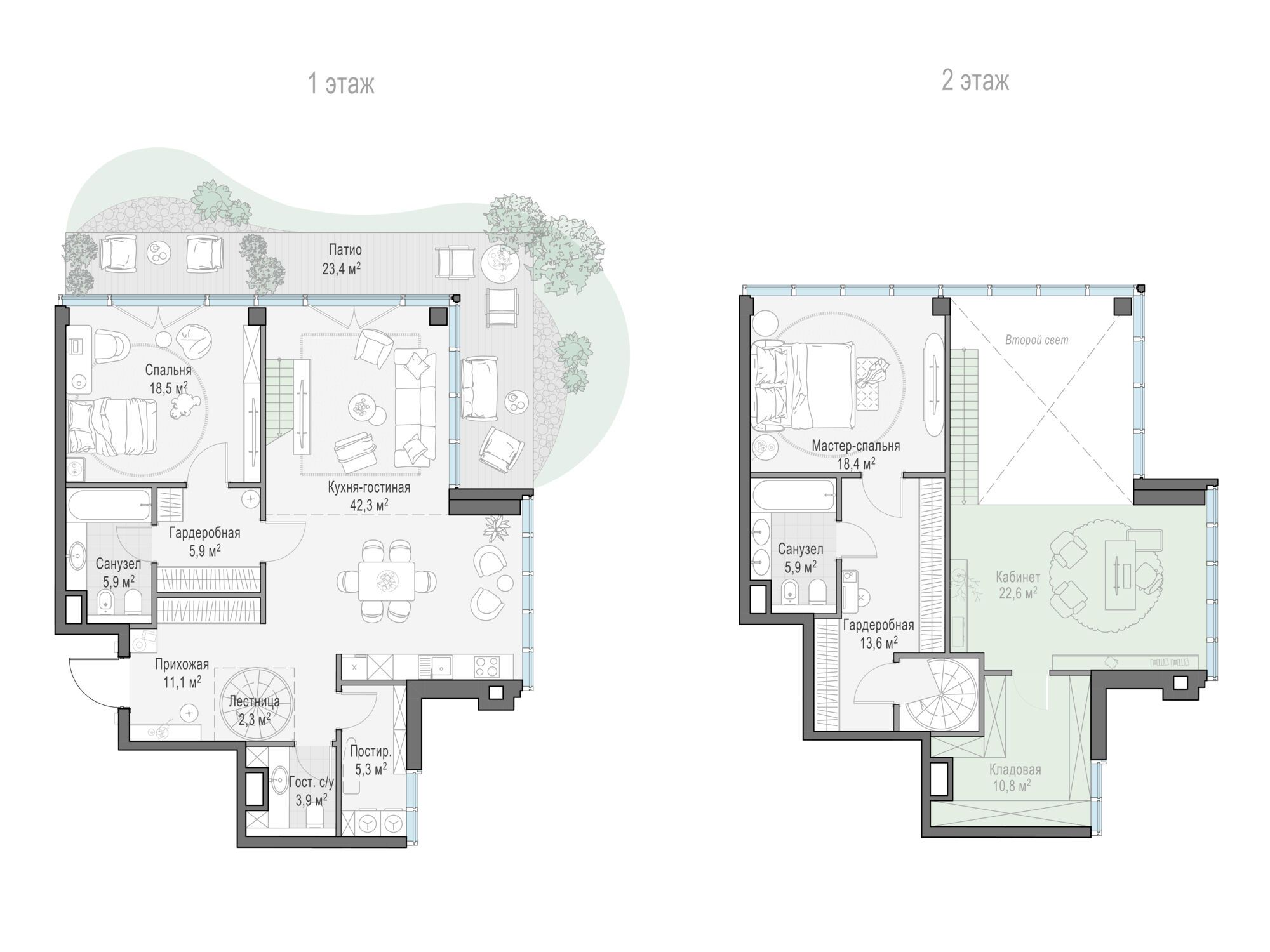 В малоэтажной части в стиле авангард представлены пятиэтажные дома, в каждом из которых всего 15-20 квартир, и двухэтажные виллы. Они расположены вокруг центрального парка, лаконичные снаружи и функциональные внутри, дарят ощущение привилегированной и спокойной загородной жизни. Владельцам самых крупных вилл доступна особая роскошь: собственное патио для утреннего отдыха с чашкой кофе и приватный бассейн — и всё это в самой престижной части мегаполиса.