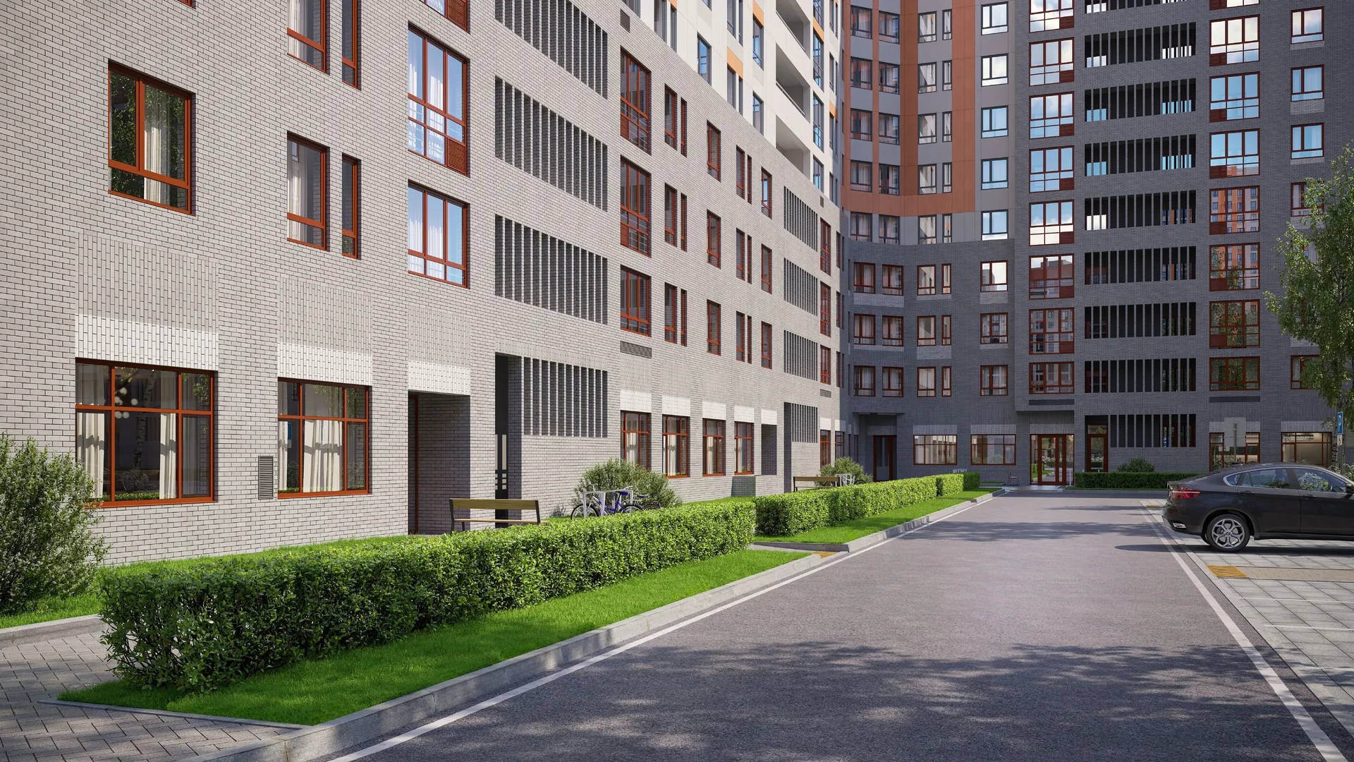 Просторные дворы проекта разработаны с учетом интересов жителей разного возраста и с разными предпочтениями: для детей — детские площадки с игровым оборудованием разного уровня, для взрослых — тренажеры, ворк-аут, площадки для командных игр, места для тихого отдыха, для всех — прогулочные и велосипедные маршруты на территории комплекса.