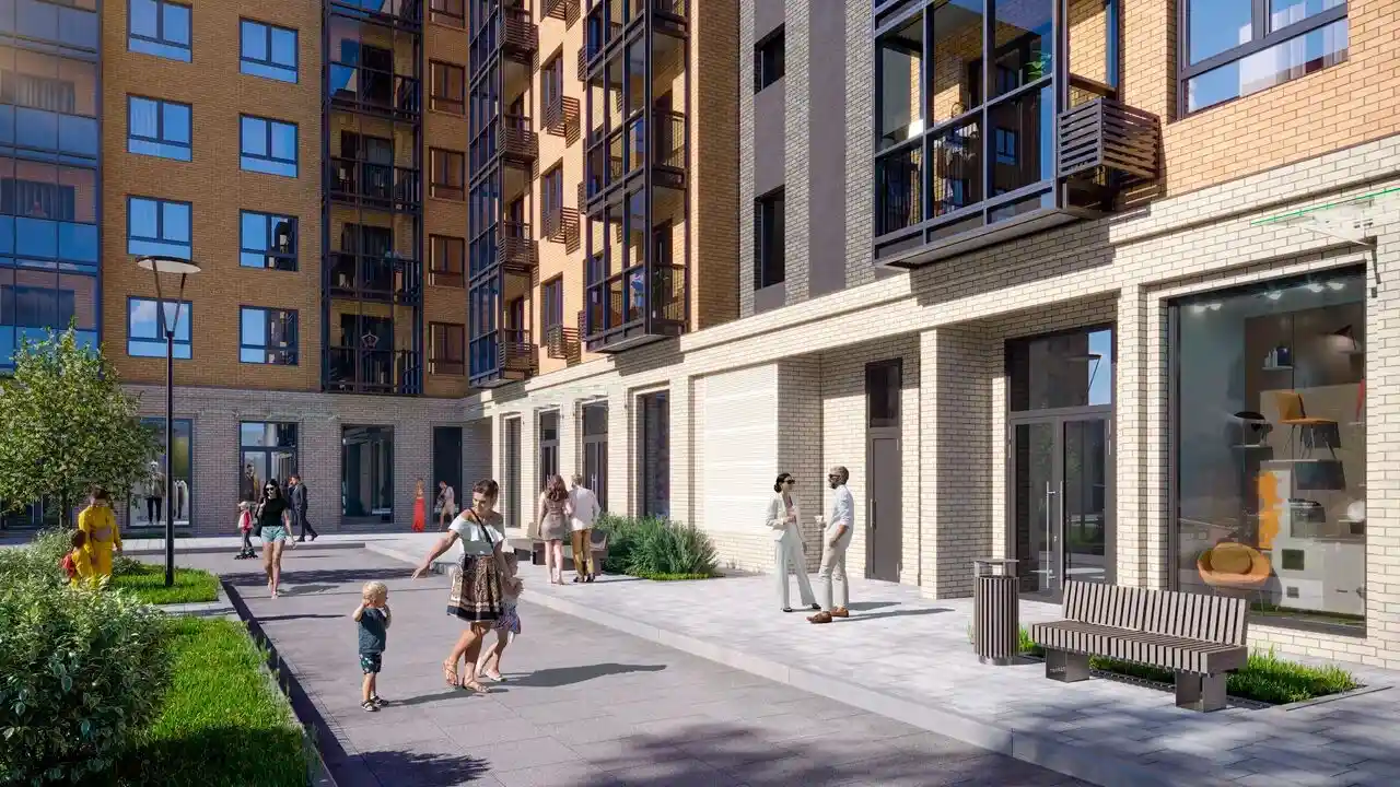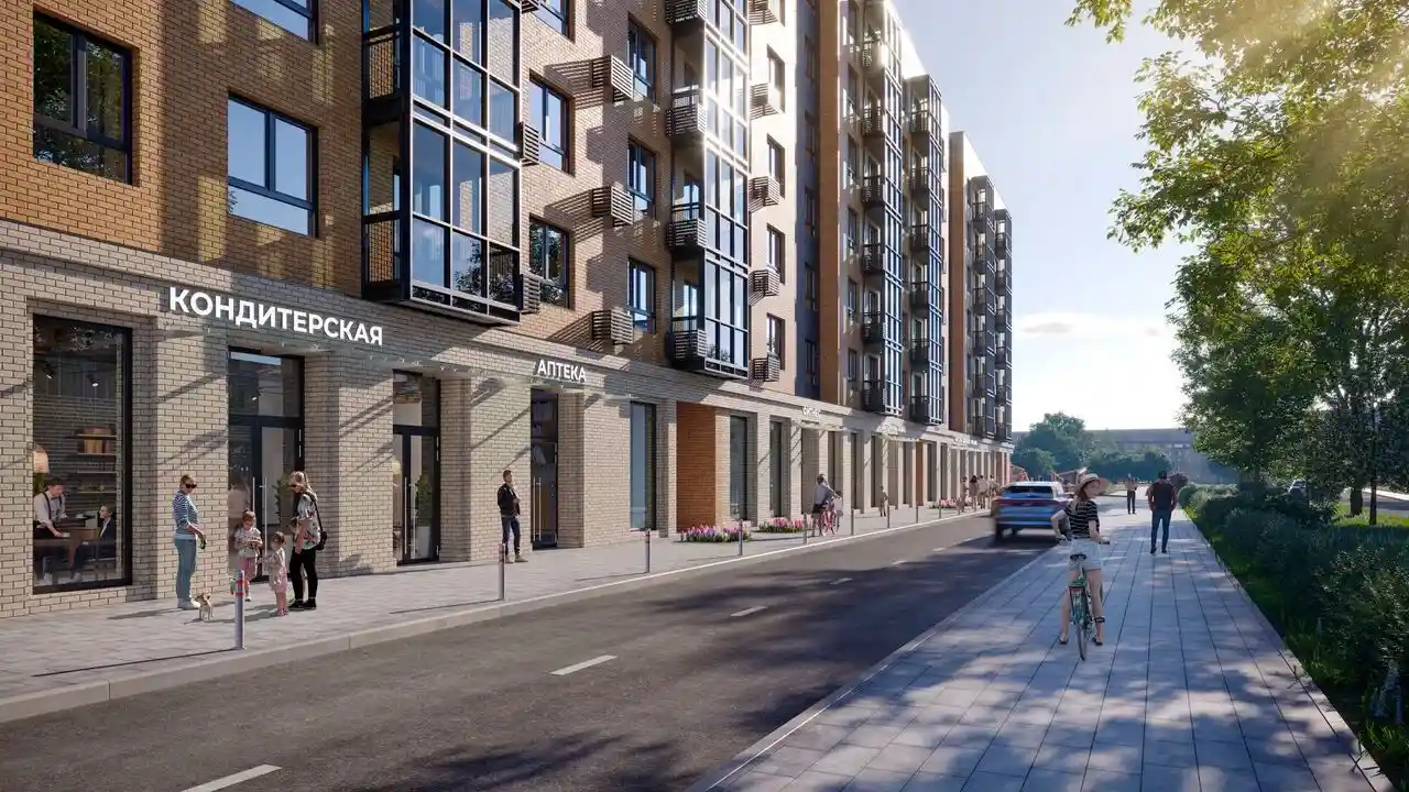 Придомовая территория будет благоустроена: запланированы детская и спортивная площадки, озеленение с газонами. Внутренний двор закрыт с двух сторон стенами корпуса, что создаёт ощущение уединённости. Для автовладельцев предусмотрено 140 машино‑мест на придомовой территории и ещё 59 — вне её пределов. На цокольных этажах разместятся коммерческие помещения: магазины, кафе, кондитерские, салоны красоты. Также доступны кладовые помещения площадью от 3 до 8 м².