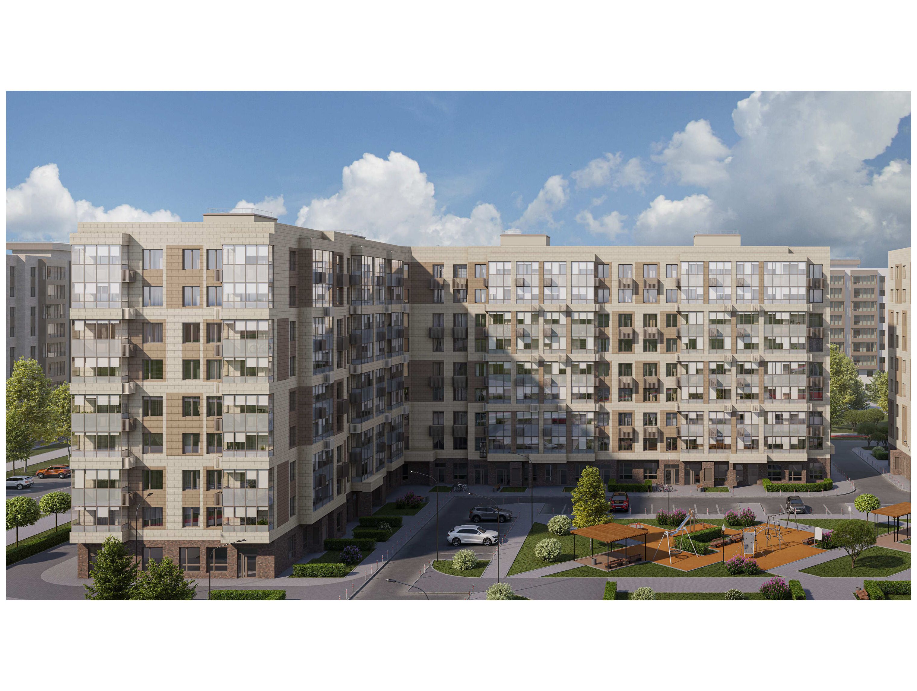 Территория квартала благоустраивается в соответствии с современными тенденциями: во дворах устанавливаются детские и спортивные площадки с безопасным резиновым покрытием, размещаются места для спокойного отдыха. Зоны для парковки личного транспорта выделены между жилыми блоками.