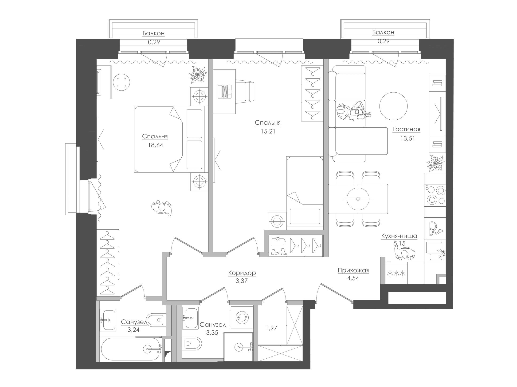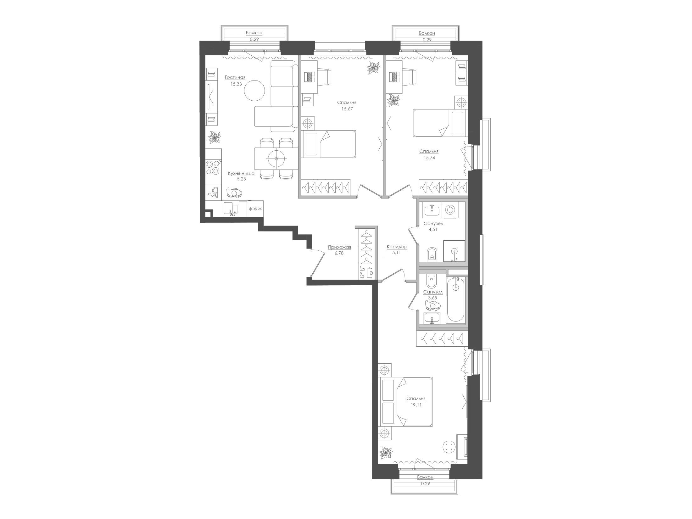 Площади жилья варьируются от 25 до 116 квадратных метров, предоставляя возможность выбора в соответствии с потребностями и предпочтениями будущих жителей. Каждая квартира предлагается в трех вариантах отделки: от базовой черновой до улучшенной предчистовой, а также с полностью готовым косметическим ремонтом «под ключ».