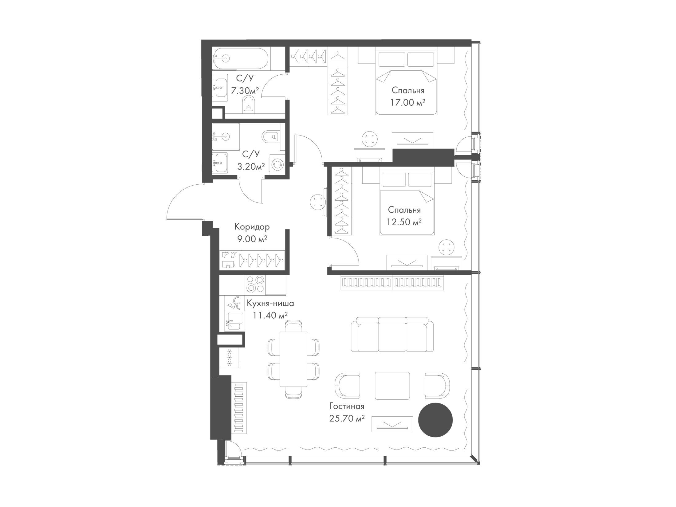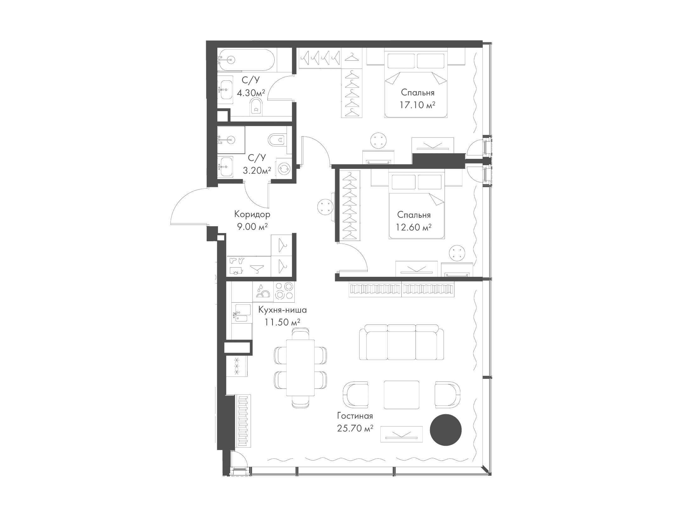 Здесь можно найти десятки вариантов планировок, начиная от студийного типа и заканчивая просторными четырехкомнатными квартирами площадью 113.1 кв. м. Все апартаменты отличаются высотой потолков не менее 3.08 метров.