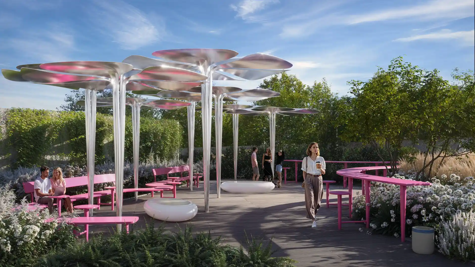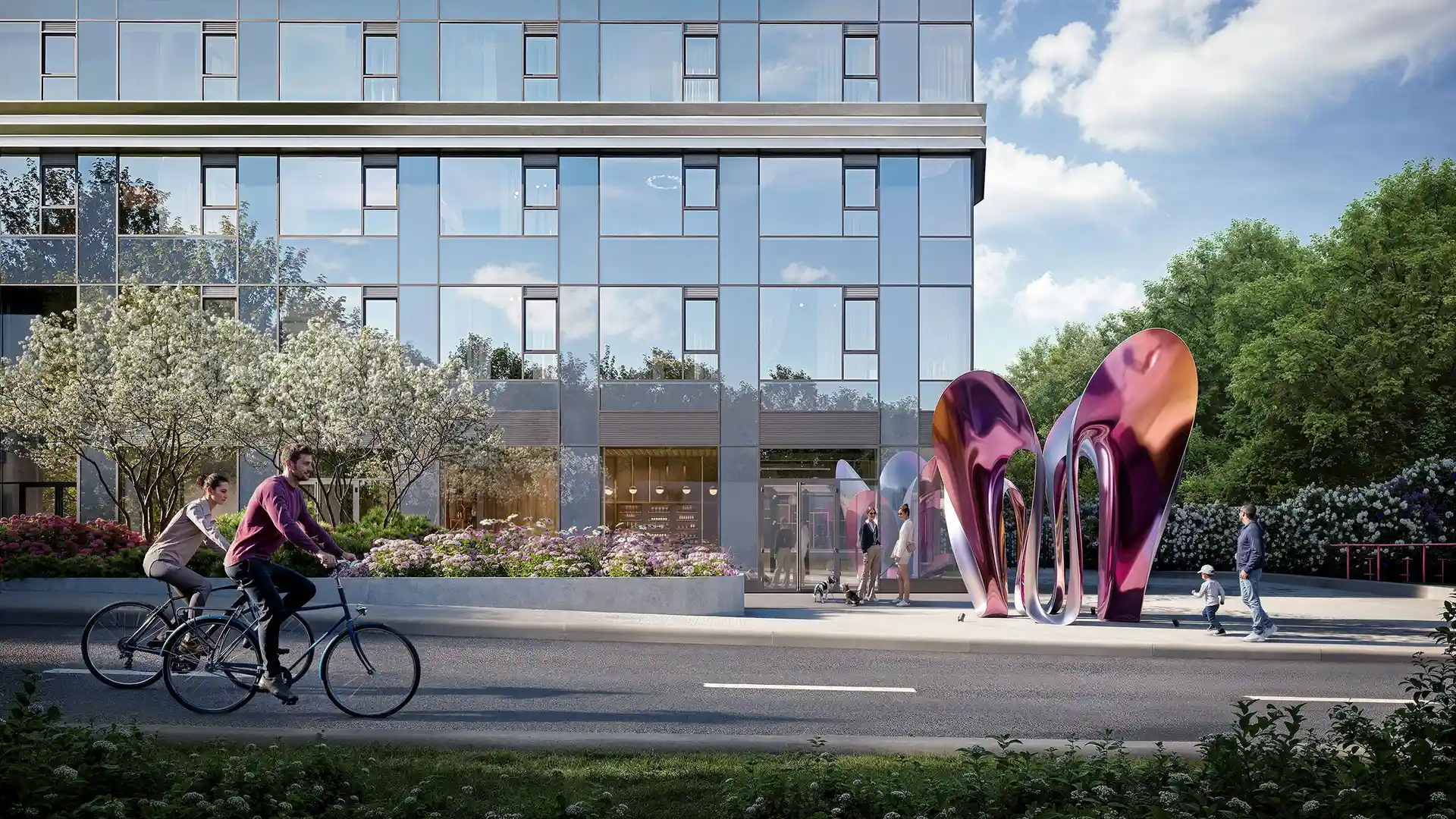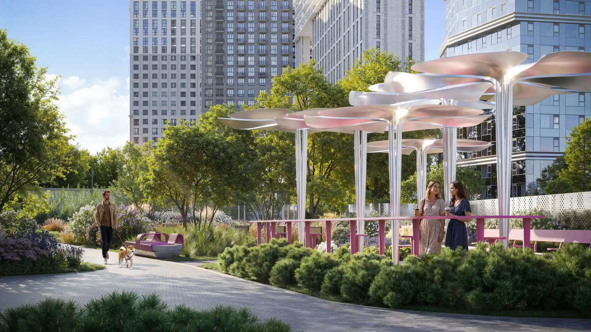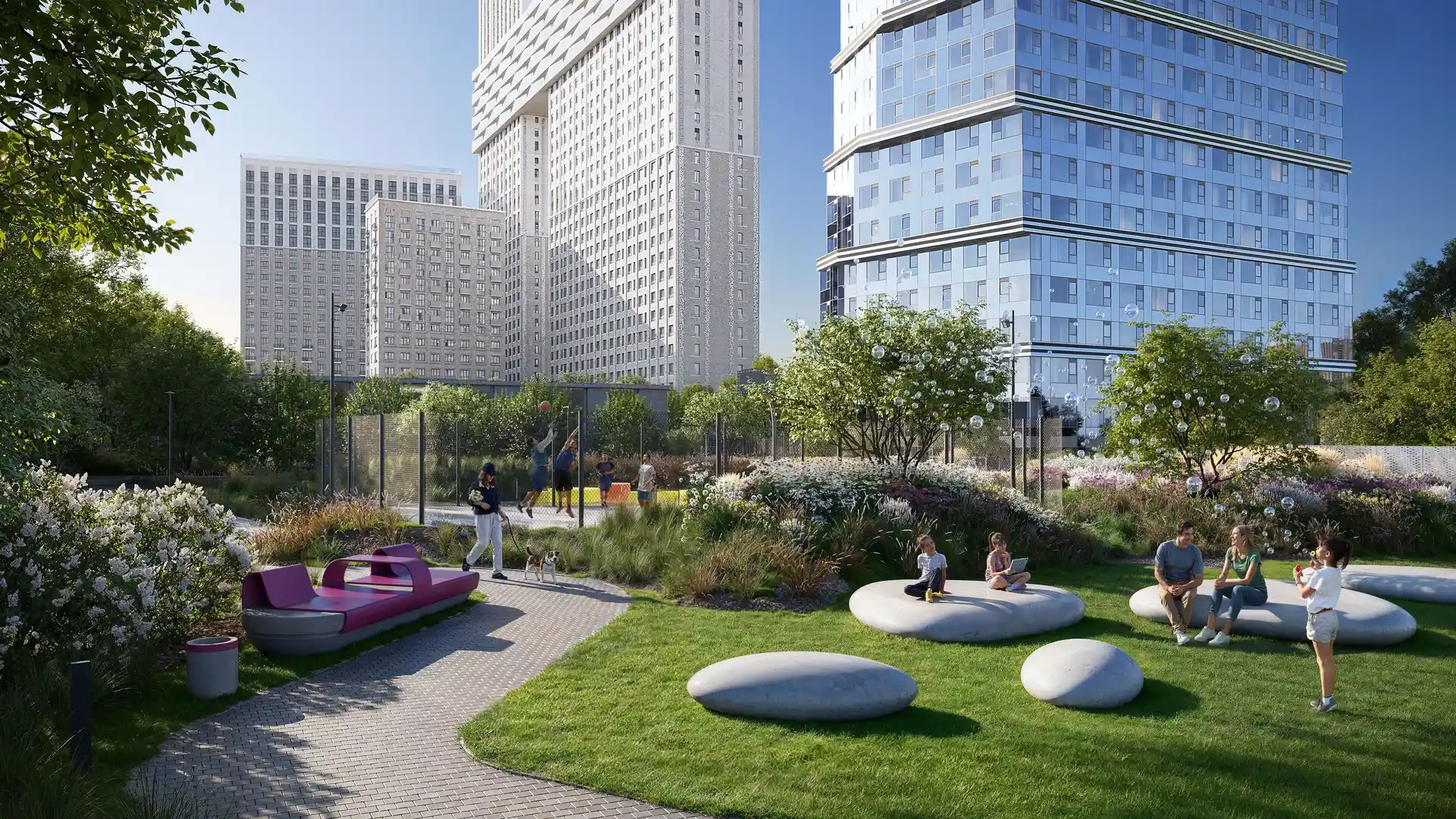 Территория комплекса благоустроена с учётом разнообразных потребностей жителей. Ландшафтный парк с шаговыми тропами и искусственными холмами разделён на активные и уединённые зоны. Для любителей спорта оборудованы павильон для падел‑тенниса (современного микса тенниса и сквоша), площадка для стритбола, столы для пинг‑понга и зона воркаута под открытым небом. Дети оценят двухуровневую игровую площадку, а для отдыха взрослых предусмотрены беседки, открытый амфитеатр и уличные рабочие станции.