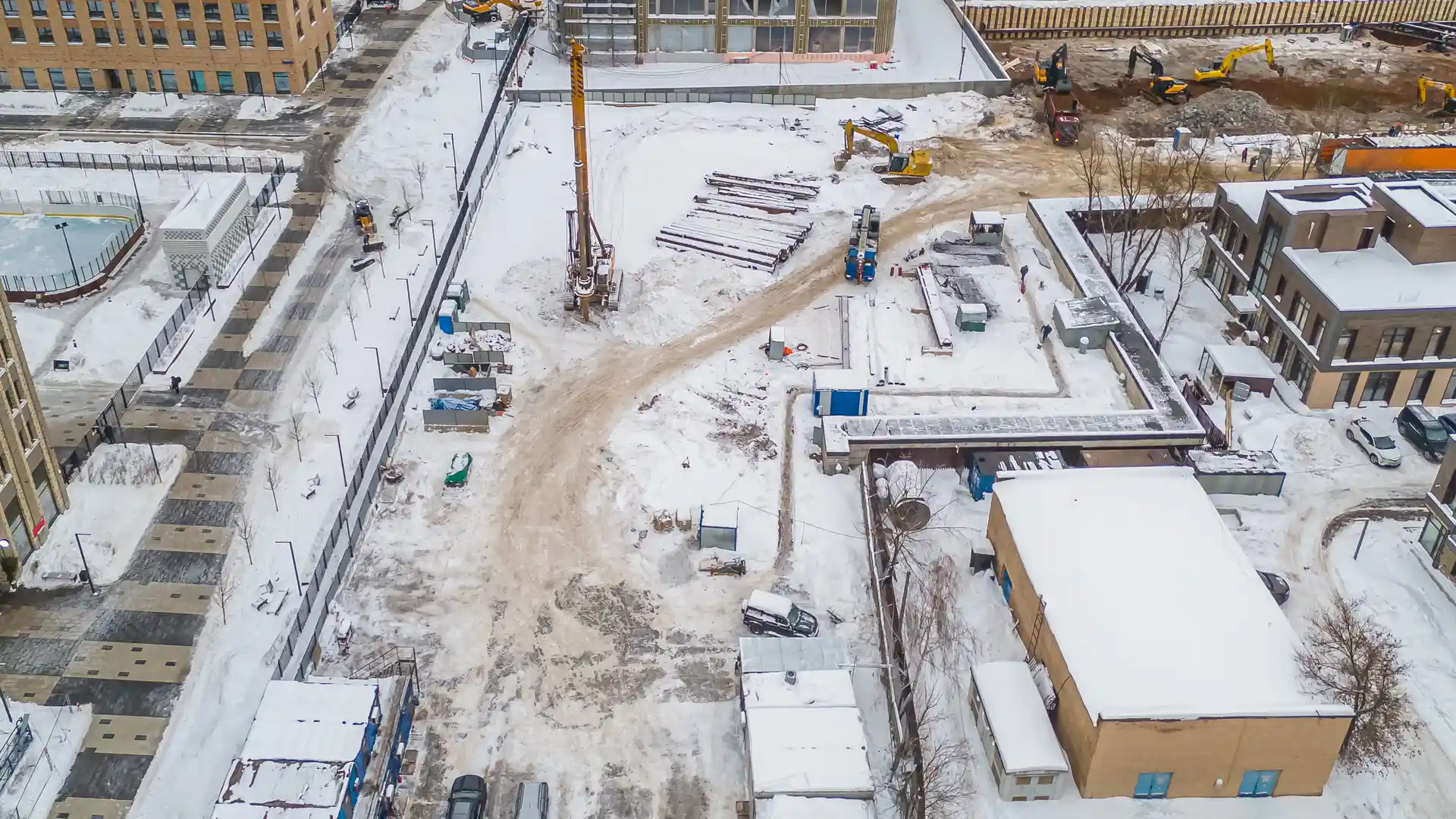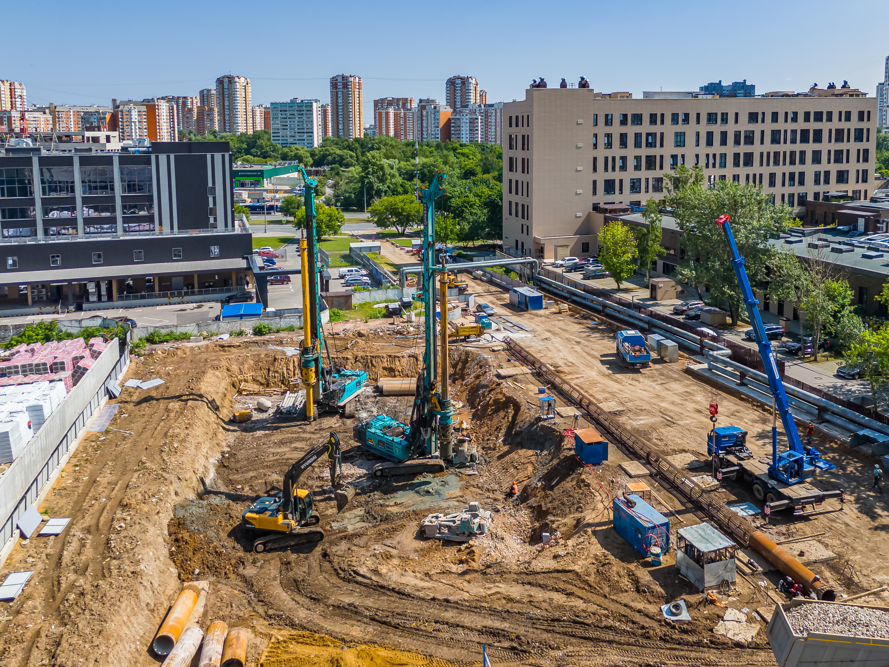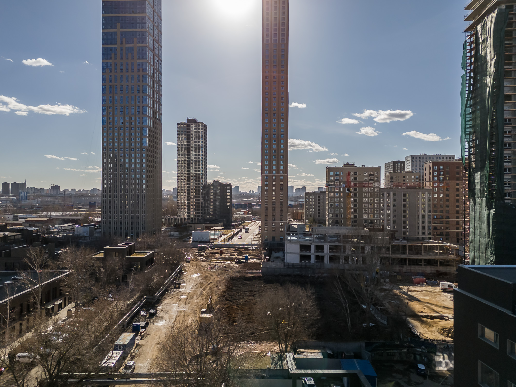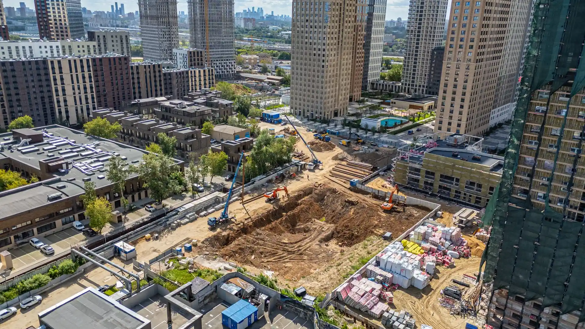 В стадии строительства находятся другие масштабные проекты. ЖК HideOut возводится в 3‑м Сетуньском проезде и представляет собой две башни высотой 34 и 49 этажей, объединённые мостом. Общая площадь комплекса — 51 500 м², предусмотрено 665 квартир от студий до четырёхкомнатных, включая двухуровневые лоты с патио и пентхаусы. На территории будет организован подземный паркинг на 557 машино‑мест, а ввод объекта в эксплуатацию запланирован на II квартал 2028 года.