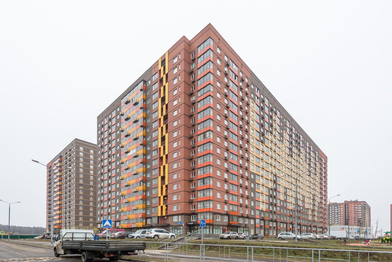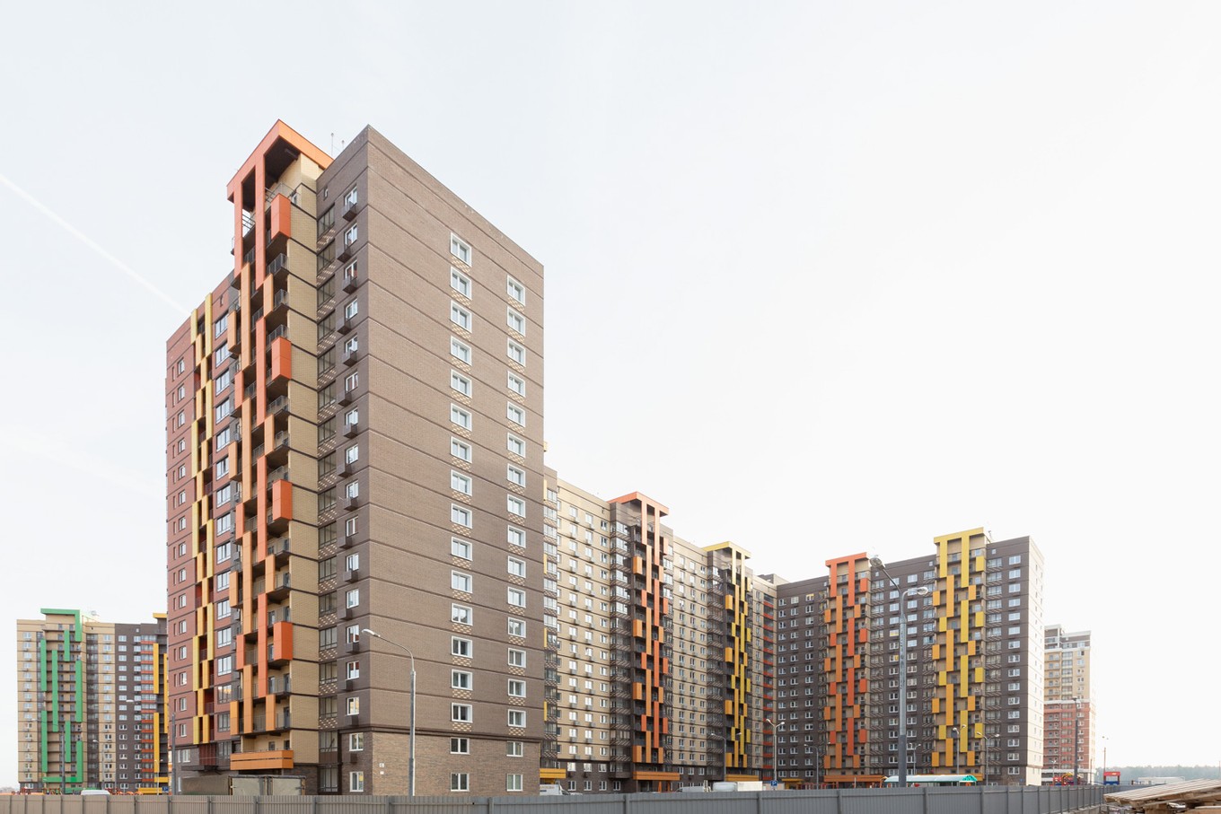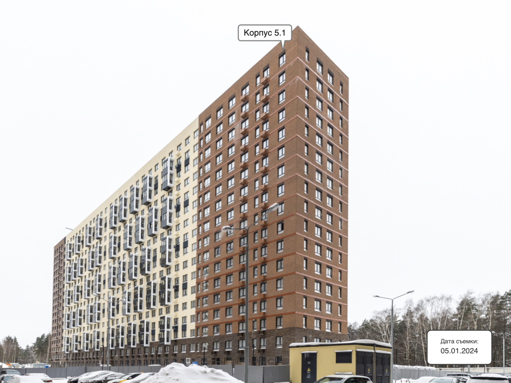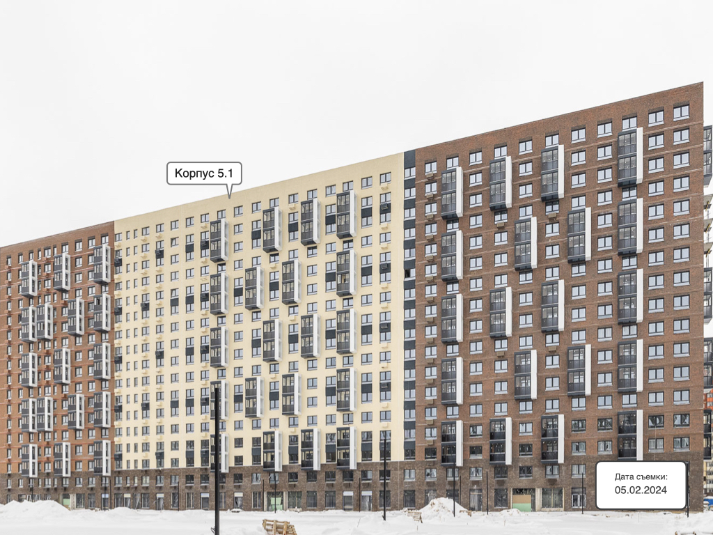 Высота всех зданий в жилом комплексе — 17 этажей. Корпуса отделаны кирпичом природных оттенков, входные группы выполнены на уровне земли, а освещение подъездов в светлое время суток обеспечивают панорамные окна и стеклянные двери.