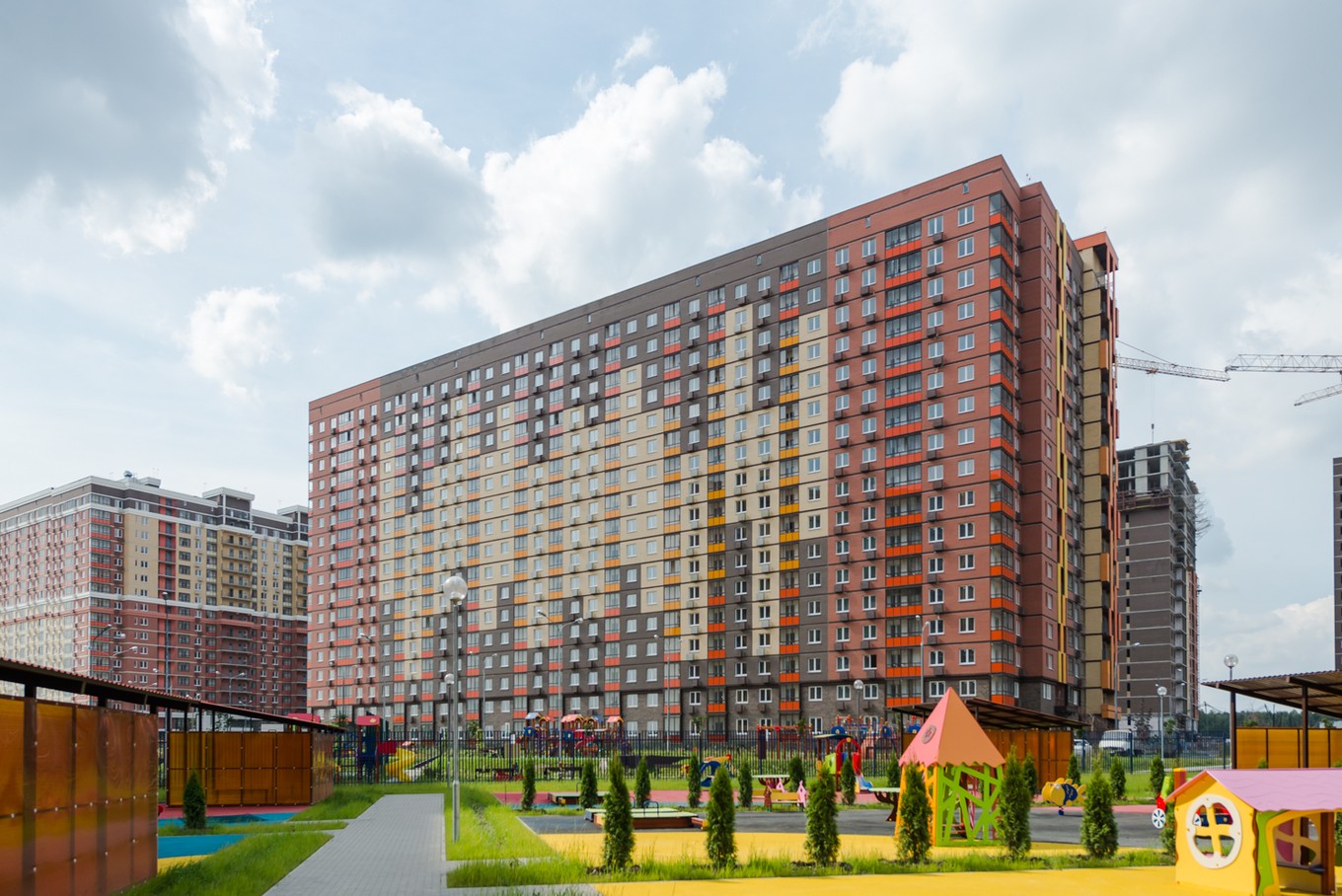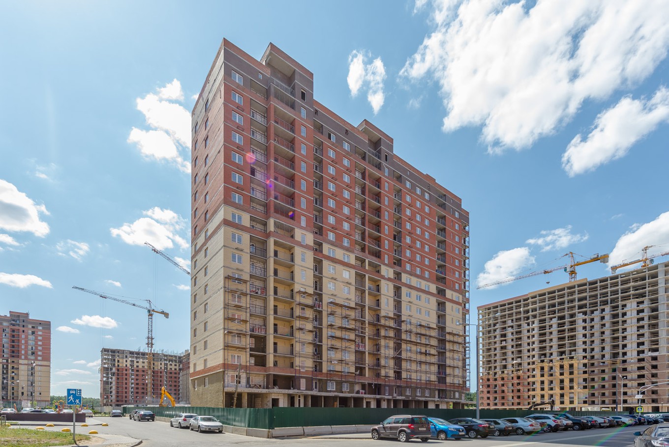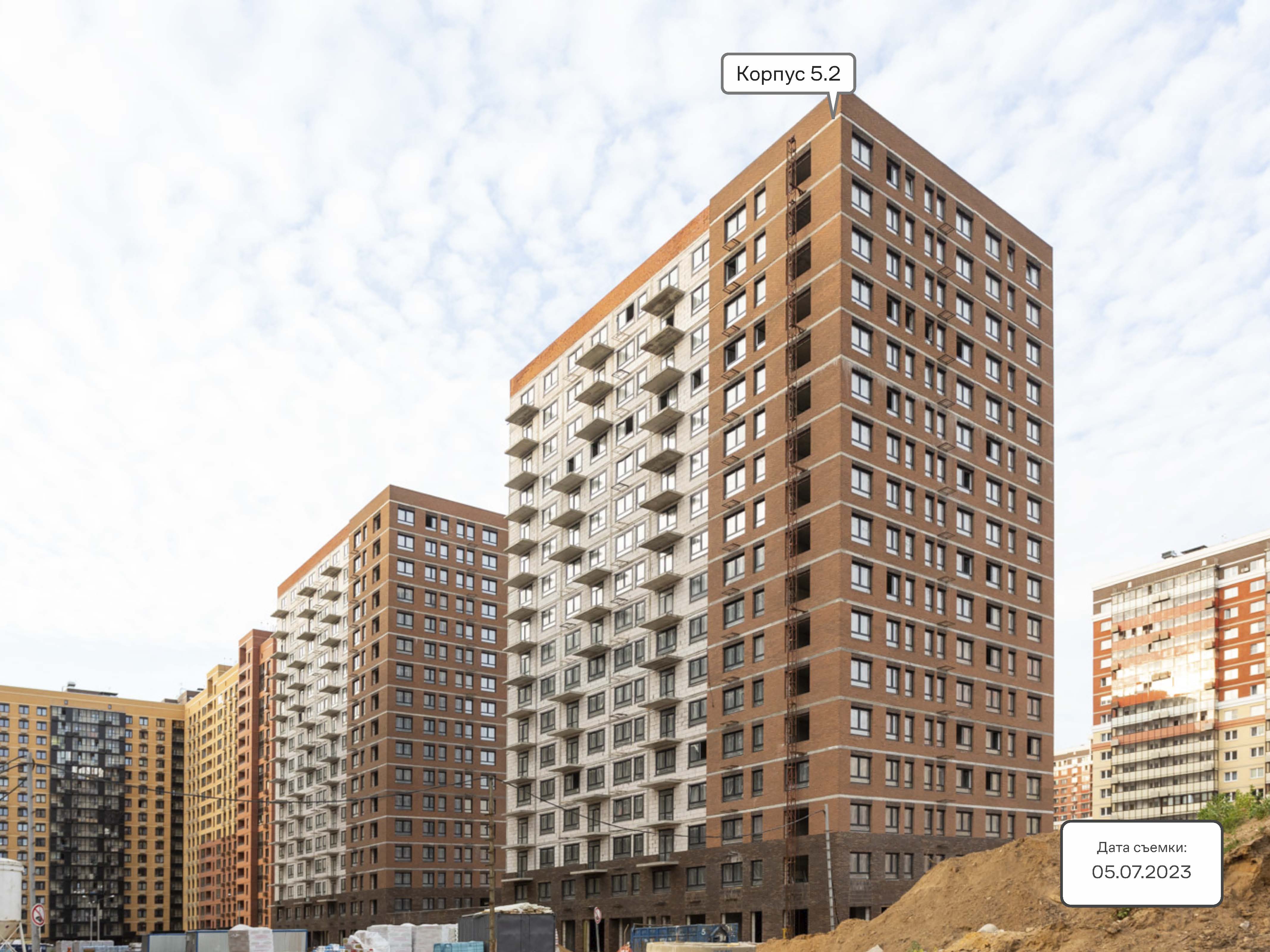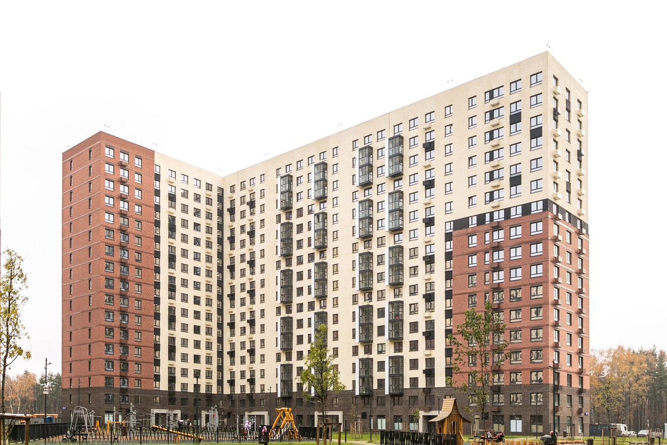 Высота всех зданий в жилом комплексе — 17 этажей. Корпуса отделаны кирпичом природных оттенков, входные группы выполнены на уровне земли, а освещение подъездов в светлое время суток обеспечивают панорамные окна и стеклянные двери.