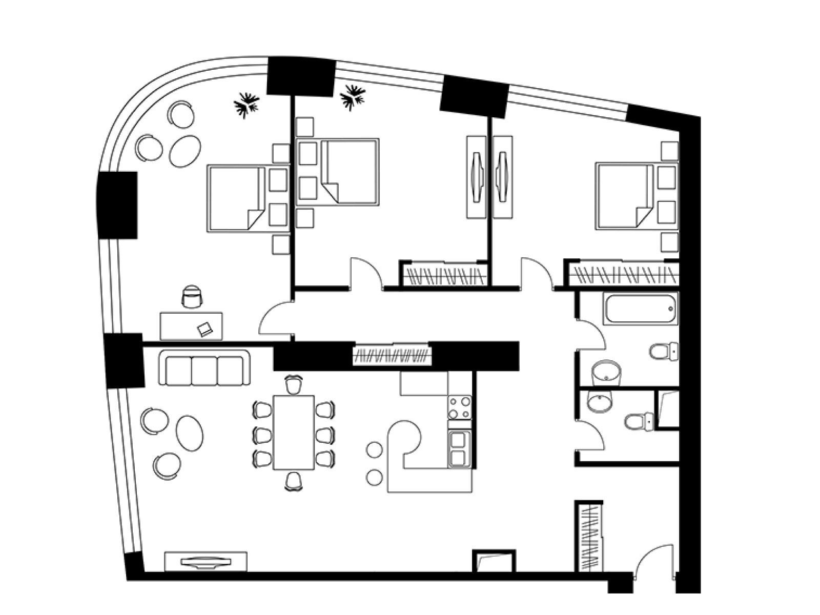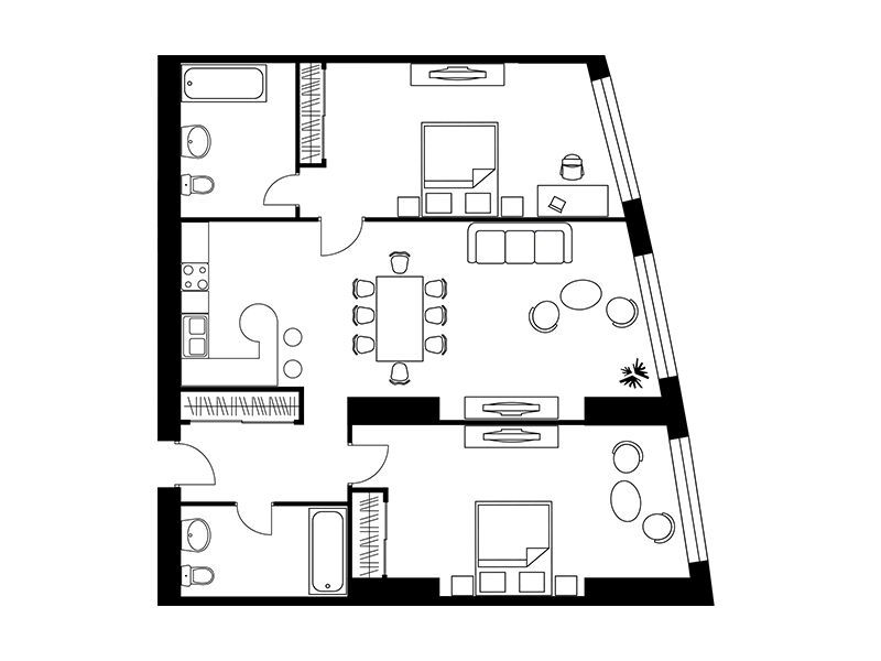 Площадь каждой квартиры варьируется от 48 до 167 квадратных метров. Жилье предлагается с улучшенной предчистовой отделкой или с дизайнерским ремонтом. Также жильцы могут воспользоваться удобствами такими, как кабины для консьержей и кладовые для хранения сезонного имущества.