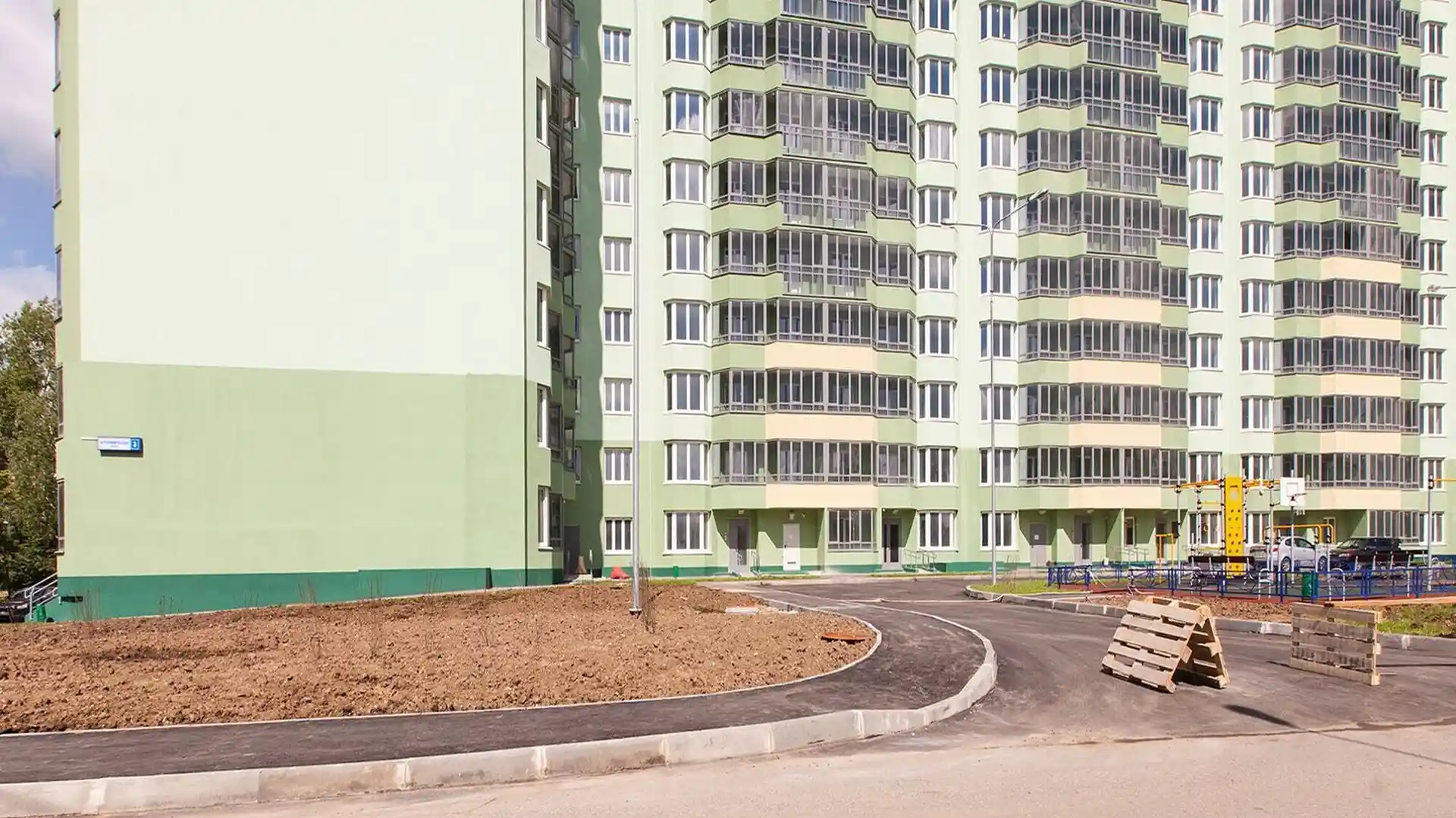 Территория комплекса благоустроена: во дворе размещены детская игровая площадка с безопасным покрытием, стадион и зона с тренажёрами. Проведено комплексное озеленение и декоративное оформление дворового пространства.