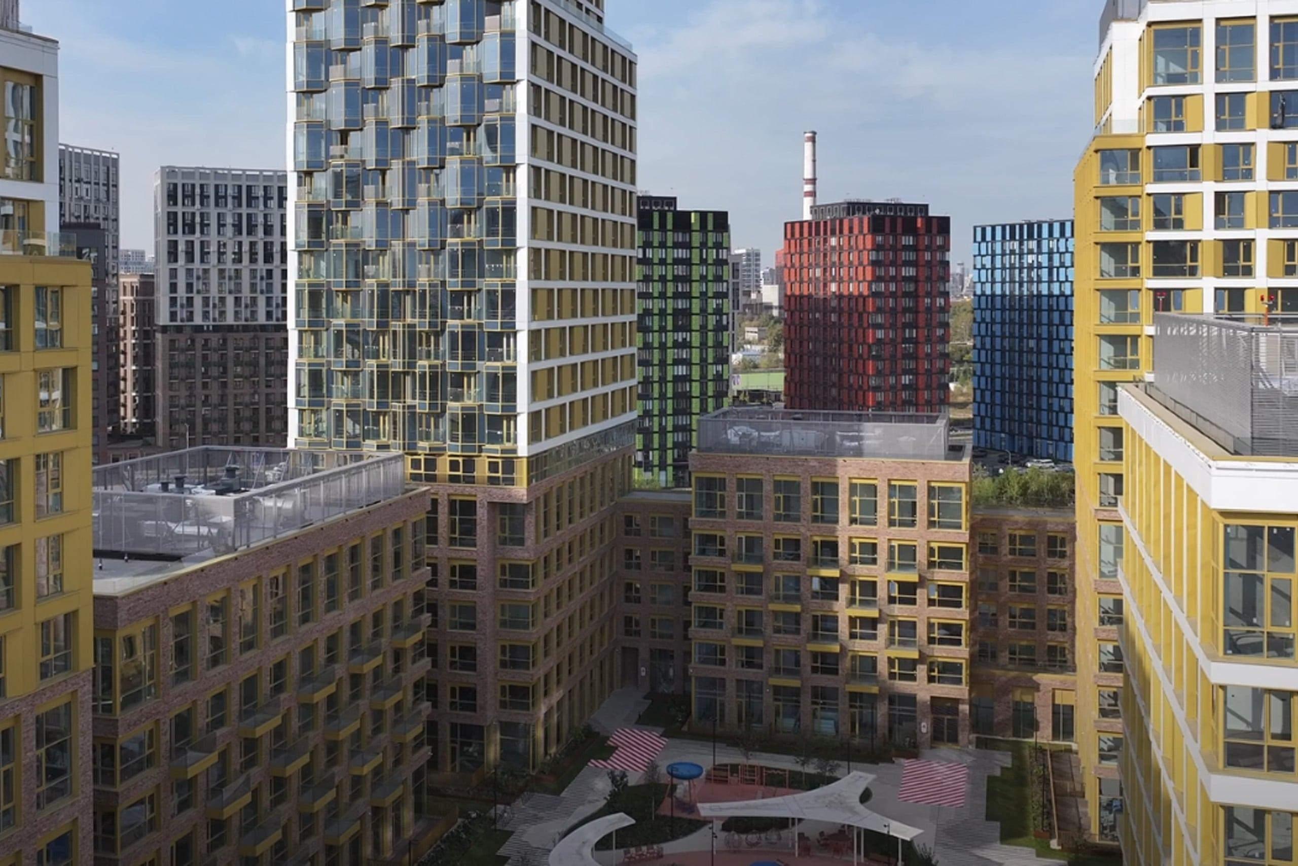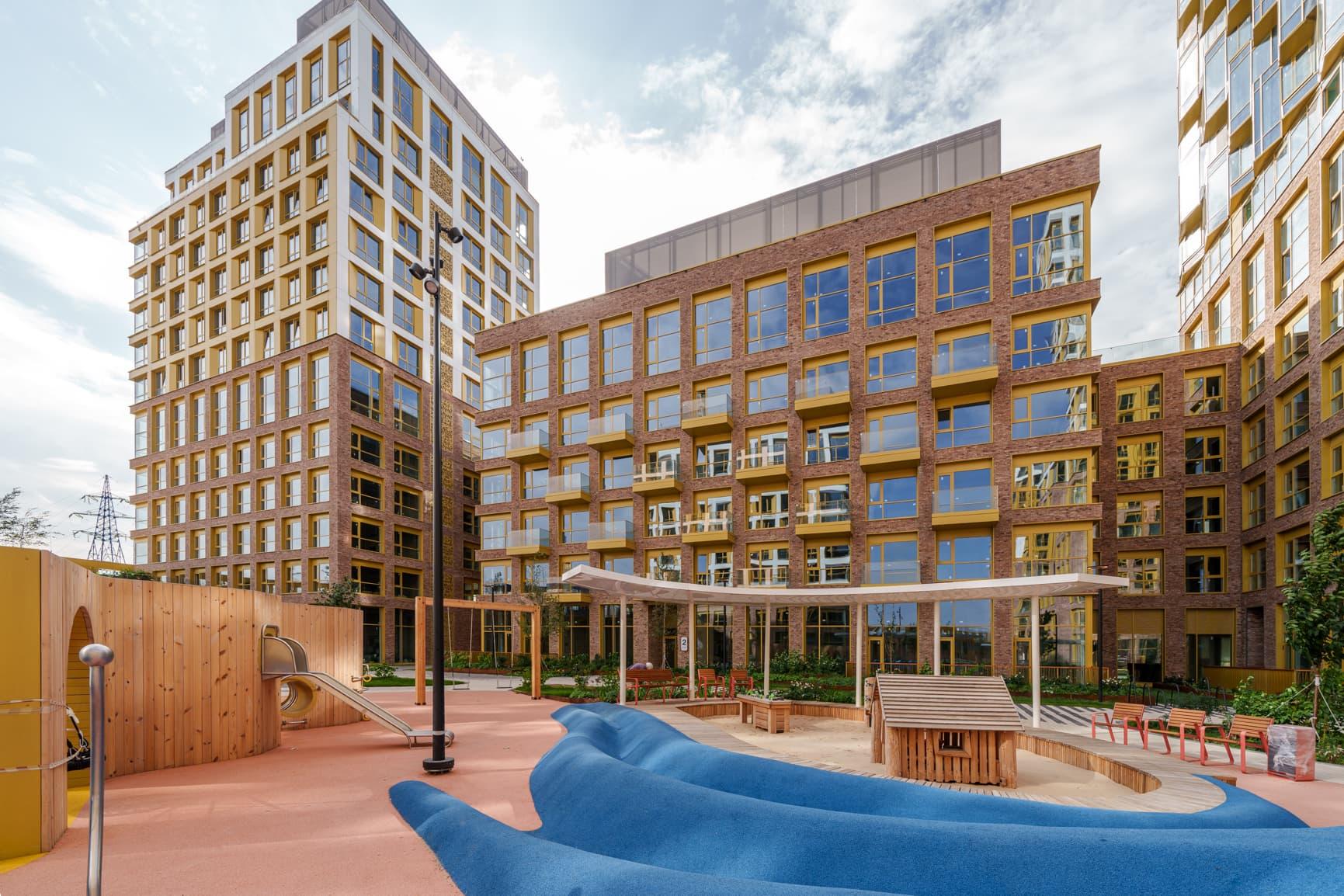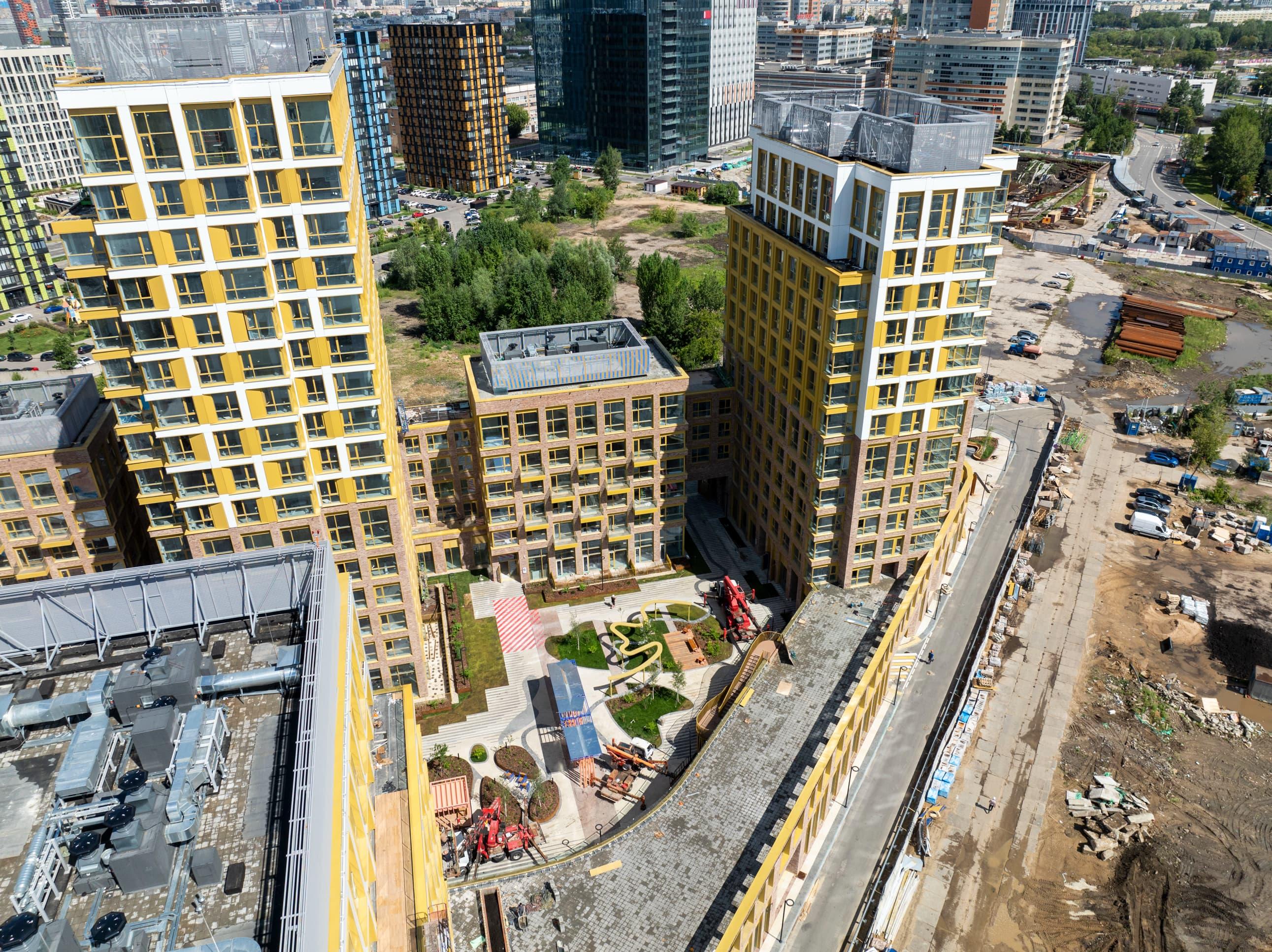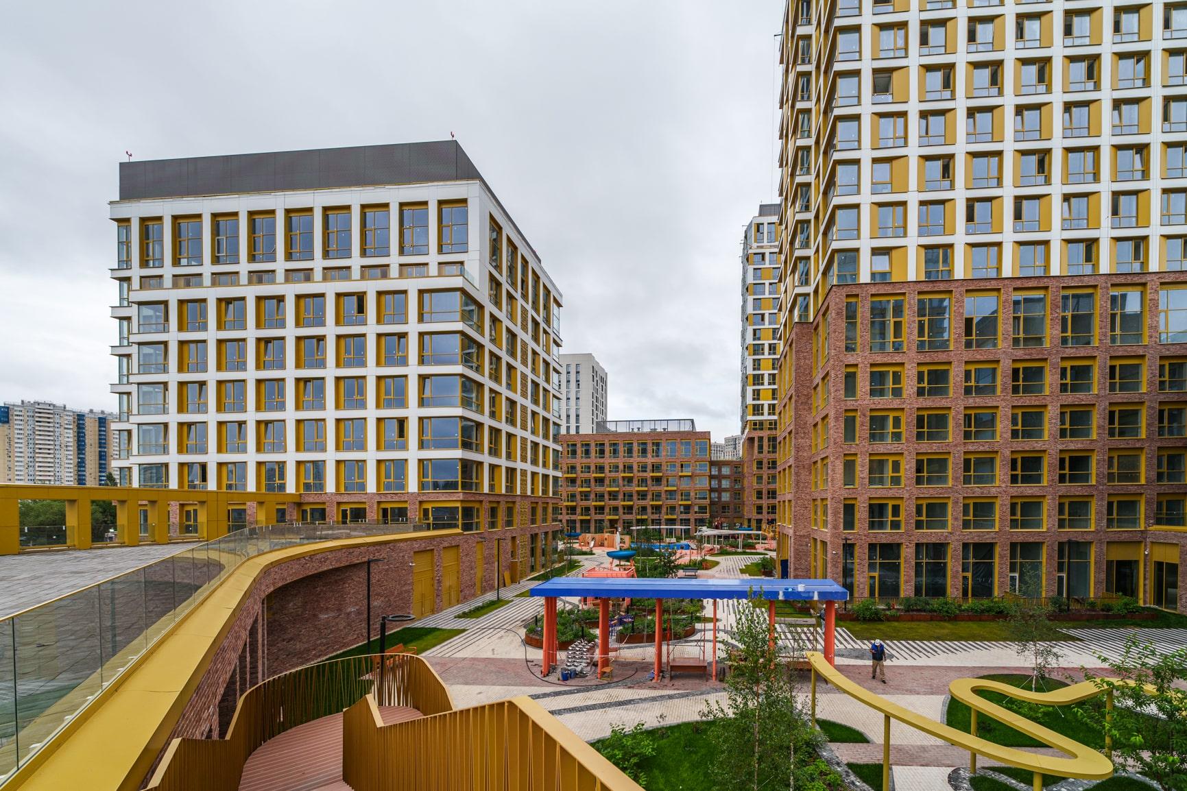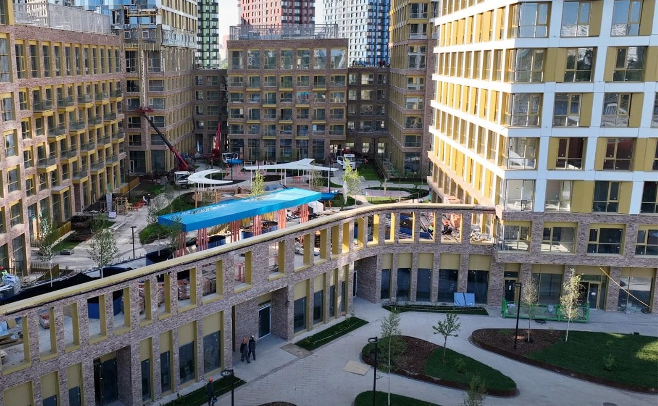 Особое внимание уделяется благоустройству территорий. Дворы проектируются по концепции «двор без машин»: парковочные места выносятся за пределы жилой зоны, а внутренние пространства отдаются под зоны отдыха, детские и спортивные площадки. В проектах предусмотрены зелёные насаждения, прогулочные аллеи, велодорожки и места для выгула домашних животных. На первых этажах жилых домов размещаются коммерческие помещения для магазинов, кафе, аптек и сервисных служб, формируя удобную среду для повседневной жизни.