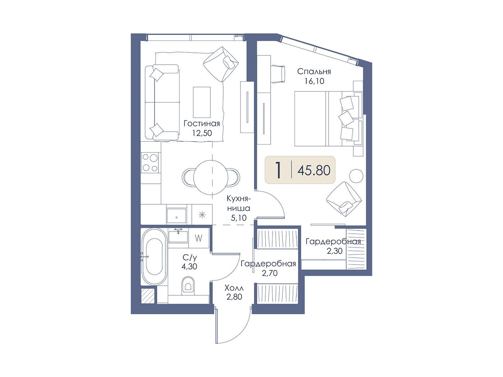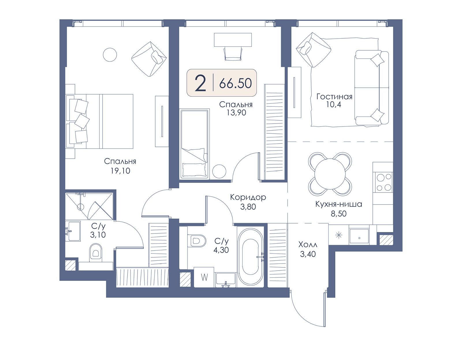 В комплексе предусмотрено 907 квартир площадью от 28,7 до 101,5 м². Представлены студии, одно-, двух- и трёхкомнатные квартиры, а также уникальные видовые форматы на последних этажах с увеличенной высотой потолков до 6,55 м. В типовых планировках высота потолков составляет 3,2 м. Среди особенностей — просторные видовые гостиные с панорамными окнами, разнесённые спальни, гардеробные и постирочные зоны; в многокомнатных квартирах предусмотрены раздельные санузлы. Есть нестандартные варианты, например однокомнатные квартиры с мастер‑спальней и гардеробной, а также лоты с угловым остеклением. Все квартиры сдаются без отделки.
