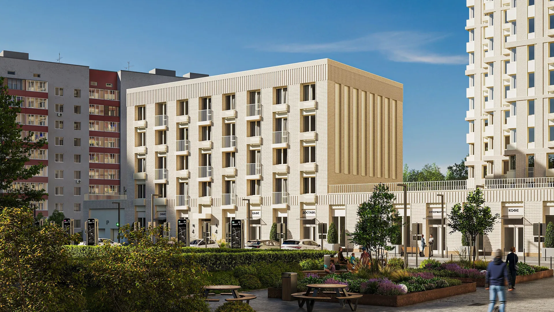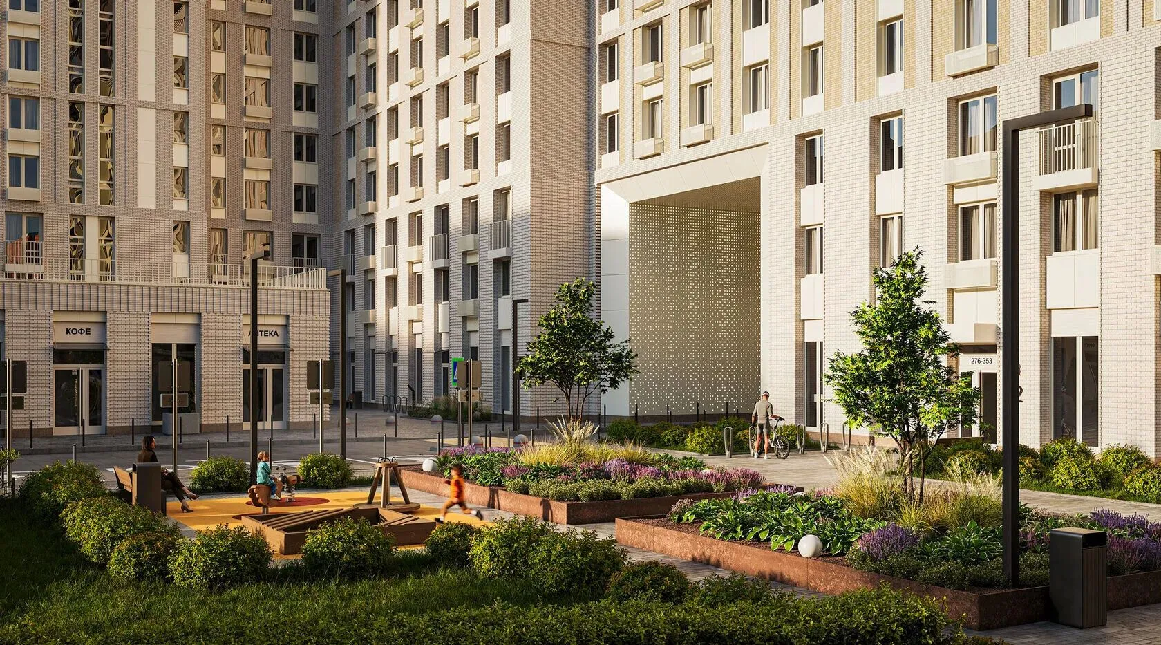 Благоустройство территории продумано с учётом комфорта жителей: со стороны улицы проложен прогулочный бульвар с декоративными кустарниками и деревьями, а во внутреннем дворе размещены детские и спортивные площадки, места для отдыха.