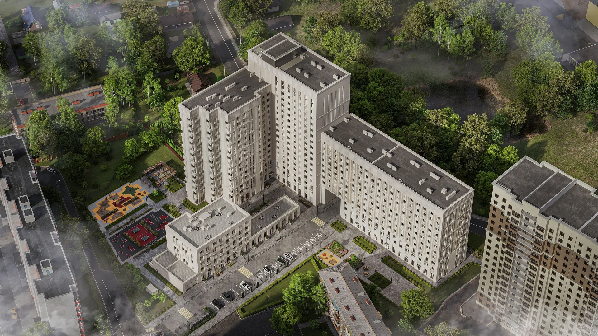 Для автовладельцев предусмотрен подземный паркинг на 100 машино‑мест, а также открытый плоскостной паркинг для гостей. На территории комплекса обустроены детские и спортивные площадки, зоны для тихого отдыха. На первых этажах разместятся коммерческие помещения — магазины, кафе, спортивные студии и салоны красоты. Входные группы оснащены зонами для консьержей и общими кладовыми для колясок. В домах установлено 16 лифтов турецкого производства.