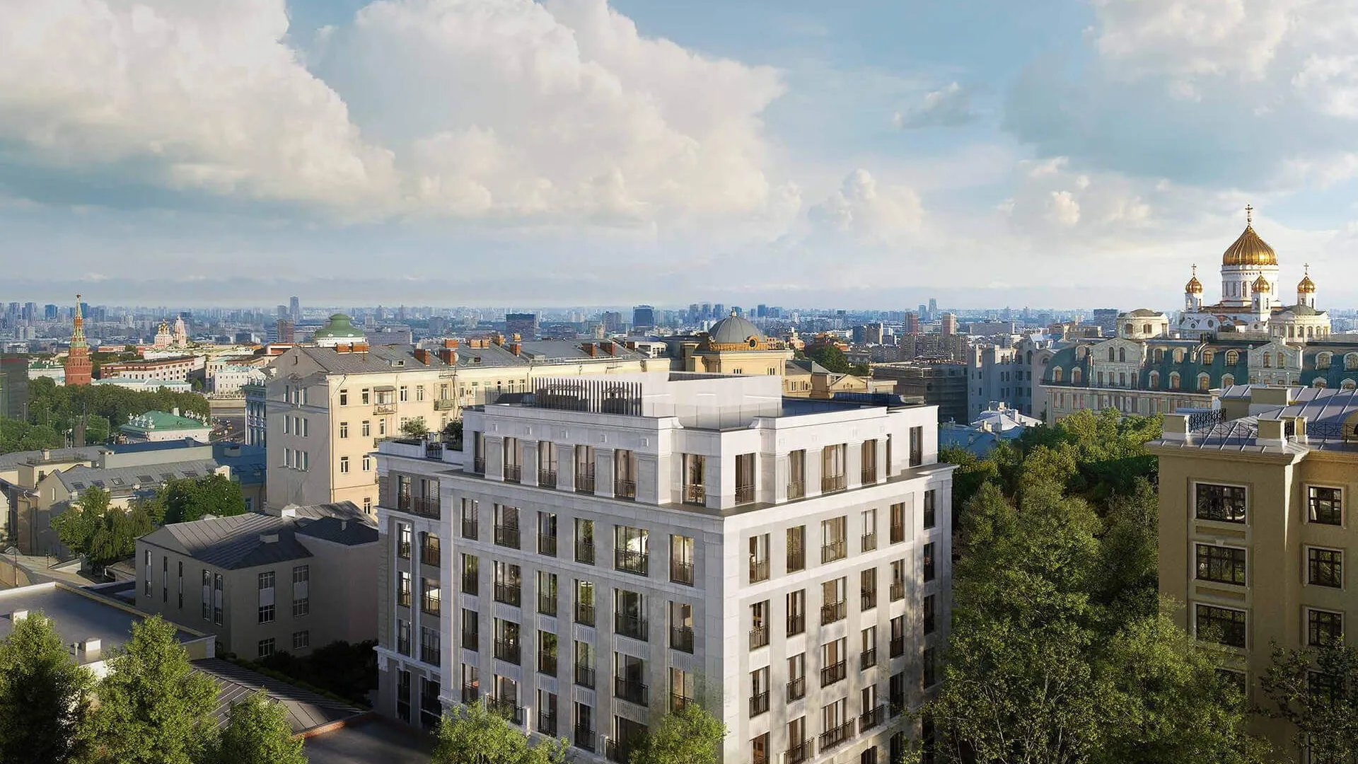 Архитектурная концепция разработана парижским бюро Paris Classical Architecture. Стиль здания сочетает элементы французского шато, московского модерна и ар‑деко. Фасады украшены молдингами, карнизами, натуральным камнем и деталями из патинированной бронзы. Входные группы и лобби оформлены с использованием натуральных материалов, дубовых панелей и бронзовой фурнитуры.